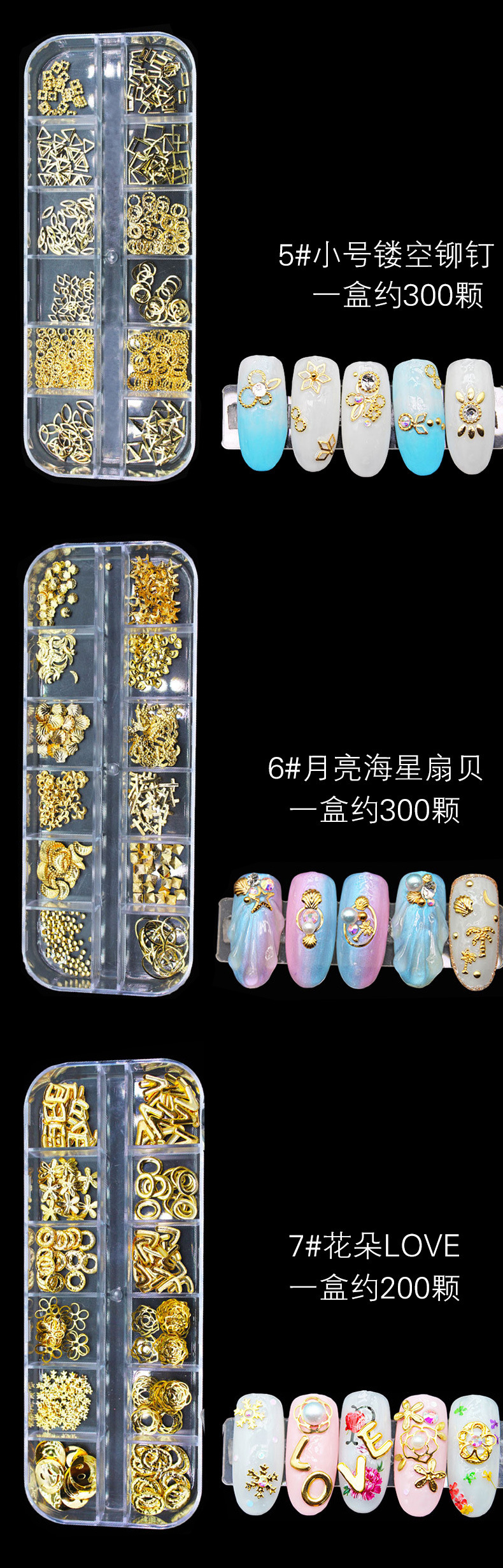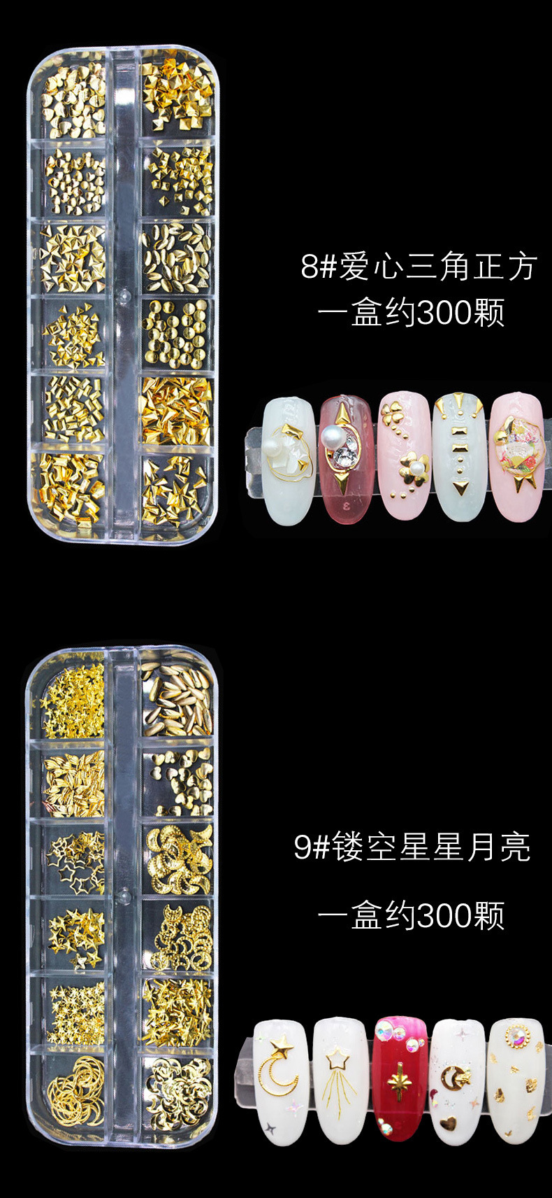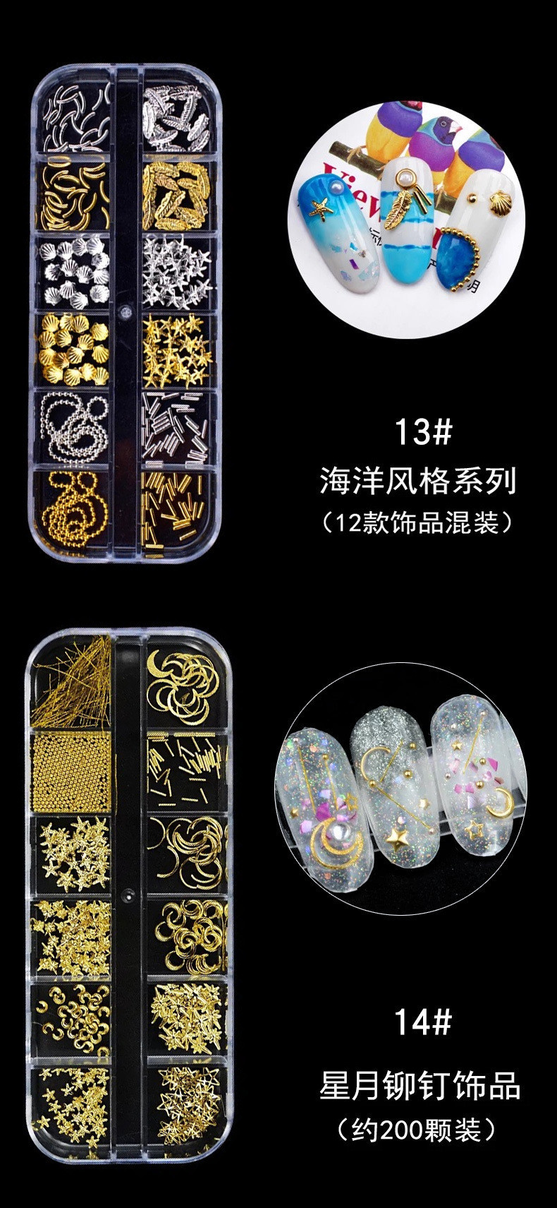 Accesorios de uñas 12 rejilla caja grande remache de uñas material de metal lentejuelas mezclar y combinar DIY especial en forma de parche de uñas Decoración