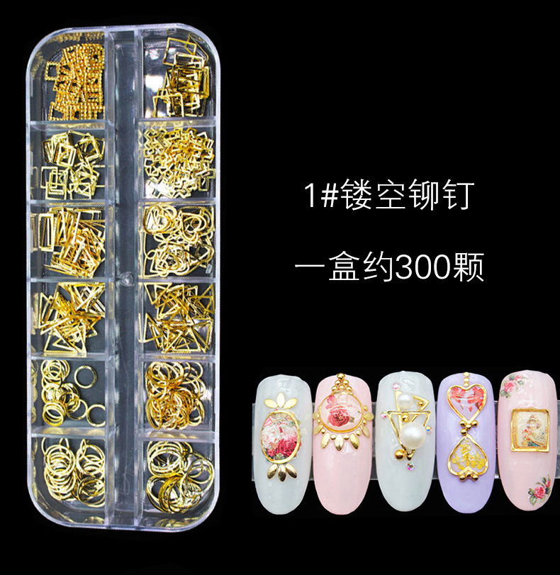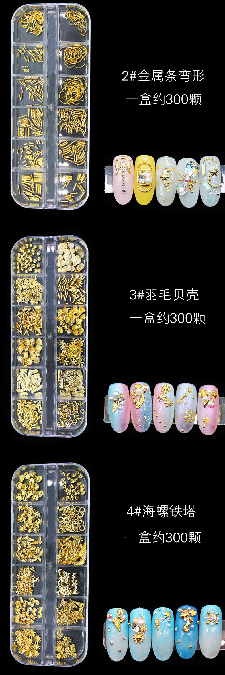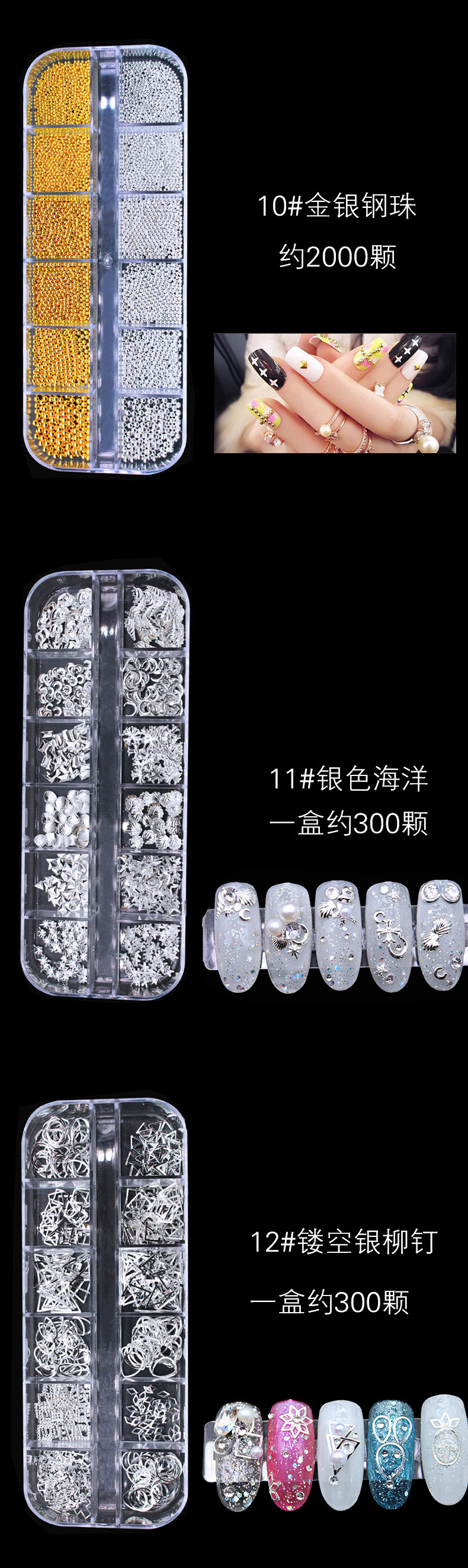 Accesorios de uñas 12 rejilla caja grande remache de uñas material de metal lentejuelas mezclar y combinar DIY especial en forma de parche de uñas Decoración