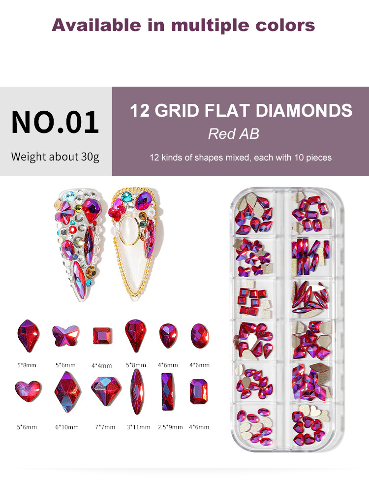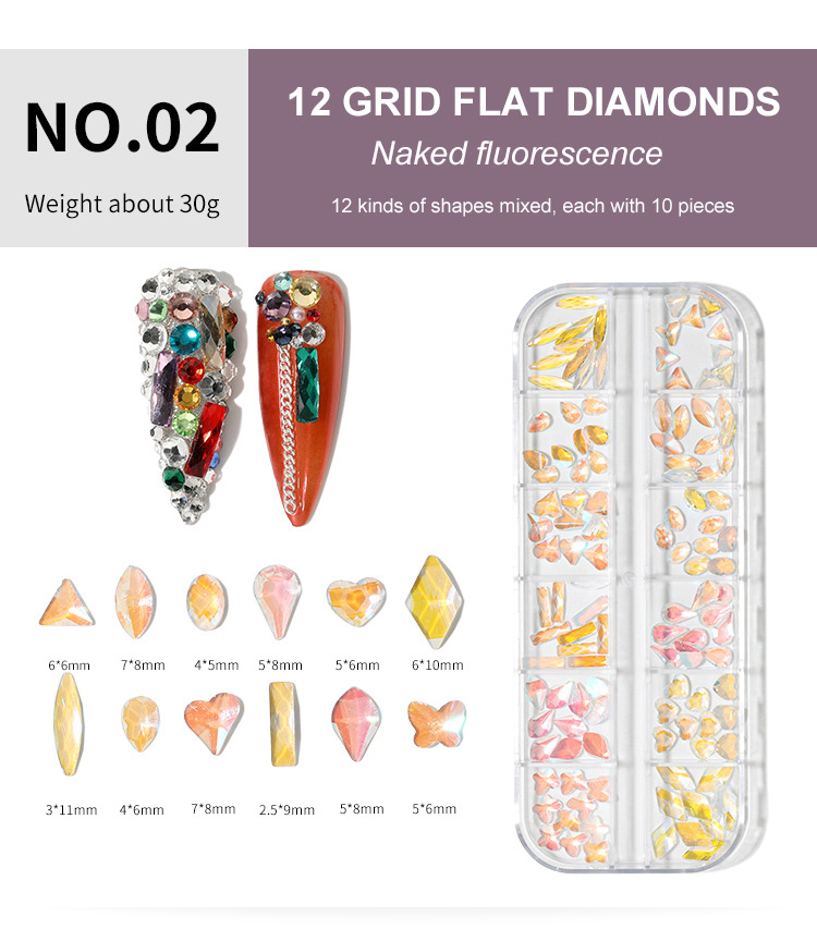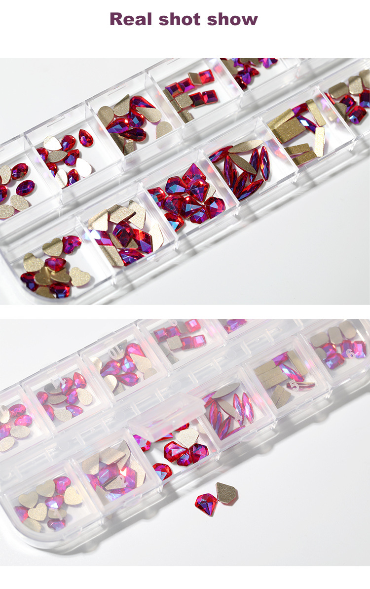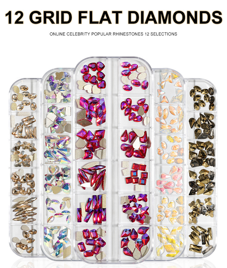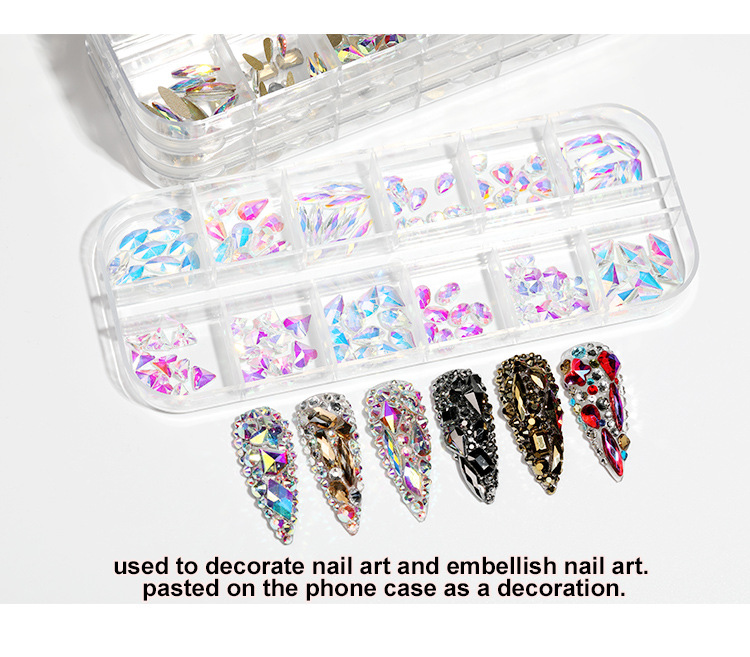 Joyería de uñas 12 rejilla mixta K9 plana en forma especial Temperatura de diamante Elf color mágico especial en forma de diamantes de imitación joyería de uñas al por mayor