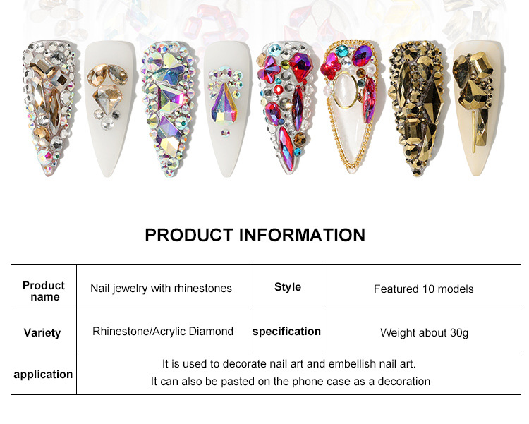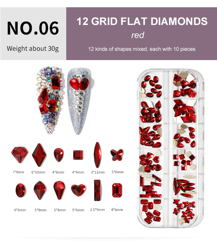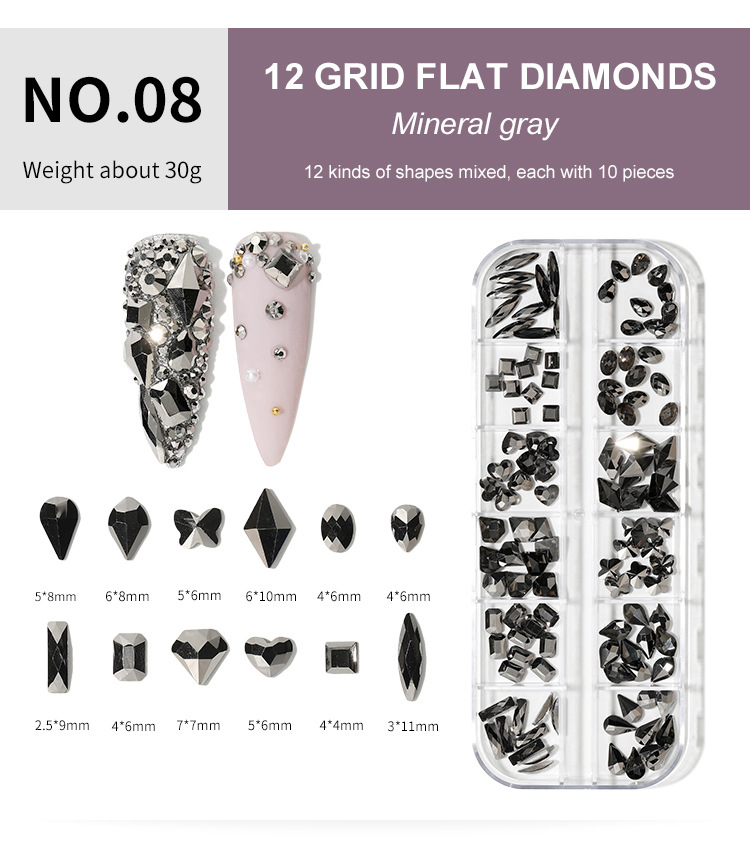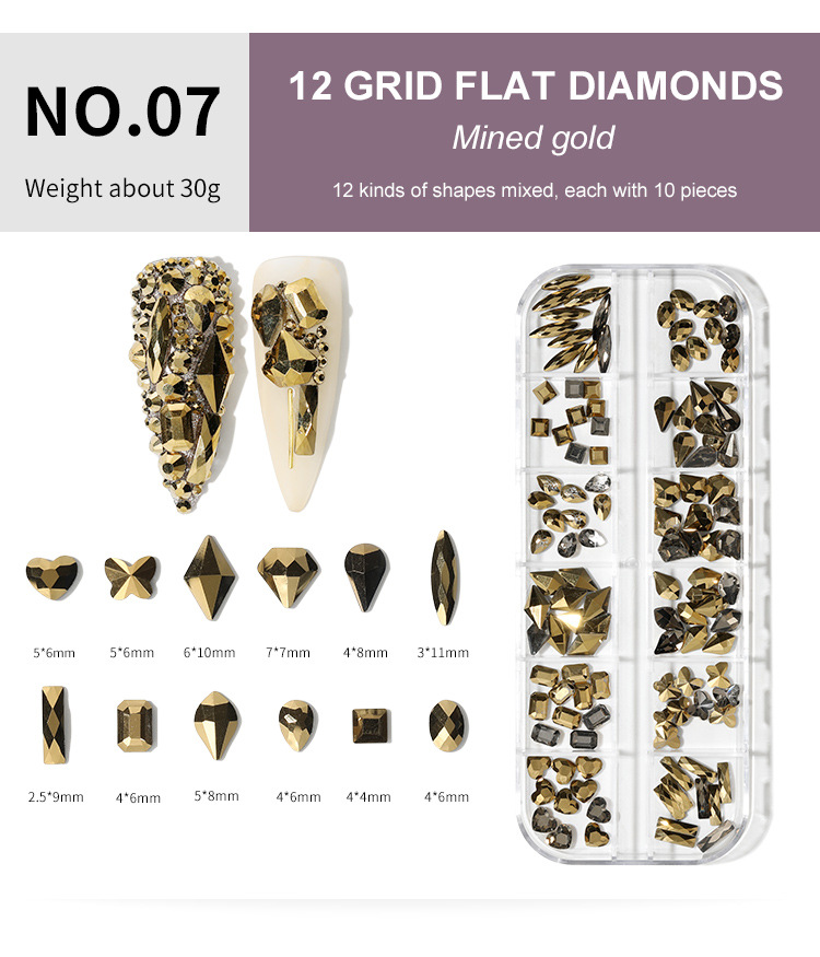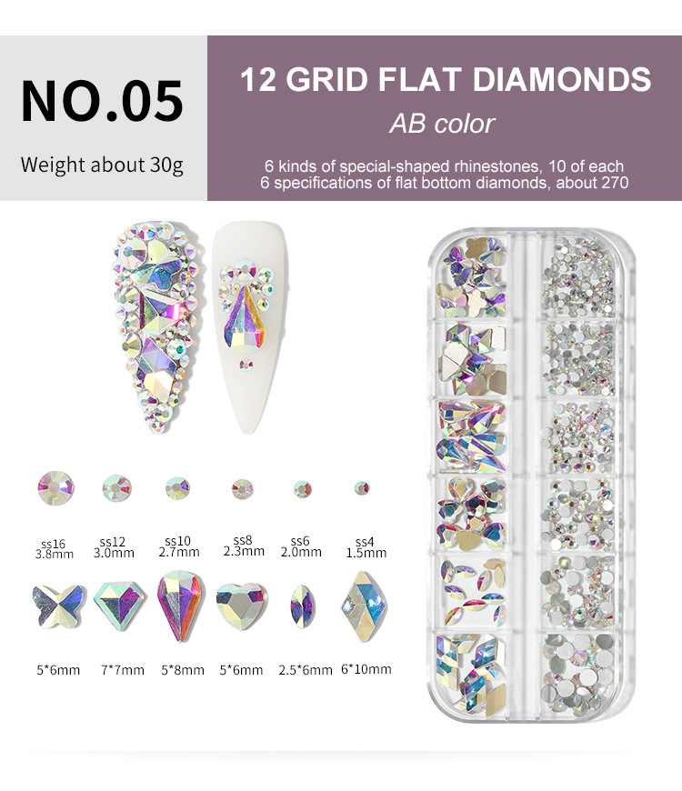 Joyería de uñas 12 rejilla mixta K9 plana en forma especial Temperatura de diamante Elf color mágico especial en forma de diamantes de imitación joyería de uñas al por mayor