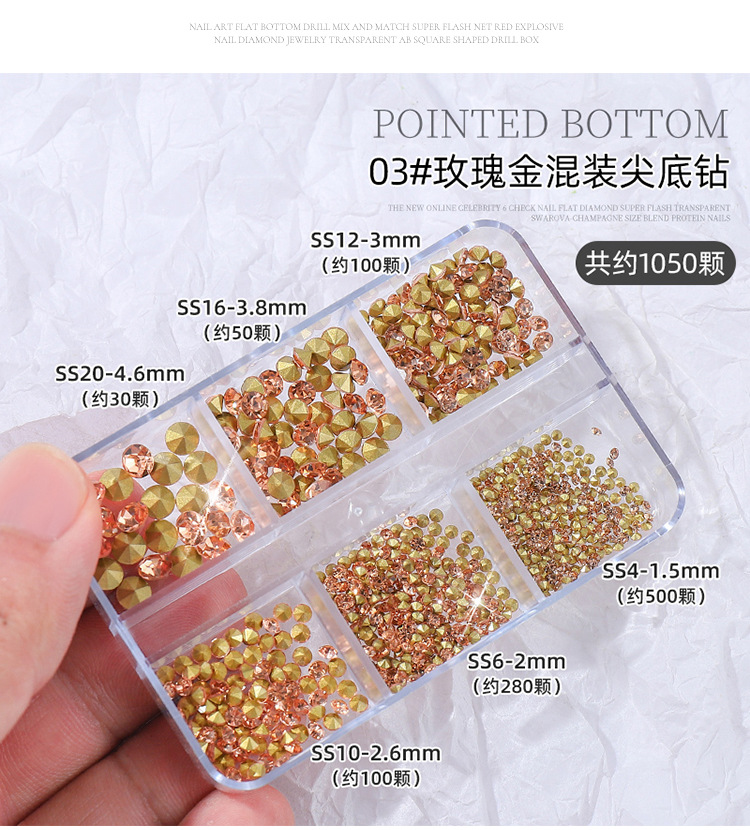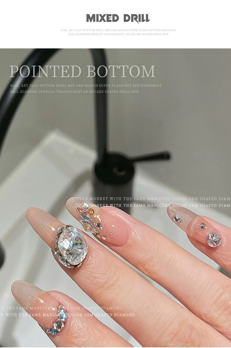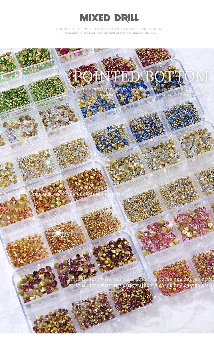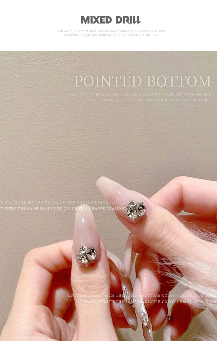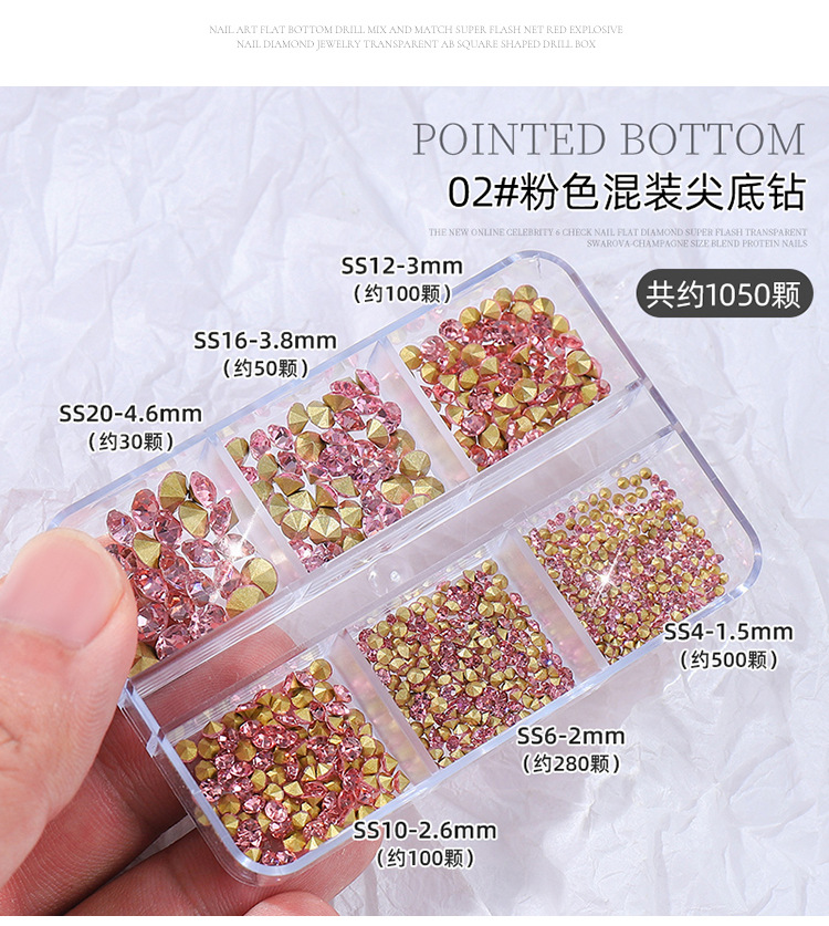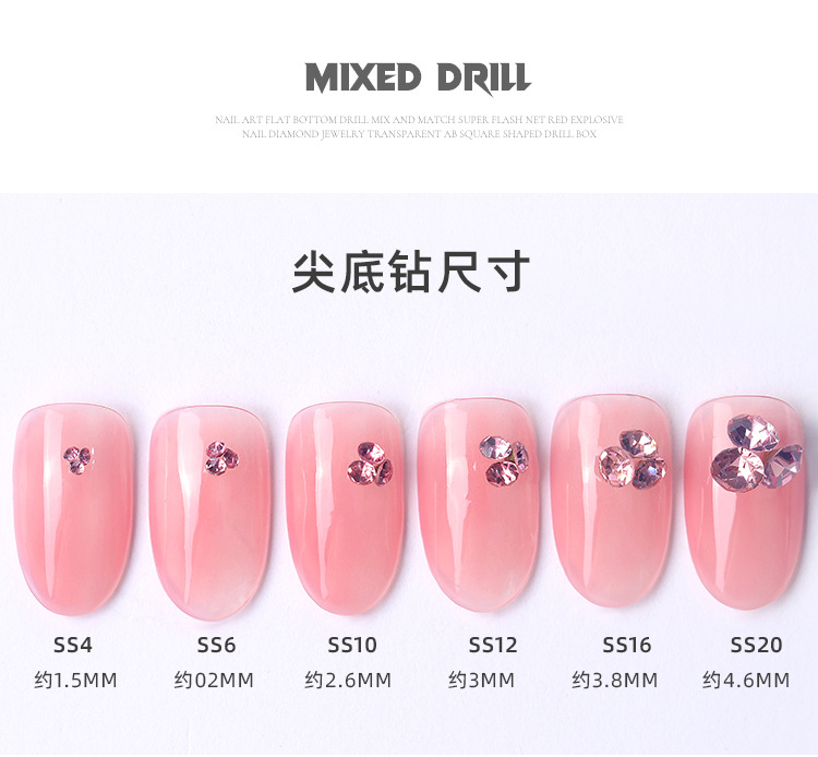K9 arte de uñas puntiagudo Diamante de fondo transparente Rosa champán color mágico tamaño mixto uñas arte joyería pila diamante mano completa taladro de uñas