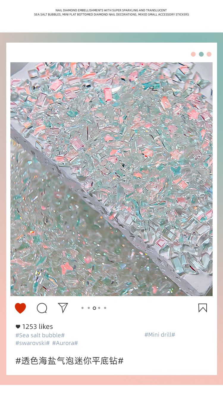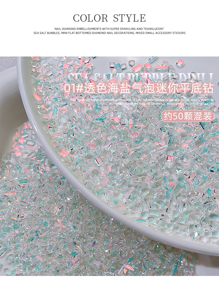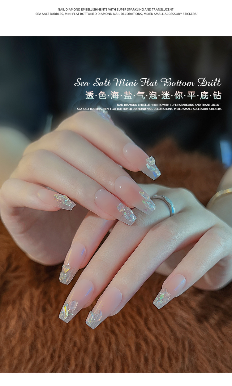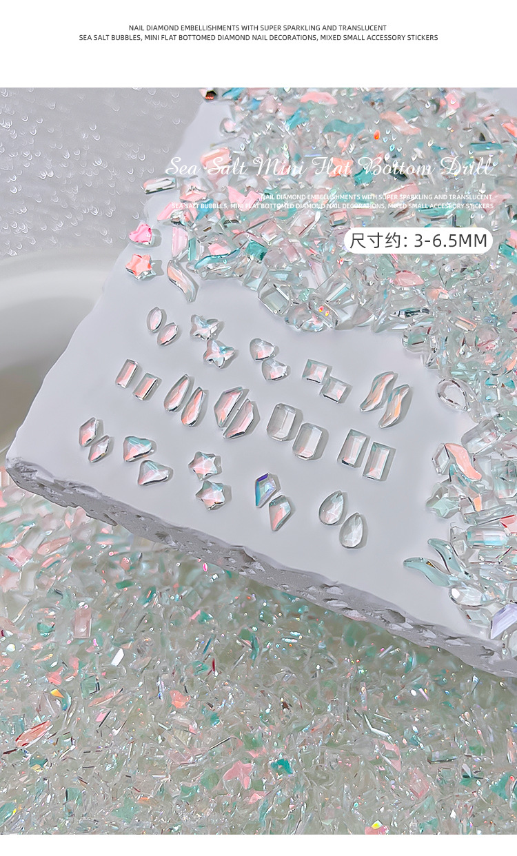 Popular en línea popular sal de mar burbuja arte de uñas diamante en forma especial tamaño pequeño color de fondo transparente Aurora mezclado joyería de uñas al por mayor
