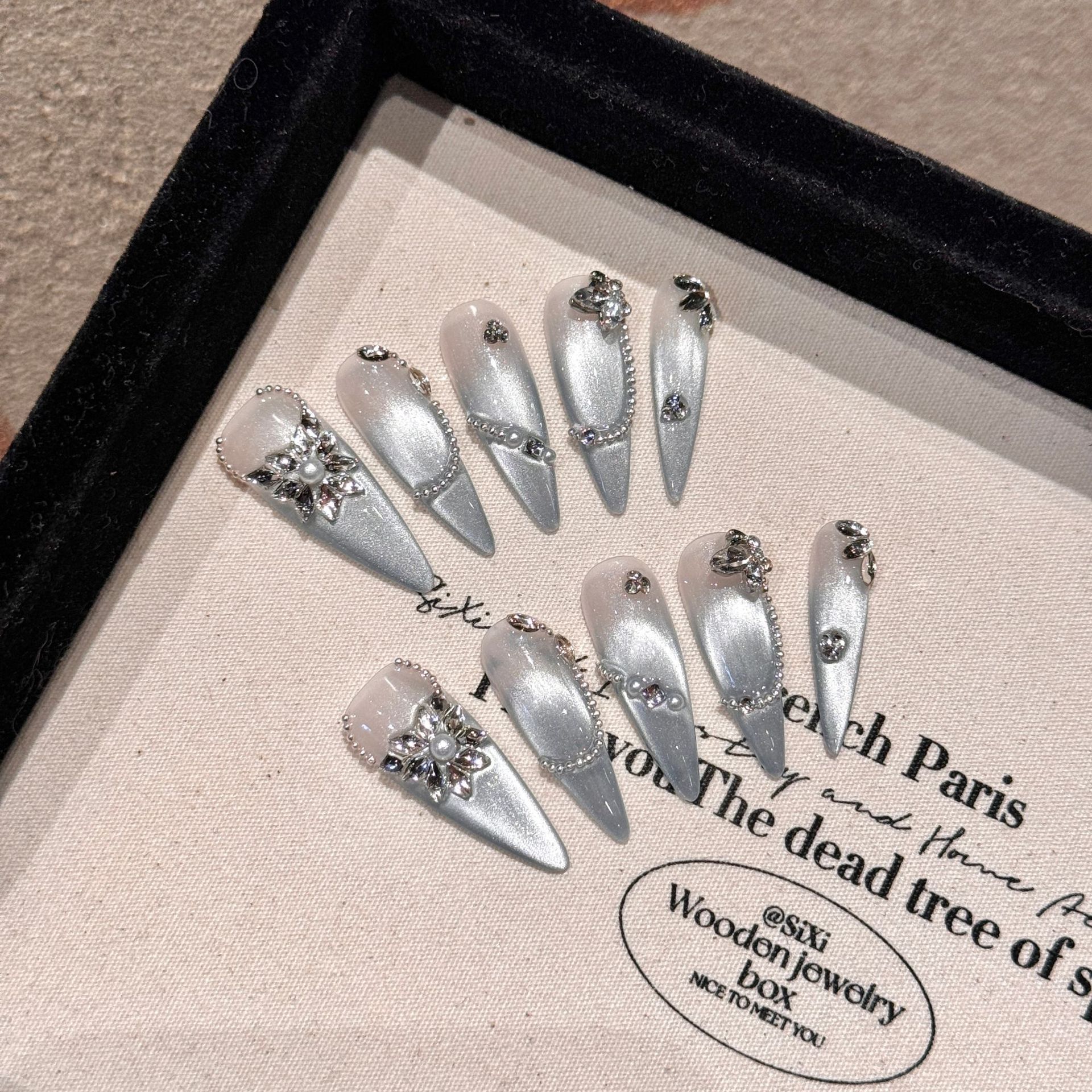 Armadura de vestir ojos de gato degradados plateados hechos a mano pura armadura de vestir hecha a mano clara y blanca