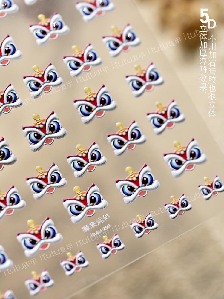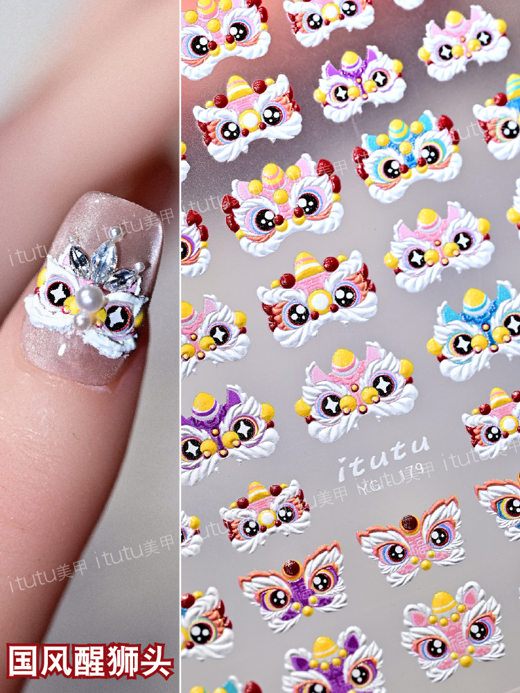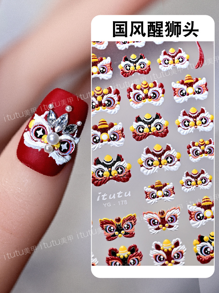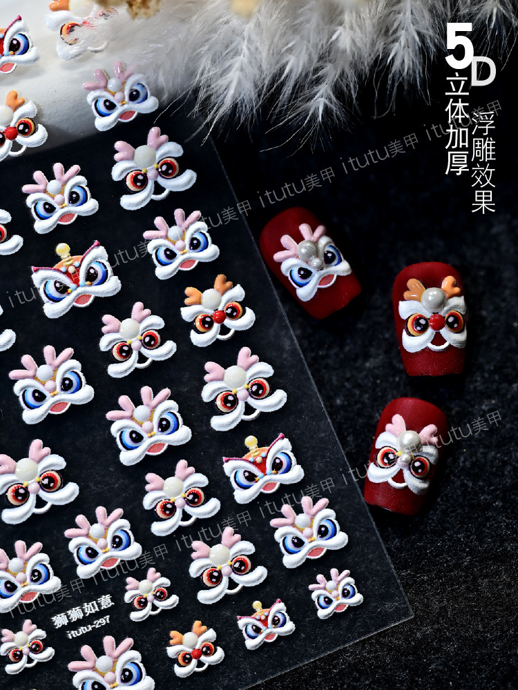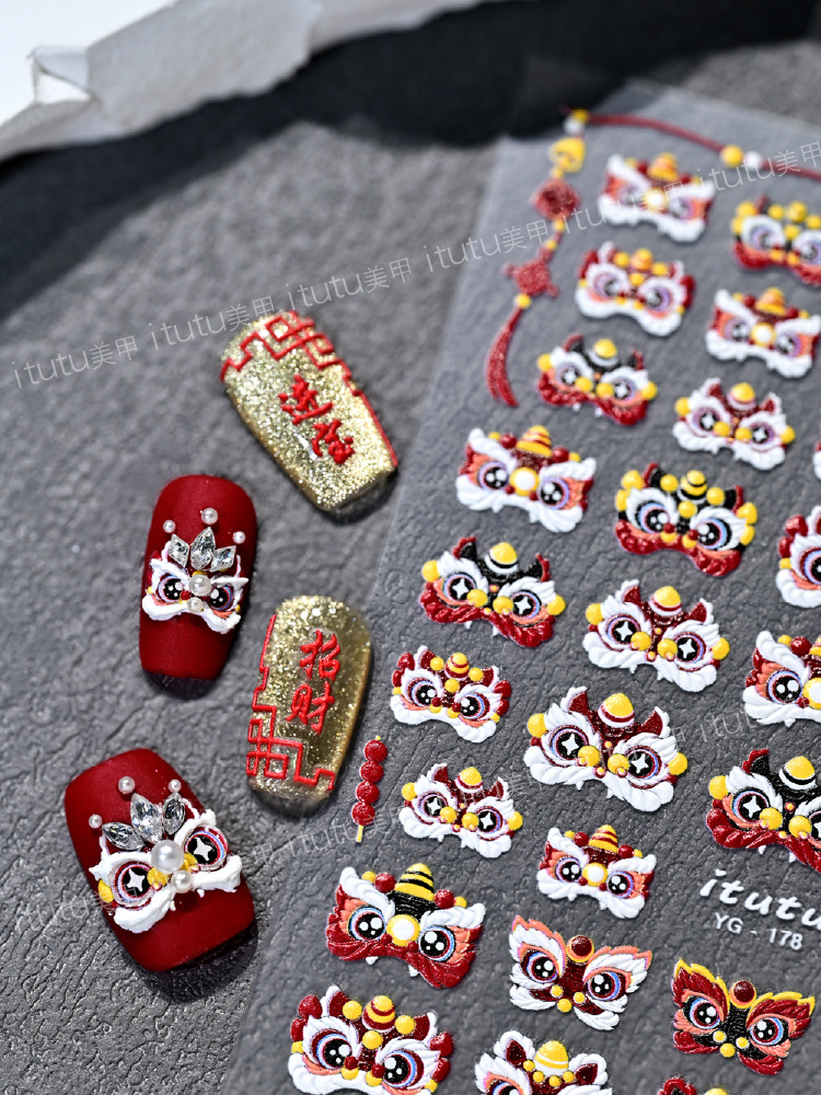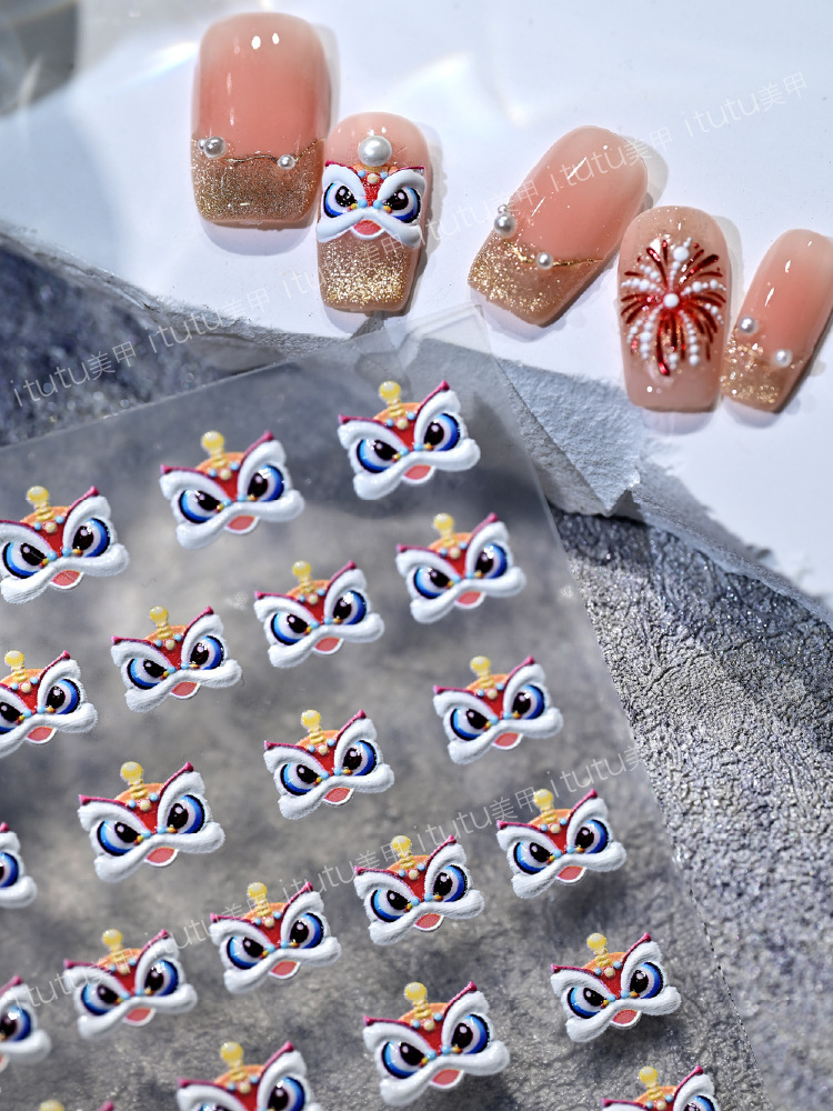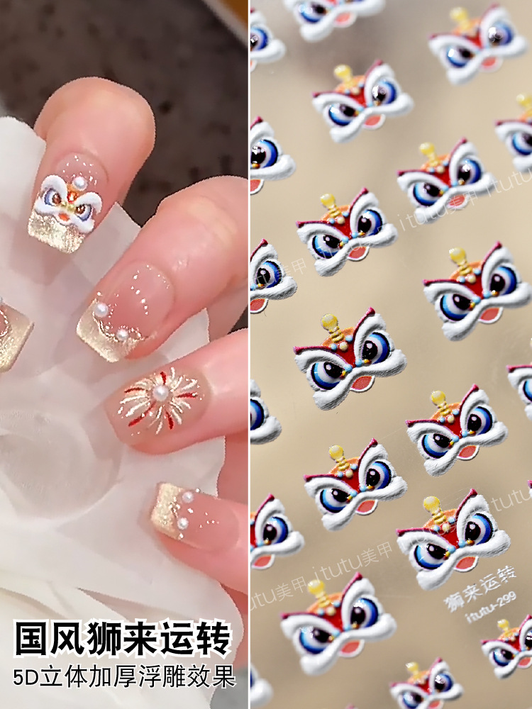 Nueva marea nacional auspiciosa despierta león manicuras estilo nacional encantador atraer la fortuna danza de león relieve del Festival de Primavera pegatinas de uñas al por mayor