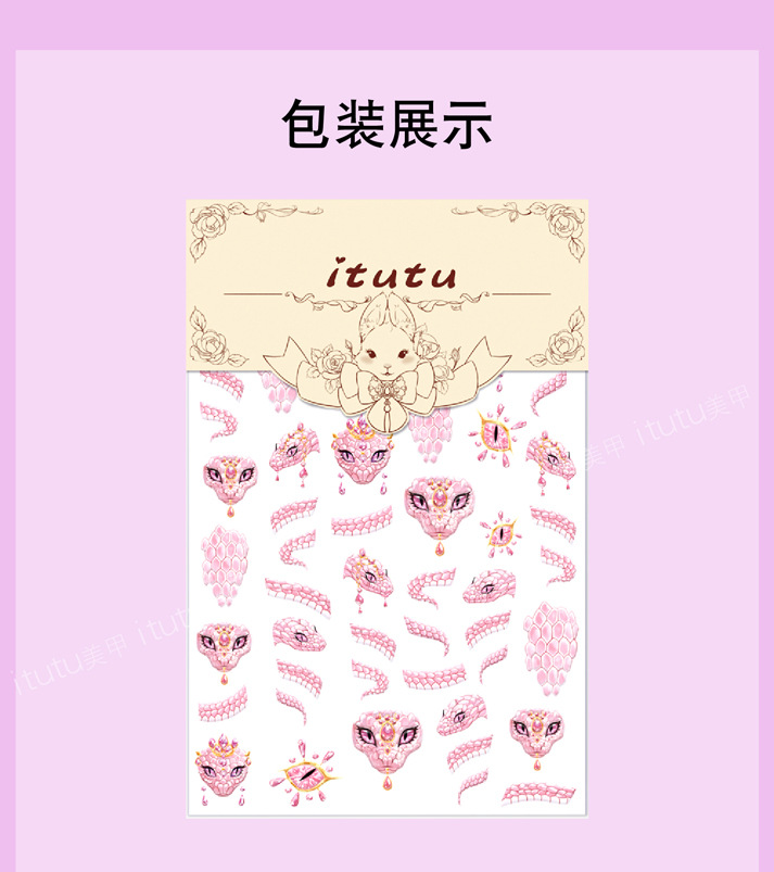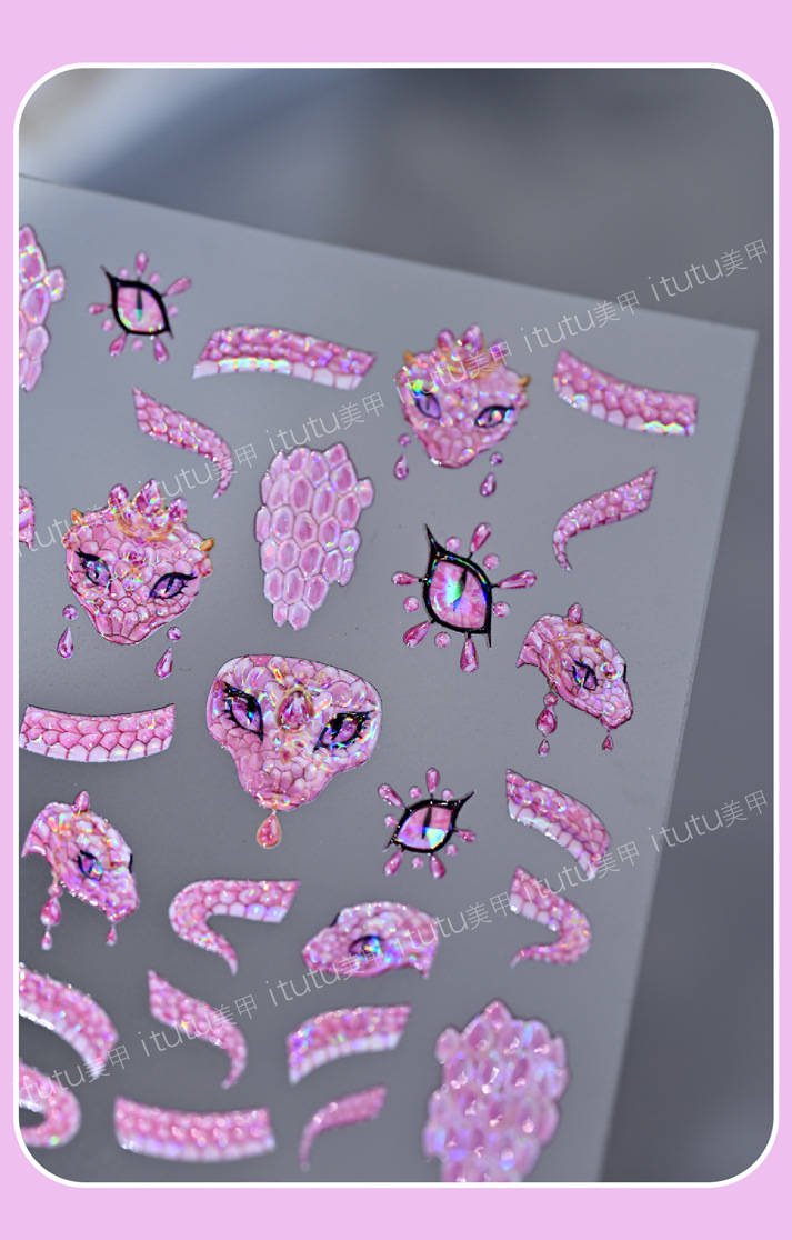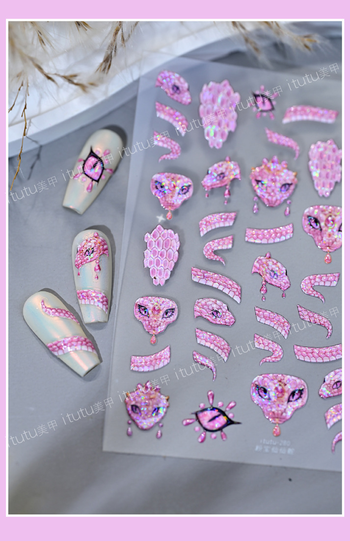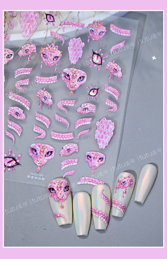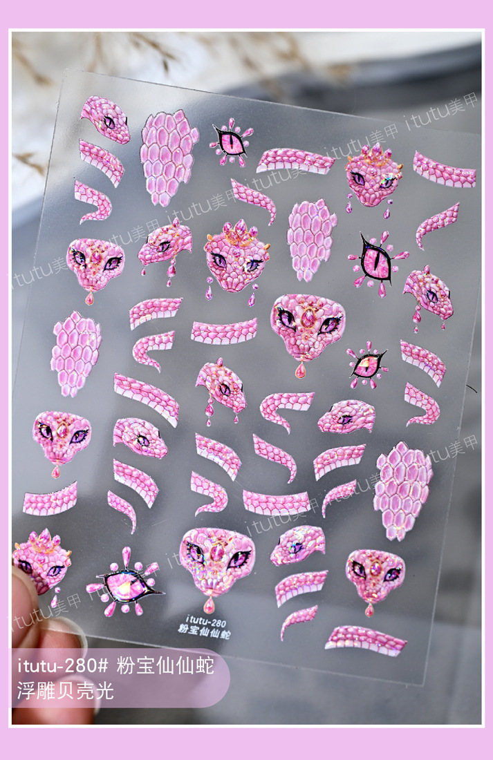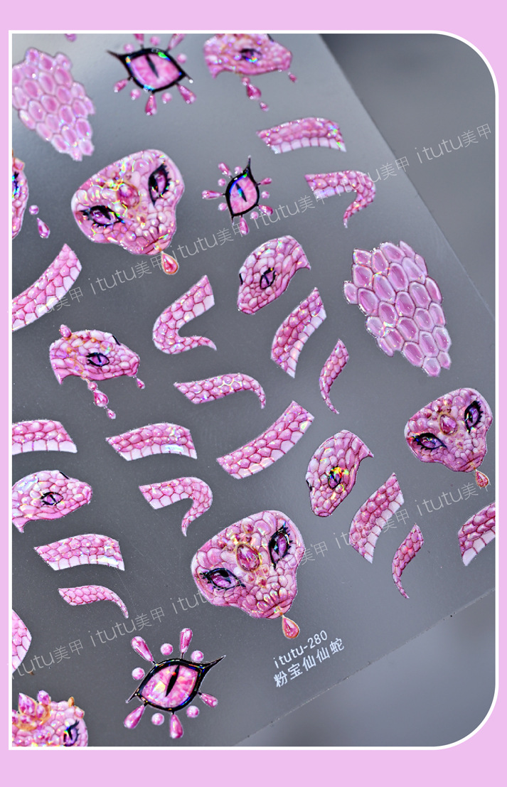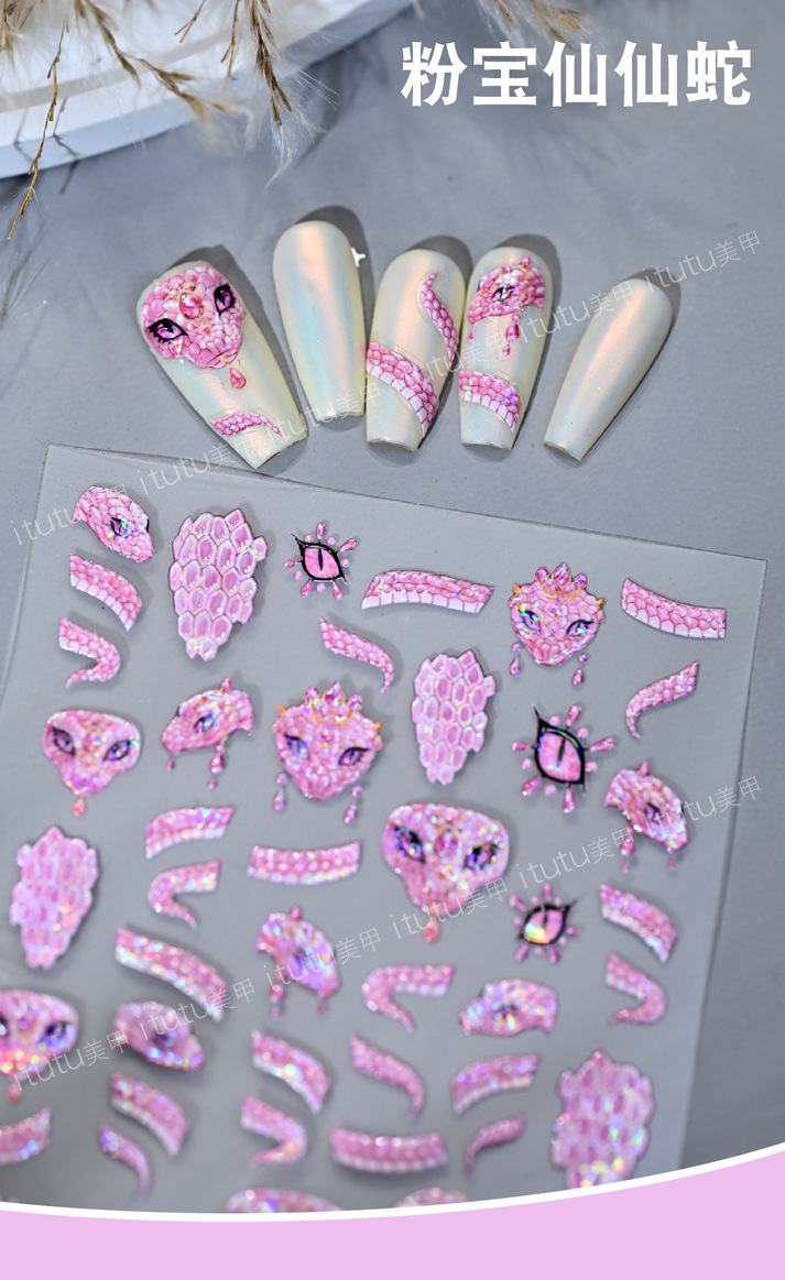 Nuevo polvo Bao Fairy Snake Shell Light Relief Stickers Pink Snake Back Stickers Pequeño patrón de uñas