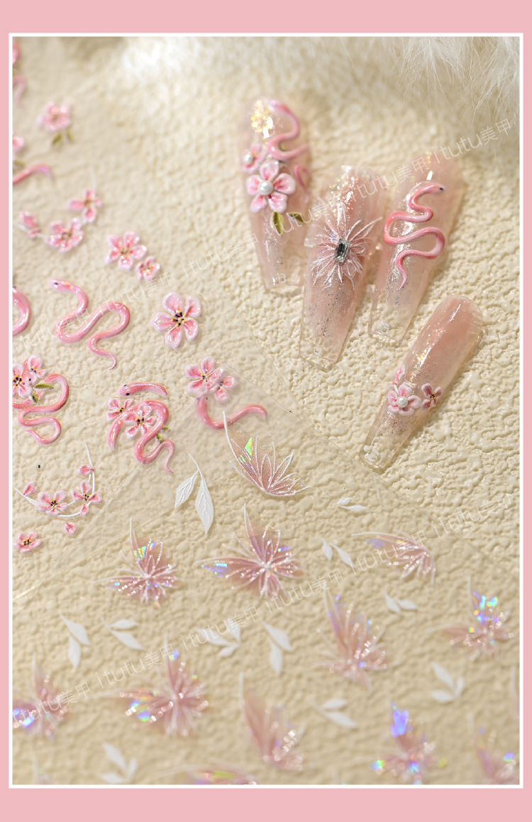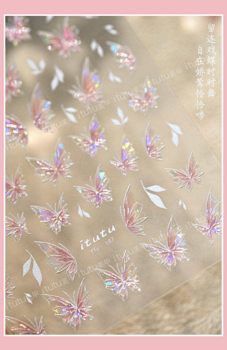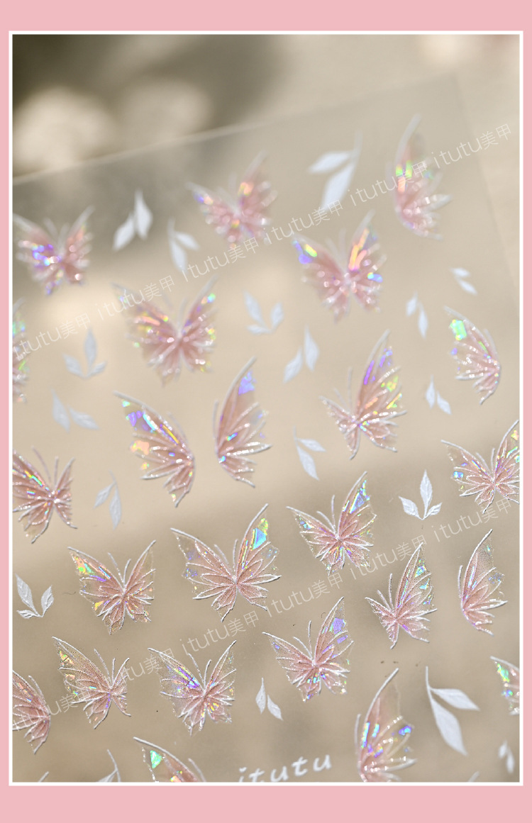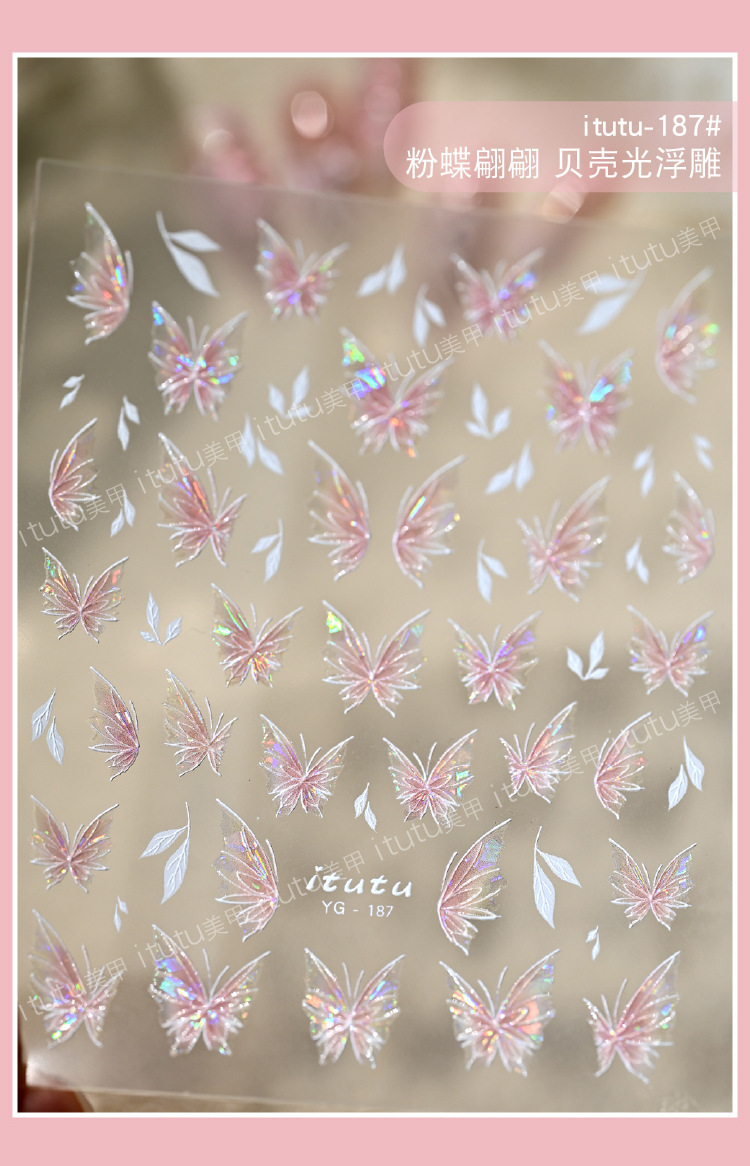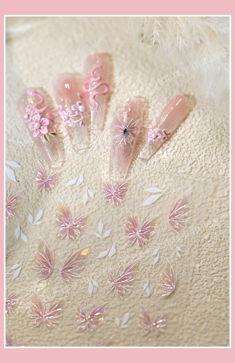 Nuevos pegatinas en relieve de manicuras de flores rosadas, mariposa de polvo, mariposa, concha, pequeño patrón de luz