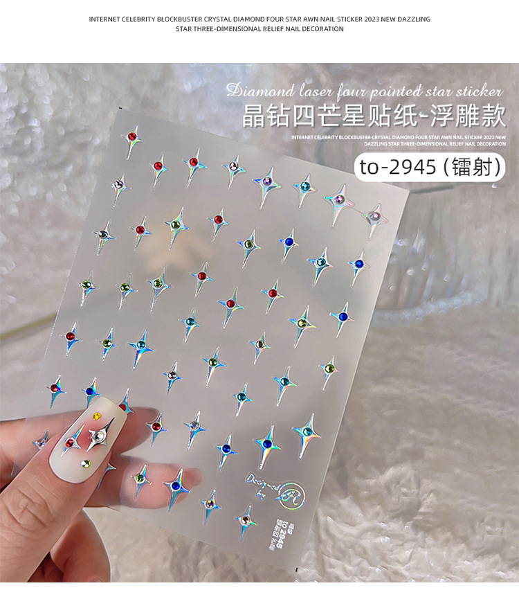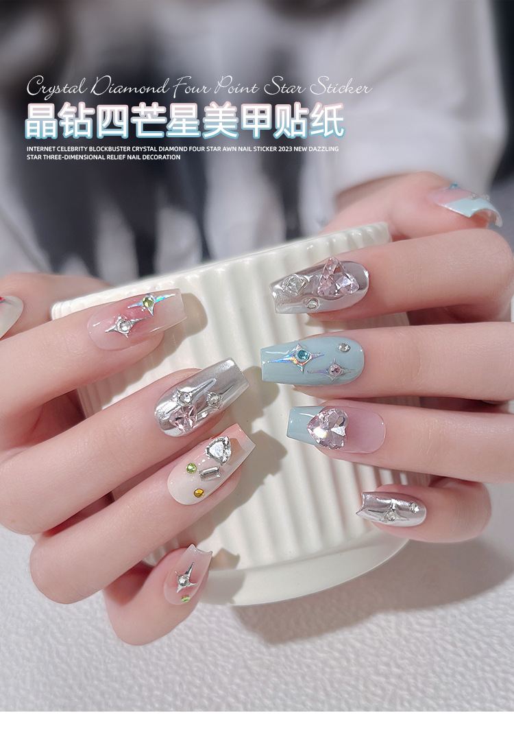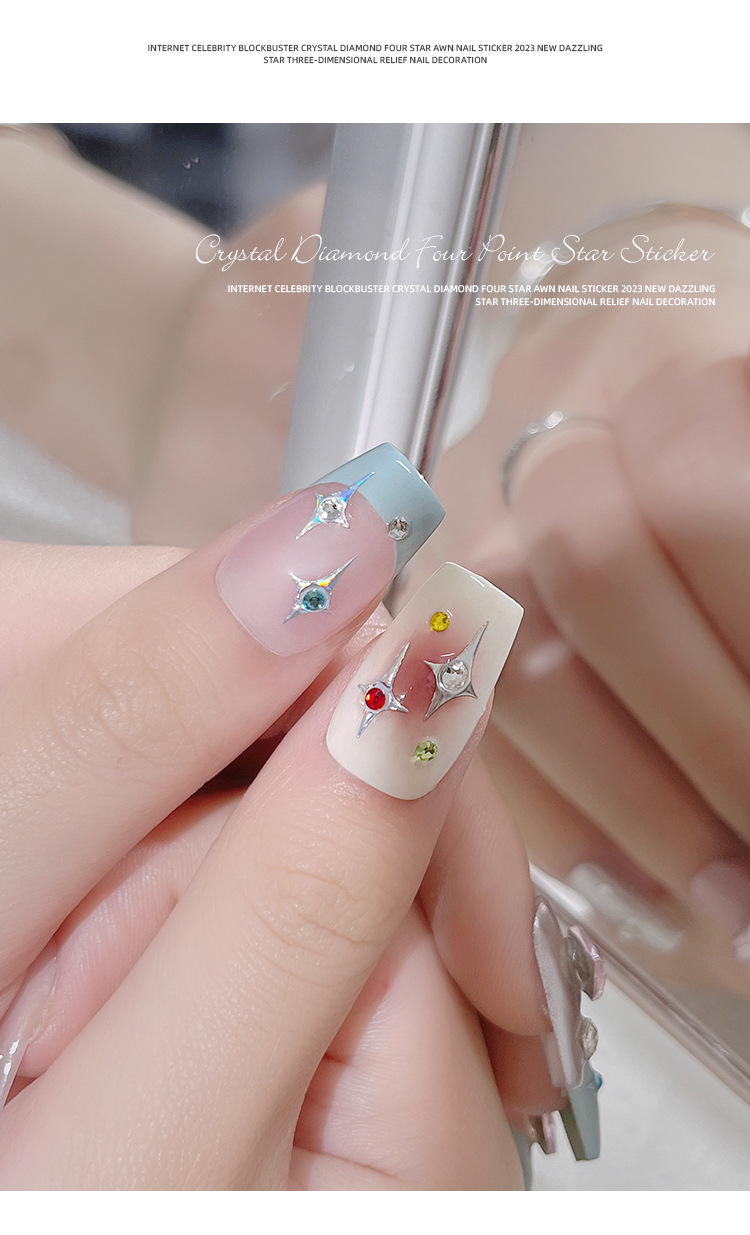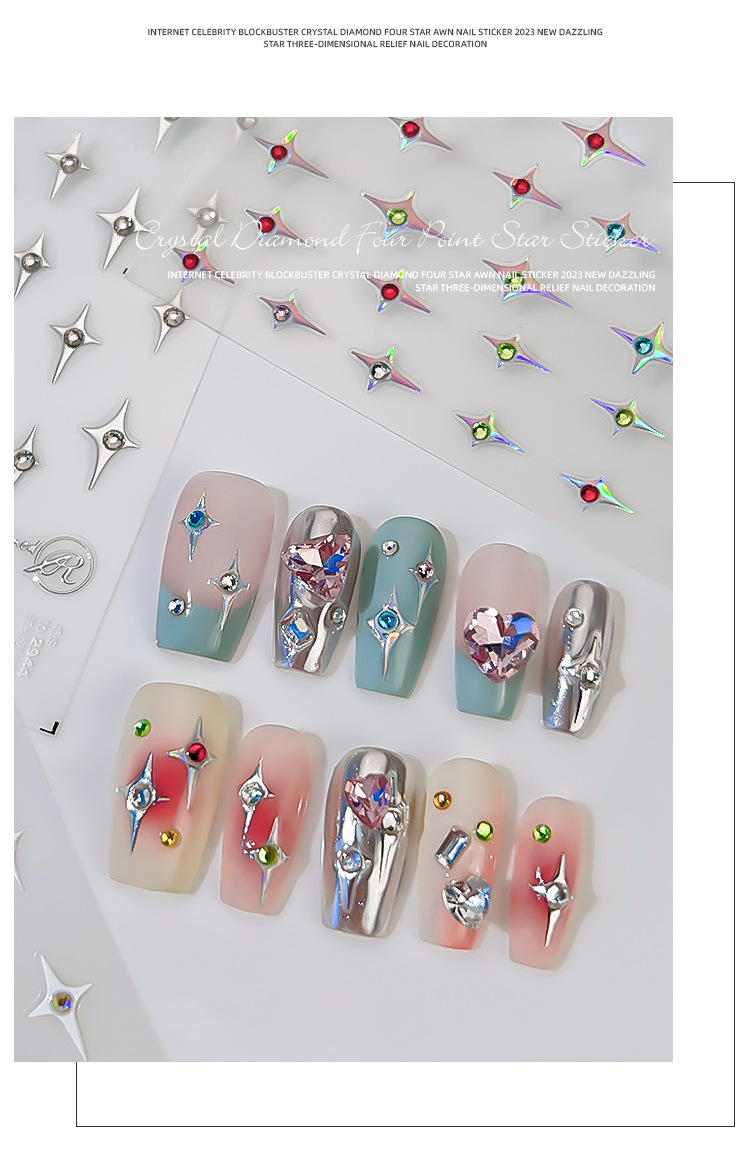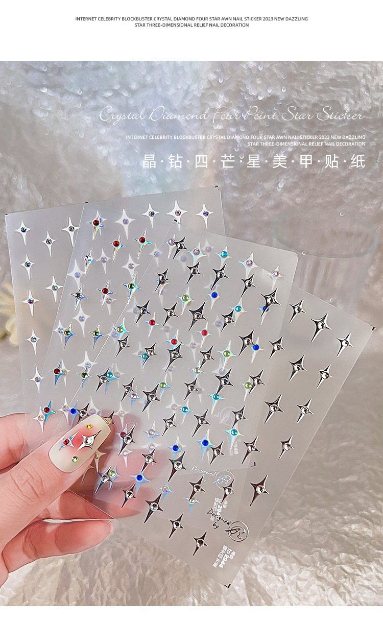 Adhesivos de Uñas con Cristales de Diamante, Diseño de Estrella de Cuatro Puntas, Metálicos, Láser, Iridiscentes, Tridimensionales, al por Mayor