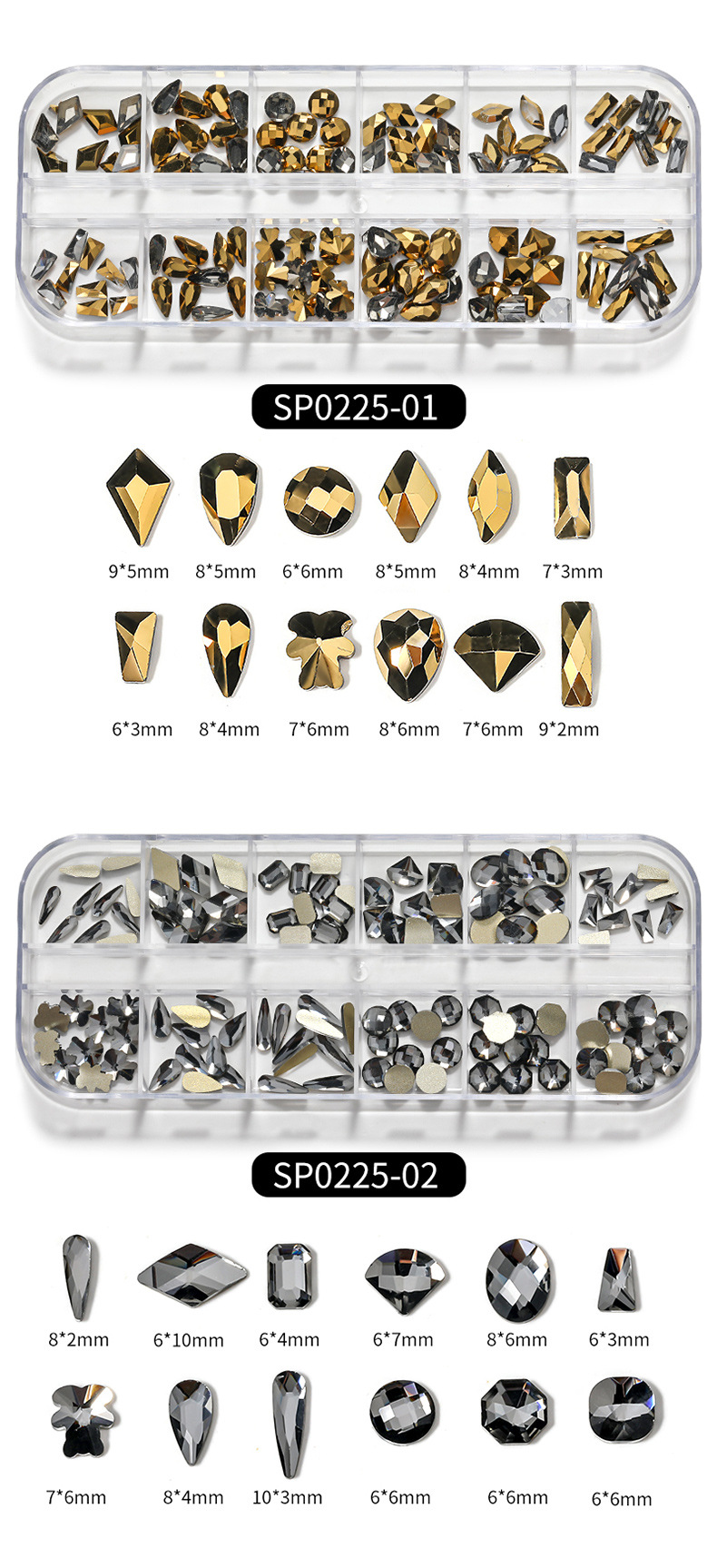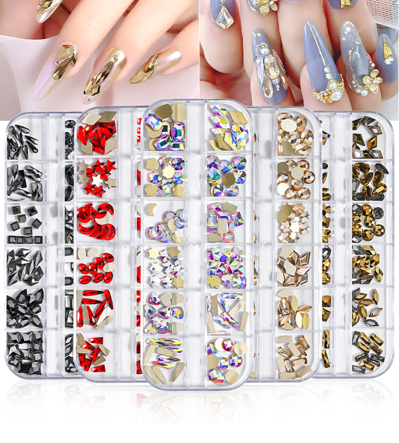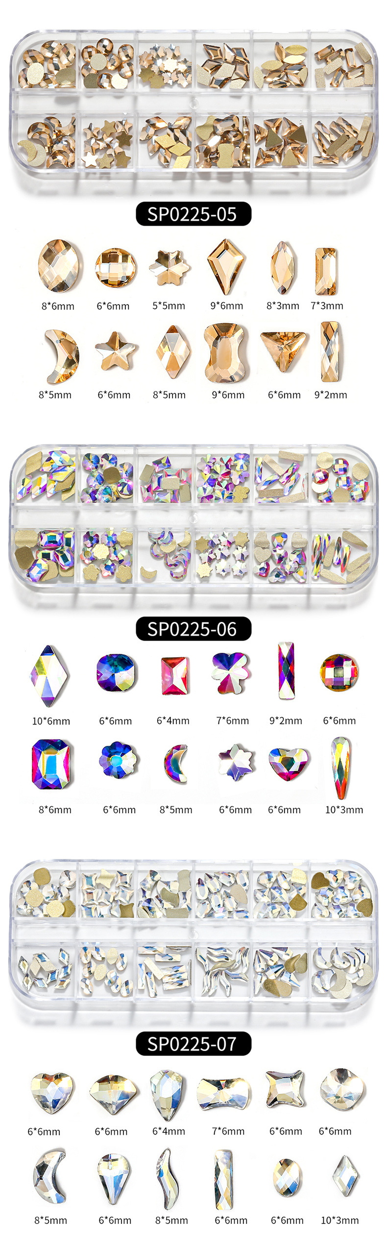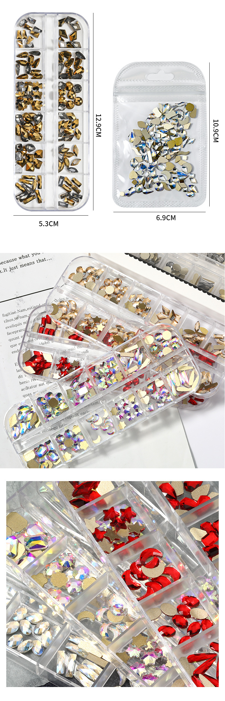 Accesorios de diamantes de uñas transfronterizos 12 traje de rejilla en caja plana de forma especial de diamantes de imitación de color de cristal de diamante pegatinas de joyería de uñas