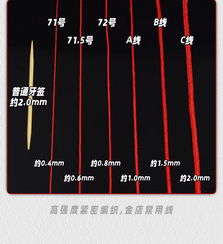 | Color | 编织木架(带夹子),5号线【100米】,5号线加金【30米】,6号线【红色】 1卷/满38包邮,7号线【70米】,71号玉线/红色/满38包邮,71号玉线/金黄/满38包邮,72号玉线【50米】,73号玉线【50米】,玉线A【30米】,C号玉线【20米】,D号玉线【15米】,6股线【350米】,大卷高档锦纶股线红色 3股,大卷高档锦纶股线红色 6股,大卷高档锦纶股线红色 9股,大卷高档锦纶股线红色 12股,大卷高档锦纶股线红色 15股,12股线【260米】,网络绳1.0【50米】,网络绳1.5mm【60米】,网络绳2.0mm【50米】,金线3mm【240米】,金线6mm【130米】,金线9mm【100米】,银线3mm【240米】,银线6mm【130米】,银线9mm【100米】,精品金线3股(线径0.2mm/长约100米),精品金线6股(线径0.4mm/长约50米),精品金线9股(线径0.6mm/长约35米),精品金线12股(线径0.8mm/长约25米),精品金线15股(线径1.0mm/长约15米),韩国5号线/捆【红】满38包邮,韩国5号线/捆【金黄】满38包邮,72号加金玉线线径0.8mm红色60m【盒装】,5号线-黄色/满38包邮,金店同款72号玉线彩色加金线径0.8mm 50米/卷,大卷18股手搓棉线【红色】,大卷18股手搓棉线【金黄】,手搓棉线0.8【红色】满38包邮,手搓棉线1.0【红色】满38包邮,手搓棉线1.2【红色】满38包邮,手搓棉线1.5【红色】满38包邮,小卷24股手搓棉线/满38包邮,小卷18股手搓棉线/满38包邮,曼波线盒装1.0【红色】满38包邮,曼波线盒装1.5【红色】满38包邮,曼波线盒装1.8【红色】满38包邮,盒装82号线0.8mm/满38包邮,盒装80号线1.5mm/满38包邮,中国结8号线-红色45米/满38包邮,盒装6号线/满38包邮,盒装73号线/满38包邮,盒装A号线/满38包邮,盒装B号线/满38包邮,盒装C号线/满38包邮,盒装D号线/满38包邮,曼波线卷装1.0【红色】满38包邮,曼波线卷装1.5【红色】满38包邮,曼波线卷装1.8【红色】满38包邮,曼波线卷装1.5【金黄】满38包邮,曼波线卷装1.8【金黄】满38包邮,韩国5号线卷100码【金黄】,高档锦纶股线红色 12股,高档锦纶股线红色 3股,高档锦纶股线红色6股,高档锦纶股线红色9股,高档锦纶股线金黄色 12股,高档锦纶股线金黄色 3股,高档锦纶股线金黄色 6股,高档锦纶股线金黄色9股,盒装锦纶股线/红色12股/满38包邮,盒装锦纶股线/红色3股/满38包邮,盒装锦纶股线/红色6股/满38包邮,盒装锦纶股线/红色9股/满38包邮,盒装锦纶股线/红色15股/满38包邮,小卷高强股线 红色12股/满38包邮,小卷高强股线 红色15股/满38包邮,小卷高强股线 红色3股/满38包邮,小卷高强股线 红色6股/满38包邮,小卷高强股线 红色9股 |