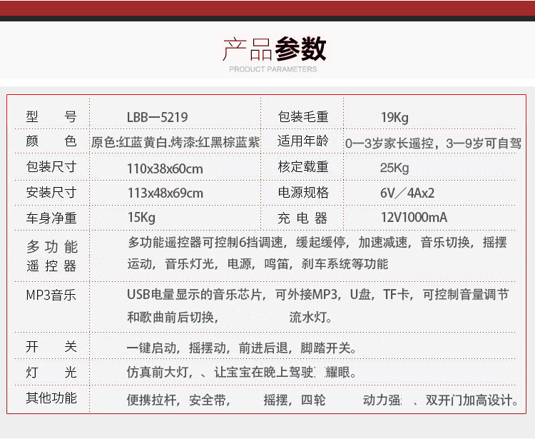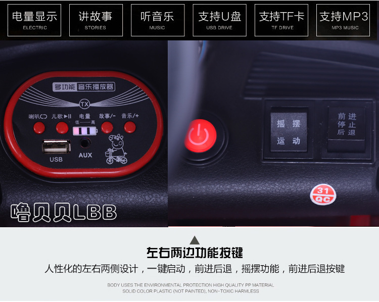 | Color | Doble unidad roja + Educación Temprana + control remoto multifunción + varilla de tracción + teléfono móvil Bluetooth,Blanco doble unidad + Educación Temprana + multi-función Control Remoto + varilla de tracción + teléfono móvil Bluetooth,Doble unidad roja + función completa + teléfono móvil Bluetooth + asiento de cuero,Blanco doble unidad + función completa + teléfono móvil Bluetooth + asiento de cuero,Pintura vino rojo doble unidad + función completa + teléfono móvil Bluetooth,Pintura negro doble unidad + función completa + teléfono móvil Bluetooth,Pintura azul real doble unidad + función completa + teléfono móvil Bluetooth,Pintura roja + doble unidad + función completa + teléfono móvil Bluetooth + asiento de cuero,Pintura azul + doble unidad + función completa + teléfono móvil Bluetooth + asiento de cuero,Batería grande de 12V + pintura roja con tracción a las cuatro ruedas + función completa + teléfono móvil Bluetooth + asiento de cuero,12V Batería grande + pintura negro cuatro ruedas de tracción + función completa + teléfono móvil Bluetooth + asiento de cuero,Batería grande de 12V + pintura azul tracción a las cuatro ruedas + función completa + teléfono móvil Bluetooth + asiento de cuero,12V Batería grande + azul cielo + función completa |