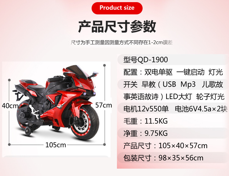 | Color | Estándar Rojo + pedal acelerador + ruedas sin luz,Azul estándar + Acelerador de pedal + ruedas sin luz,Estándar Blanco + pedal acelerador + ruedas sin luz,Medio con rojo brillante + mango de mano acelerador + luz de la rueda,Cielo azul + mano mango acelerador + rueda Luz,Con blanco + mano giro acelerador + luz de la rueda,De gama alta de vino rojo + mano mango del acelerador + luz de la rueda,De gama alta azul pintura + mano mango del acelerador + luz de la rueda,Top con pintura vino rojo + actualización colorida luz de la cabeza del coche + manija de la vuelta + luz de la rueda + batería de 12V + Bluetooth,Top con pintura gris + actualización colorida luz de la cabeza del coche + manija de la vuelta + luz de la rueda + batería de 12V + Bluetooth |