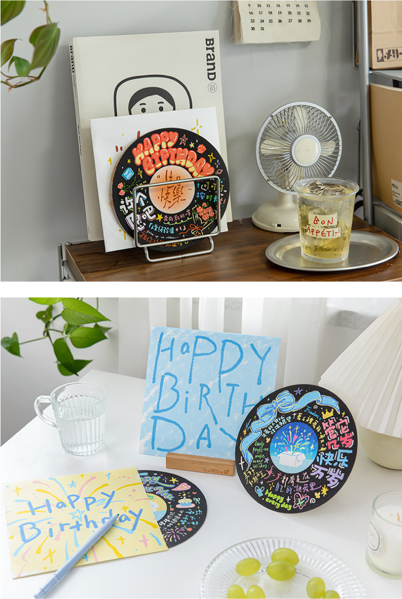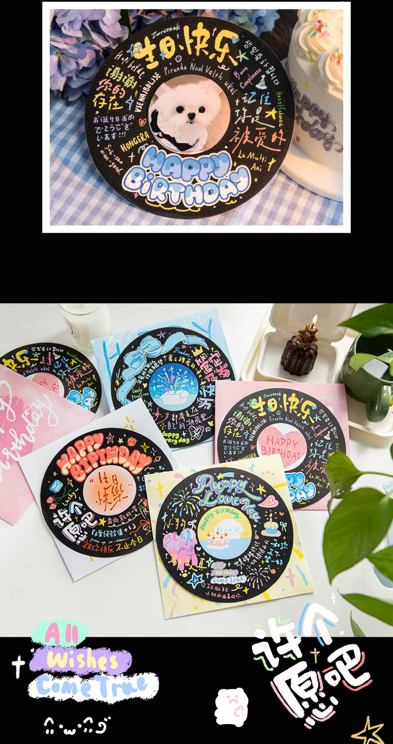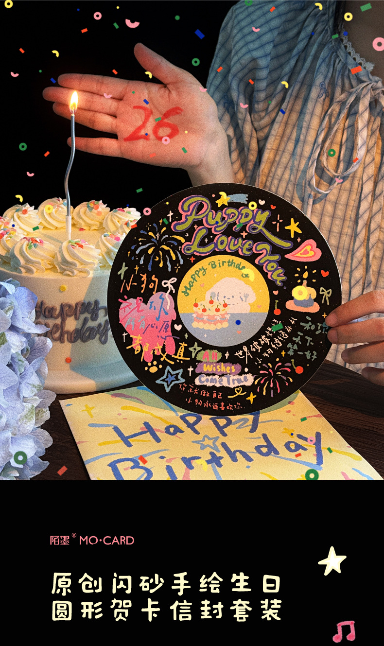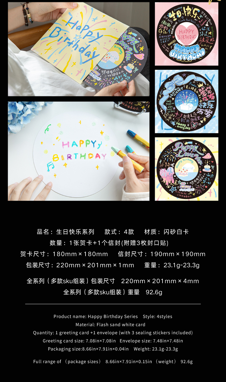 Mo Mo Flash Sand Tarjeta de felicitación de arena y juego de sobres Serie de feliz cumpleaños Graffiti de texto negro Tarjetas de cumpleaños redondas