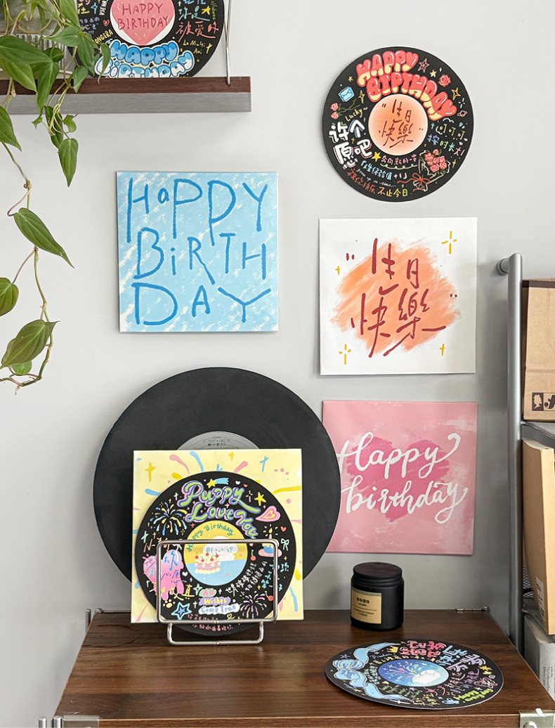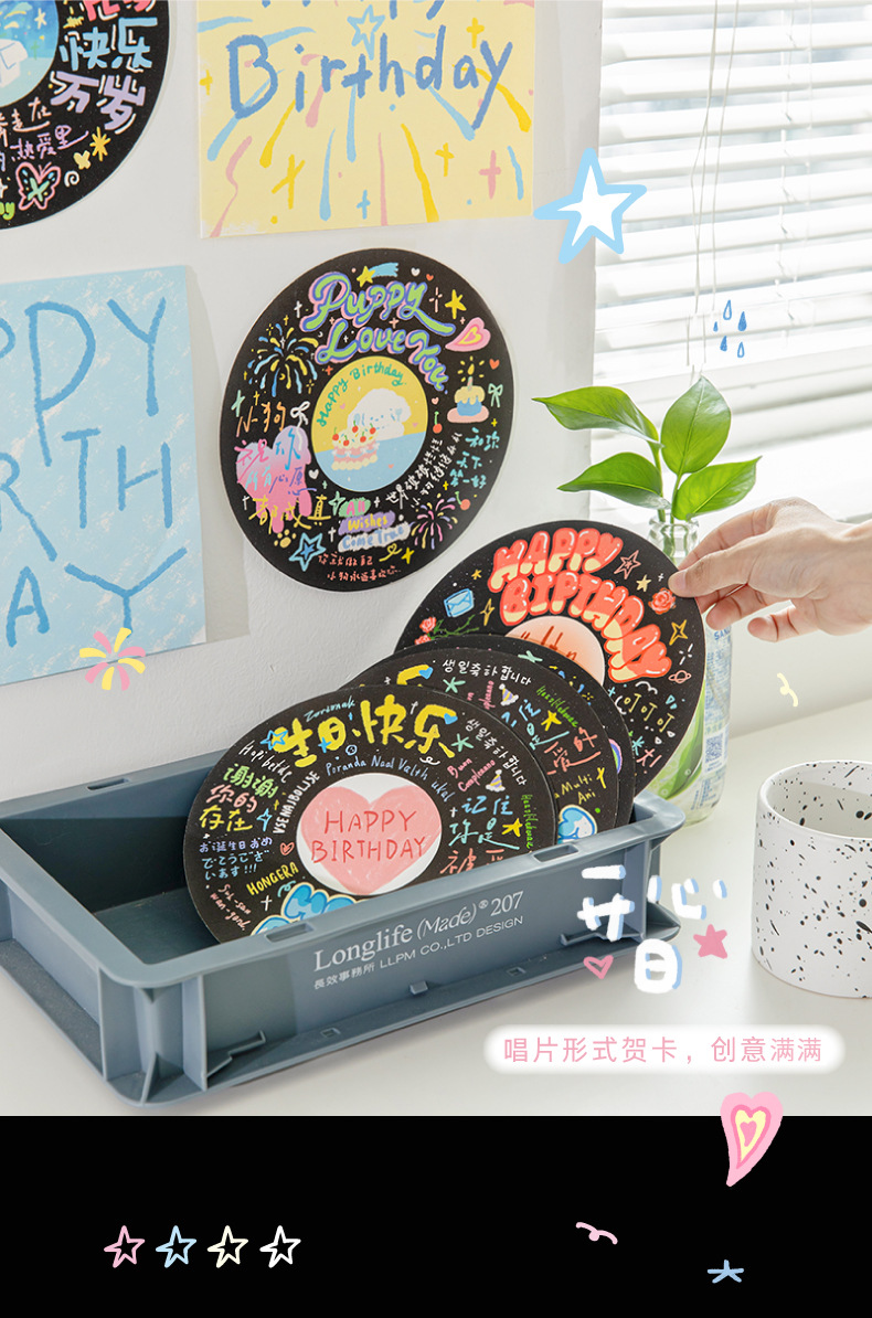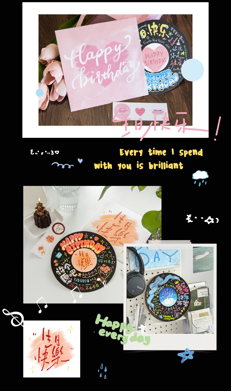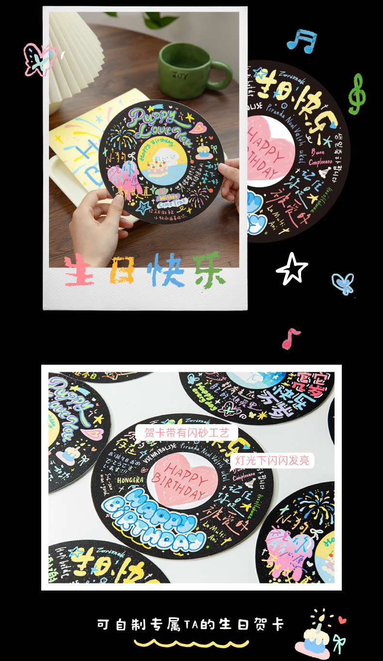 Mo Mo Flash Sand Tarjeta de felicitación de arena y juego de sobres Serie de feliz cumpleaños Graffiti de texto negro Tarjetas de cumpleaños redondas