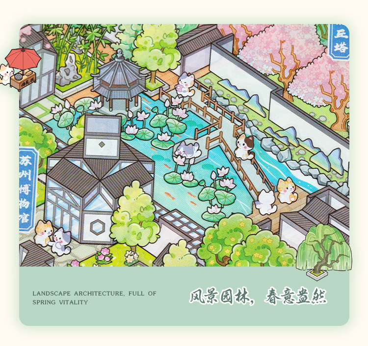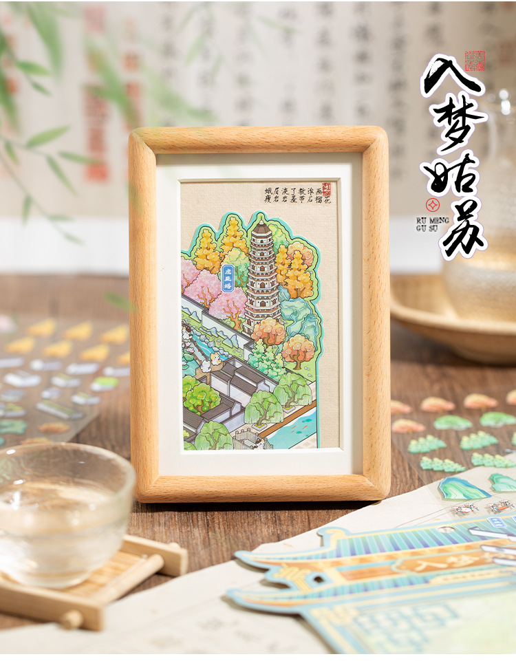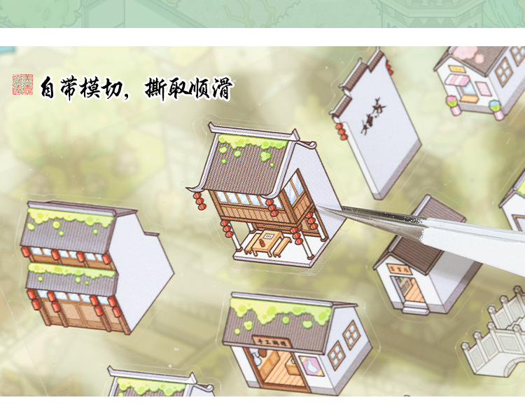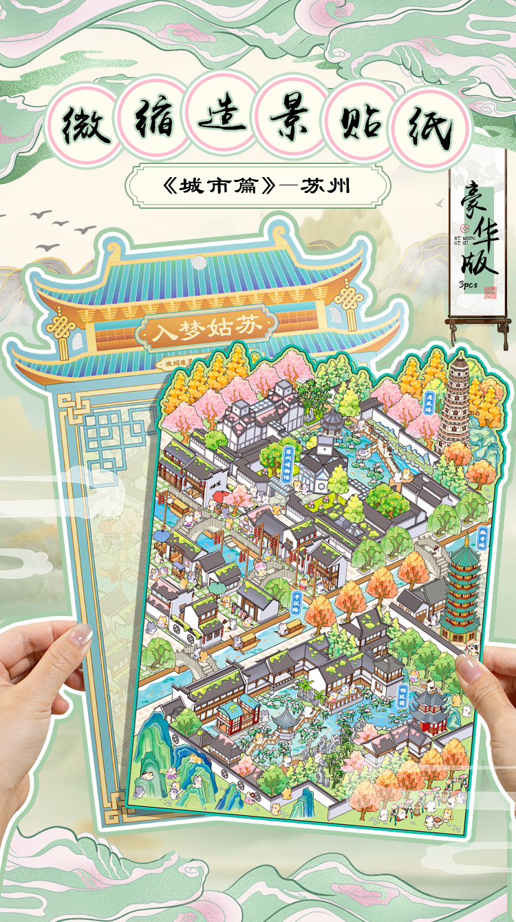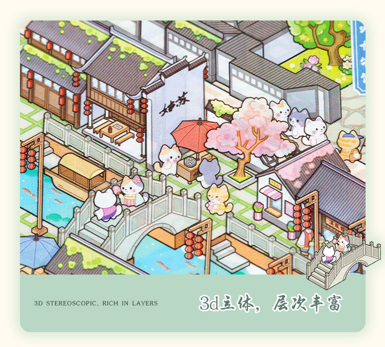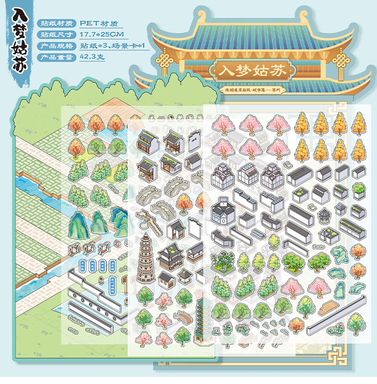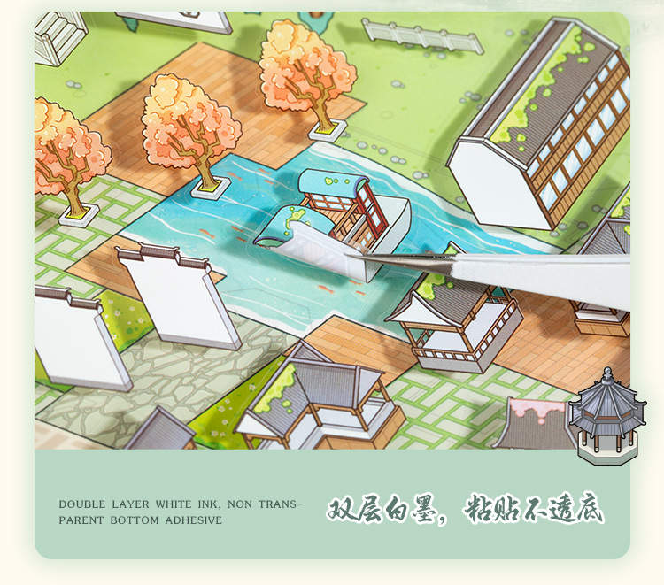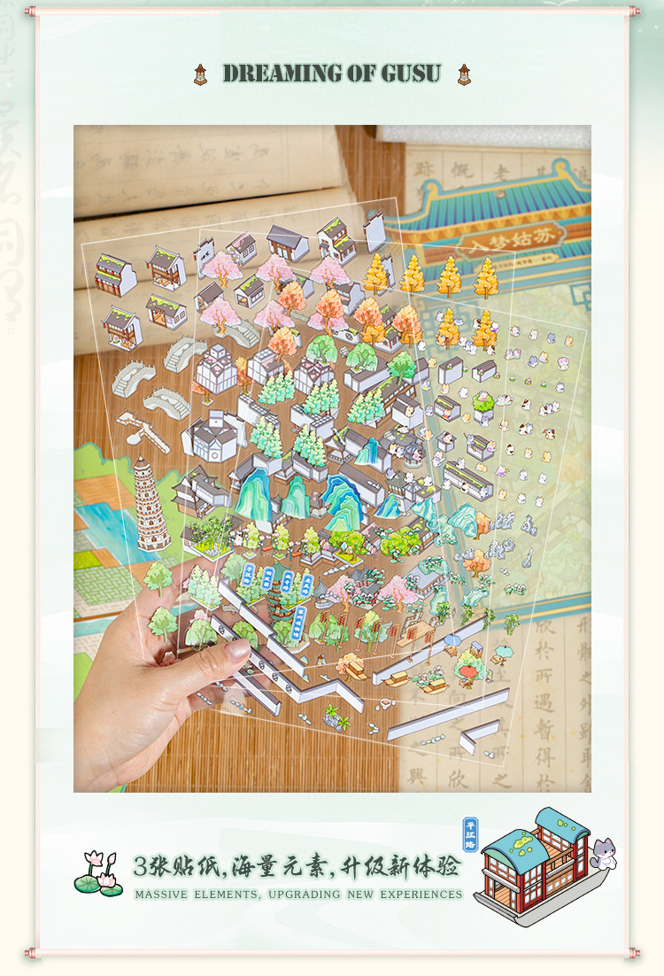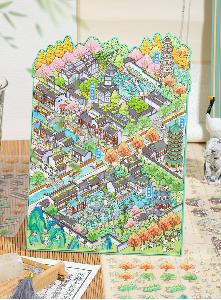 Yiwu tinta lenguaje ocio miniaturizado gran paisaje pegatinas de la ciudad de Suzhou 3D pegatinas de cabaña apiladas para niños