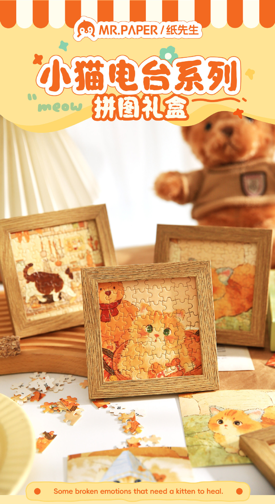 Mr. Paper caja de regalo de rompecabezas de cinco pulgadas gatito serie de radio lindo animalito ilustración rompecabezas de escritorio adornos