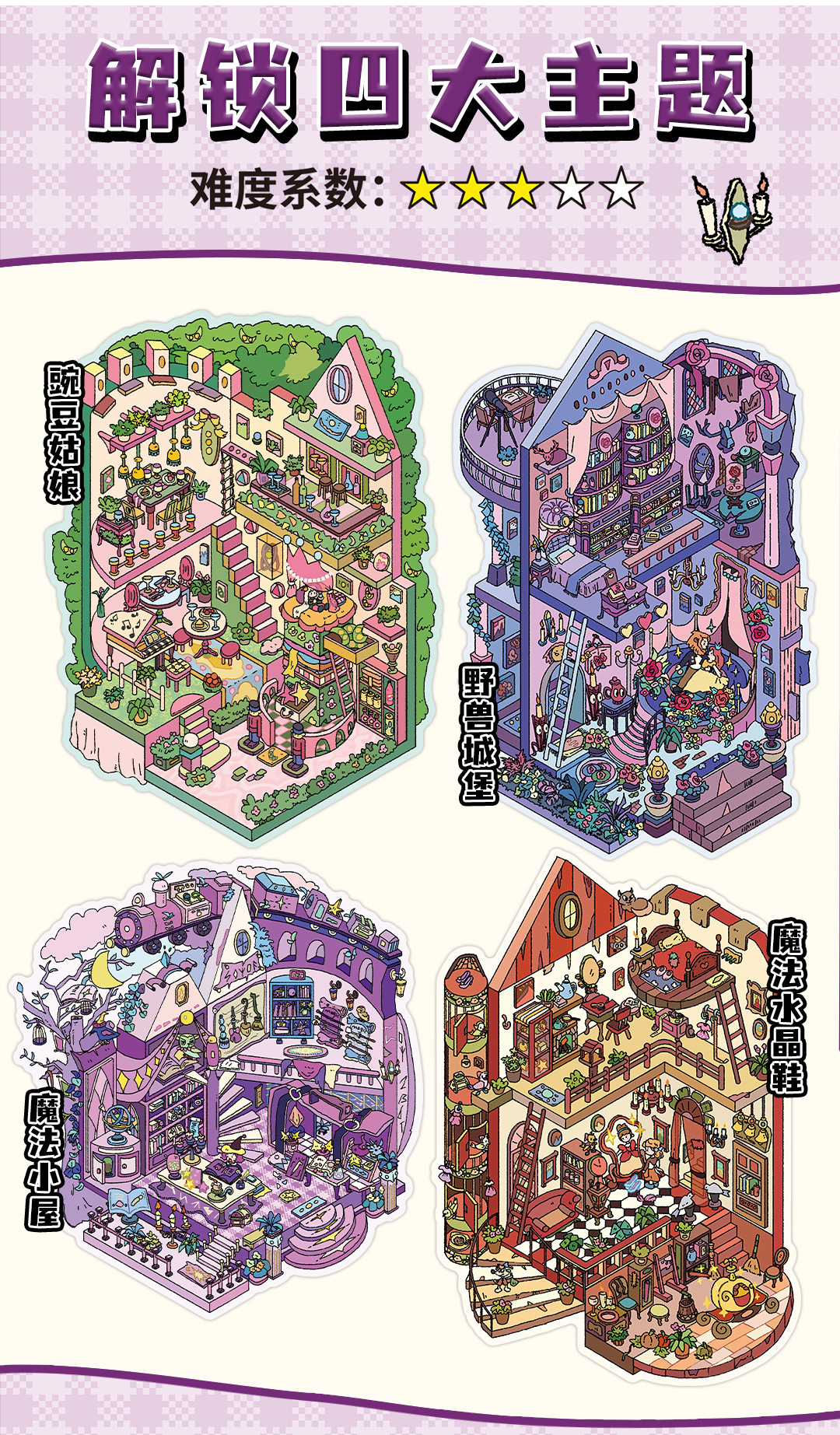 | Colores | Cabaña mágica,Zapatos de cristal mágico,Castillo de la bestia,Chica guisante |