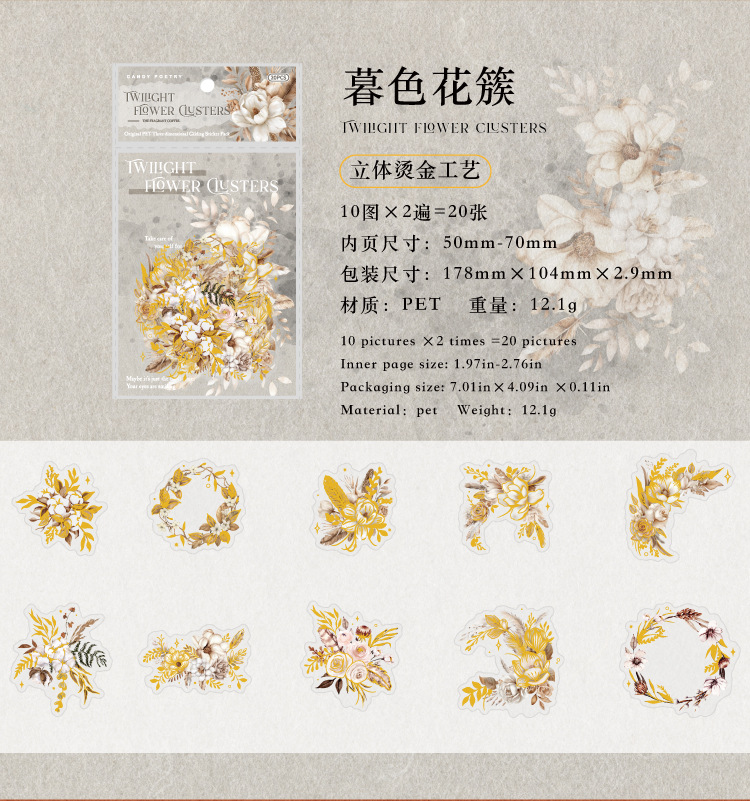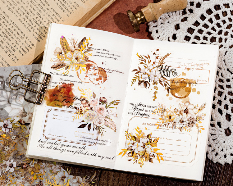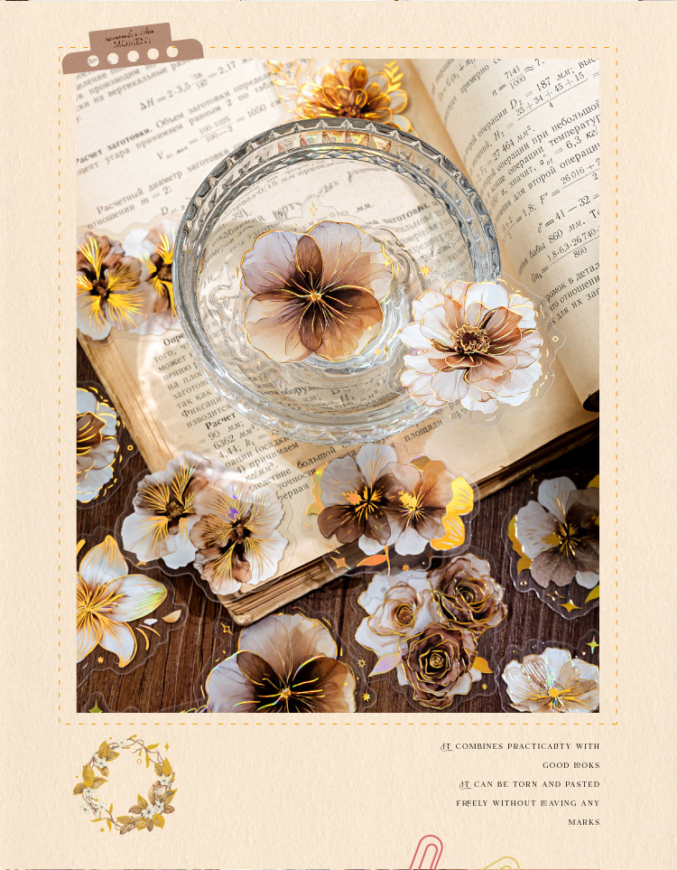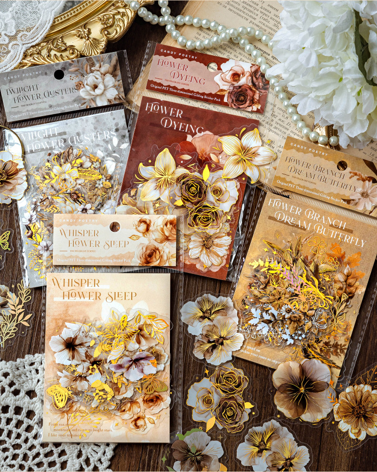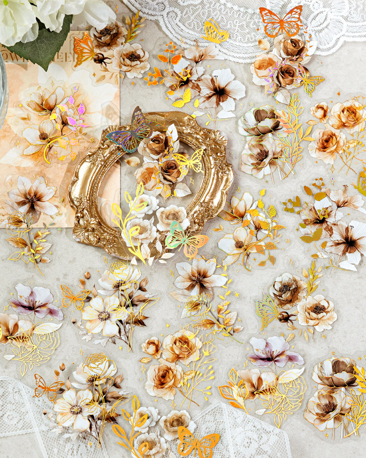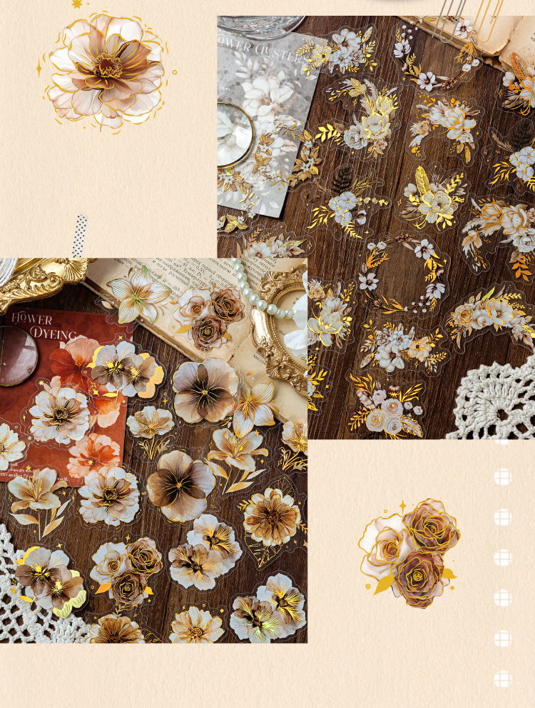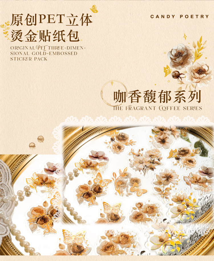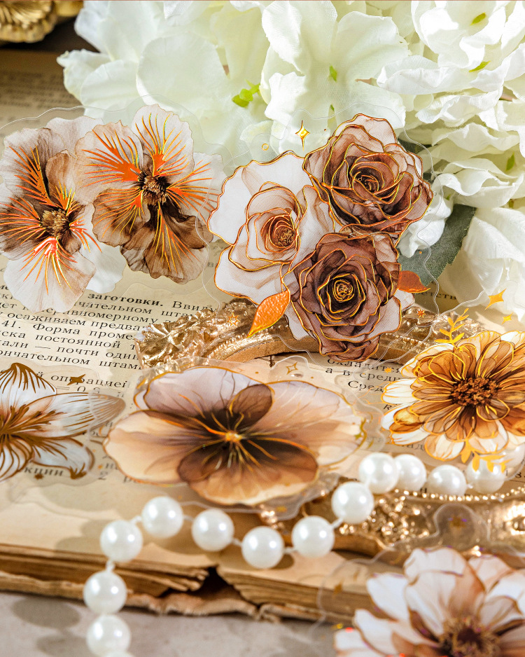 Sugar Poetry PET Stereo Bronceado Pegatinas de tinta blanca Paquete Ka Fragrant Series Retro Plant Flower Cart Pegatinas de cuentas manuales