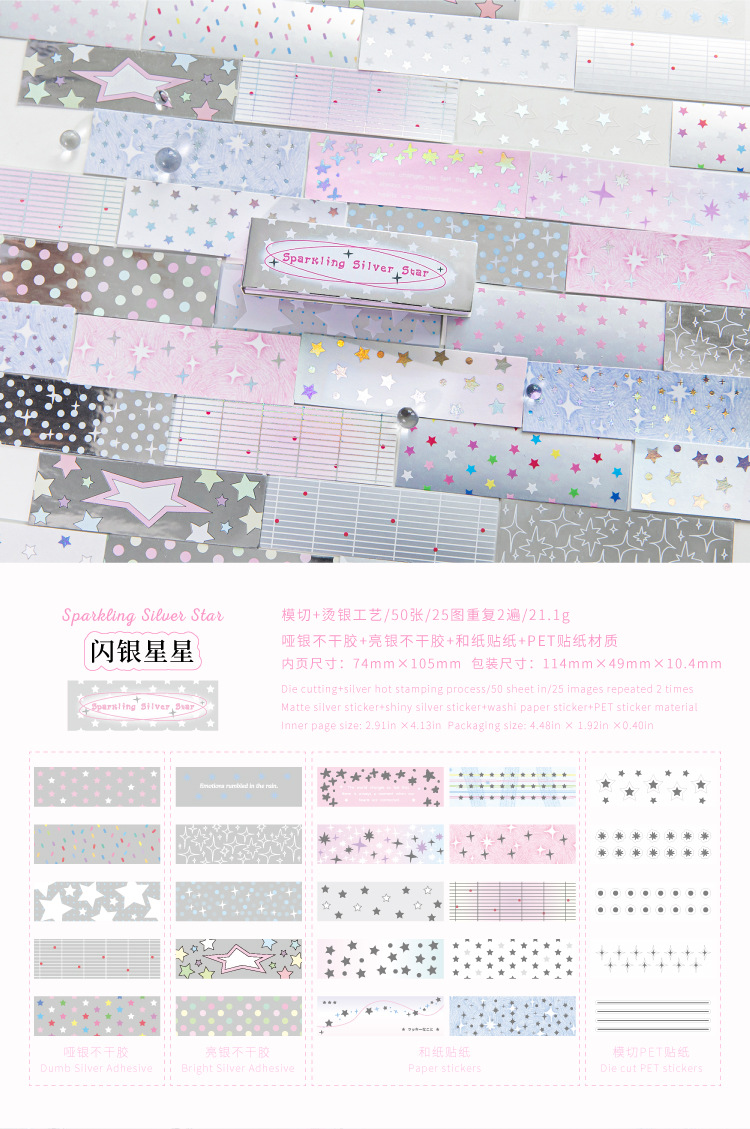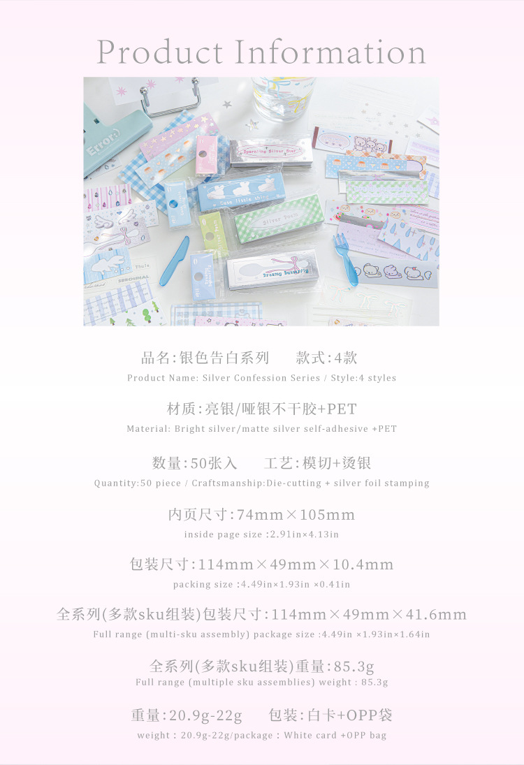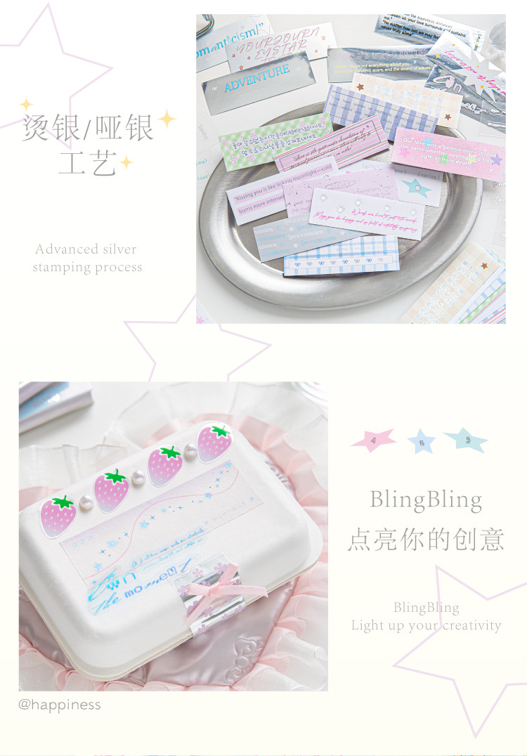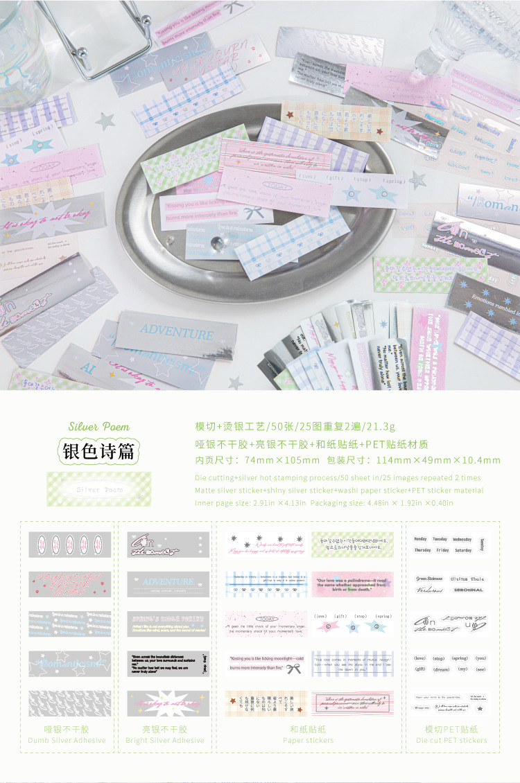 Sugar Poetry Material mixto Pegatinas plateadas en caliente Serie de confesiones plateadas Cute Korean Handscart Diy Pegatinas largas