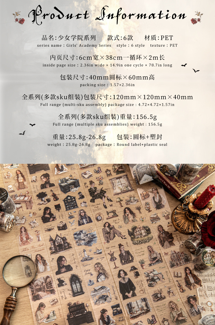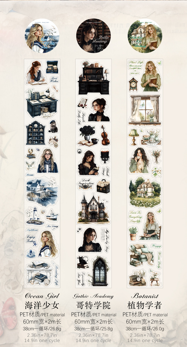 | Colores | Marine doncella 60mm * 2m,Academia Gótica 60mm * 2m,Botánico 60mm * 2m,Fe artística 60mm * 2m,Estética de moda 60mm * 2m,Académico europeo 60mm * 2m |