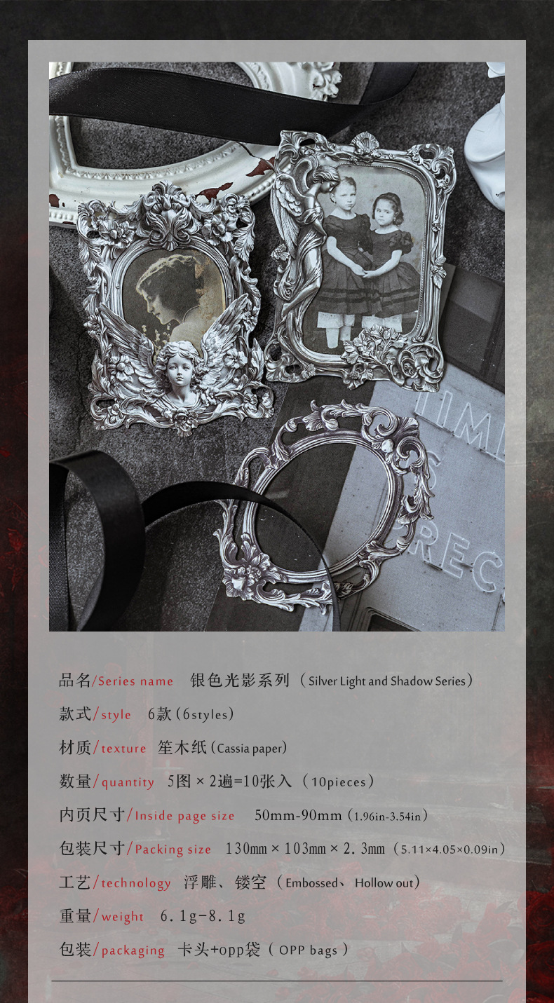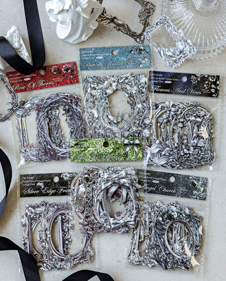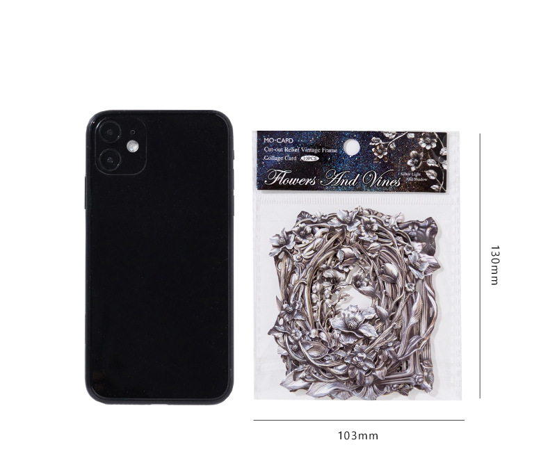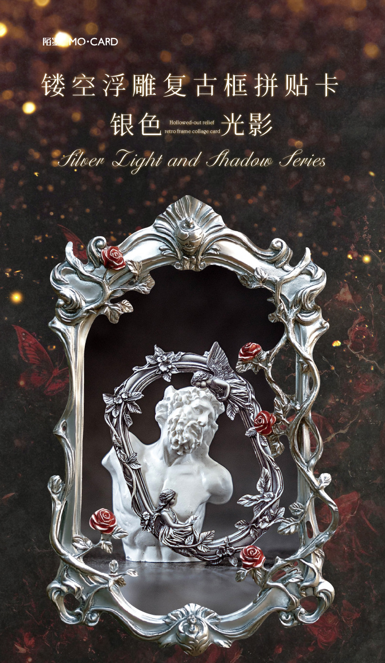 Tarjeta de collage en relieve hueca de papel de madera Mo Mo Sheng, serie de luces y sombras plateadas, bolsa de pegatinas de cuentas huecas retro Guka
