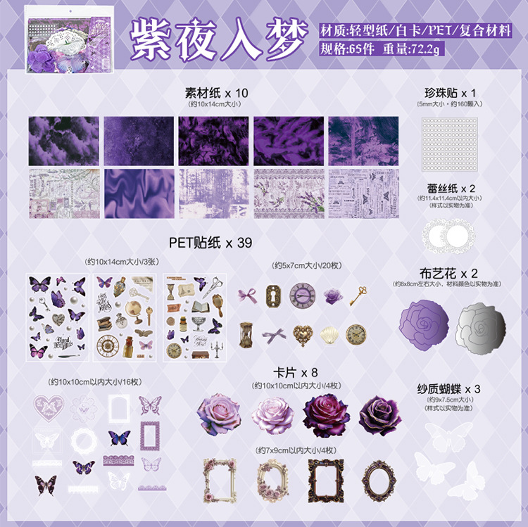 | Colores | Sueño de noche púrpura,Jardín de viento azul,Palacio de la nube roja,Reflejos nocturnos |