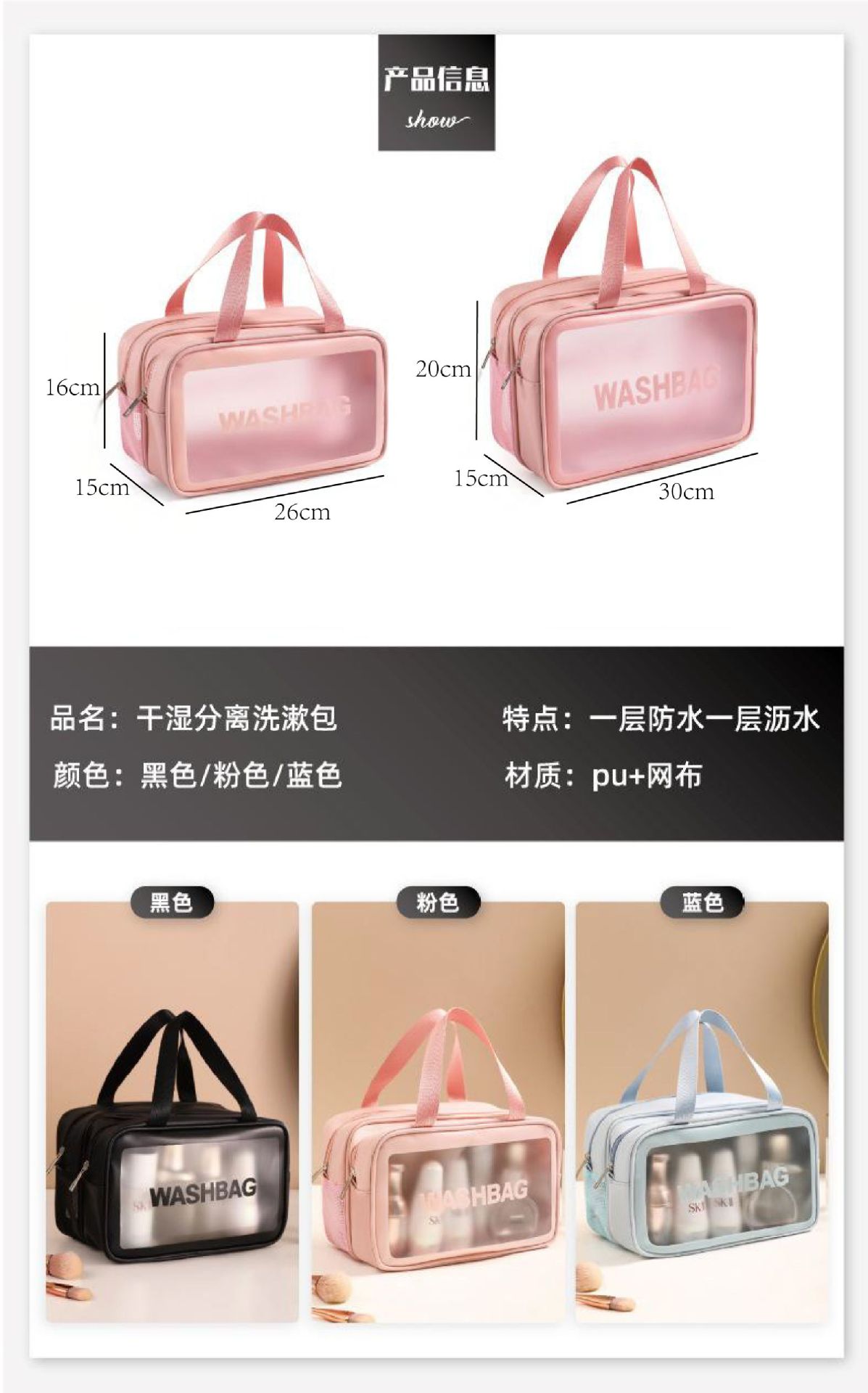 Nuevo estilo coreano de doble capa de PVC esmerilado de separación húmeda y seca bolsa de lavado de artículos de tocador portátiles y bolsa de almacenamiento de cosméticos