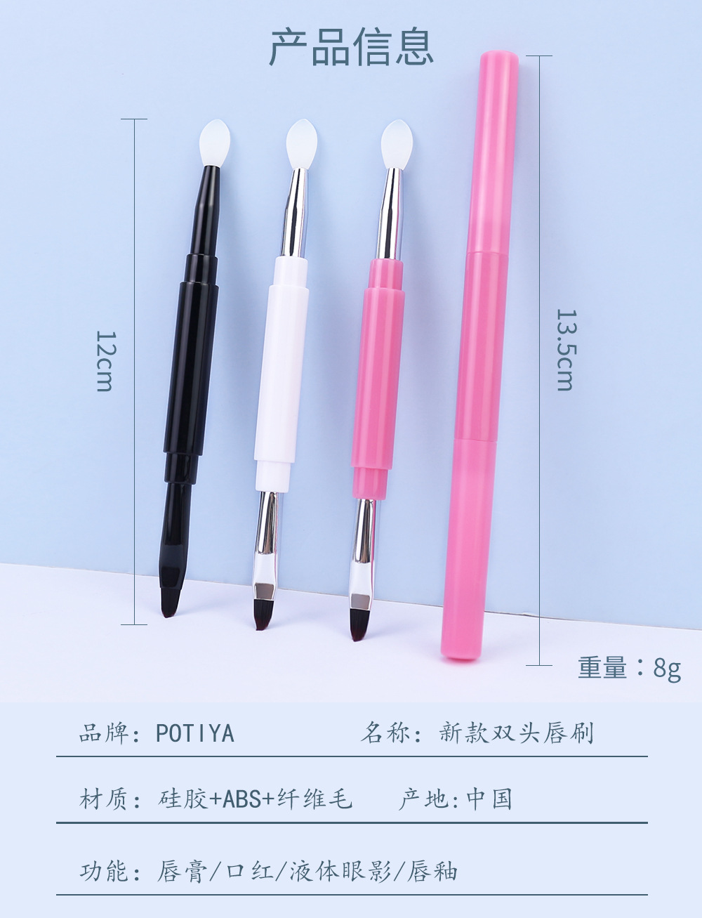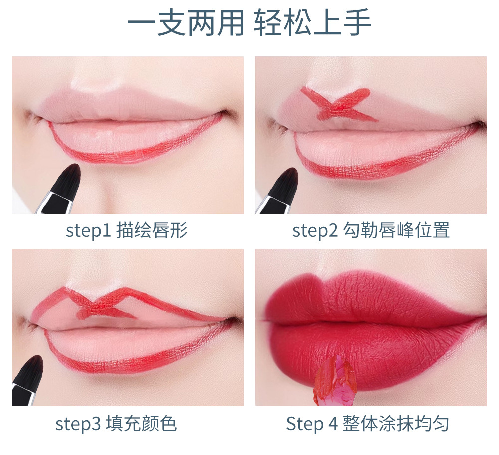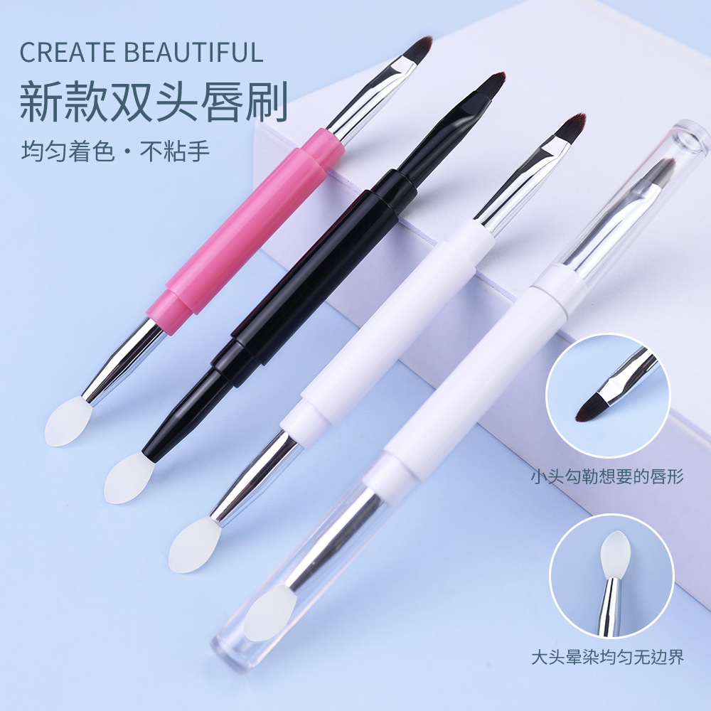 | Características de uso funcional | Doble propósito, una cabeza de silicona y una cabeza de cabello suave, cabello suave para delinear la forma de los labios, máscara de labios con lápiz labial manchado con relleno de silicona, doble cabeza con tapa, limpia e higiénica, pequeña y portátil |