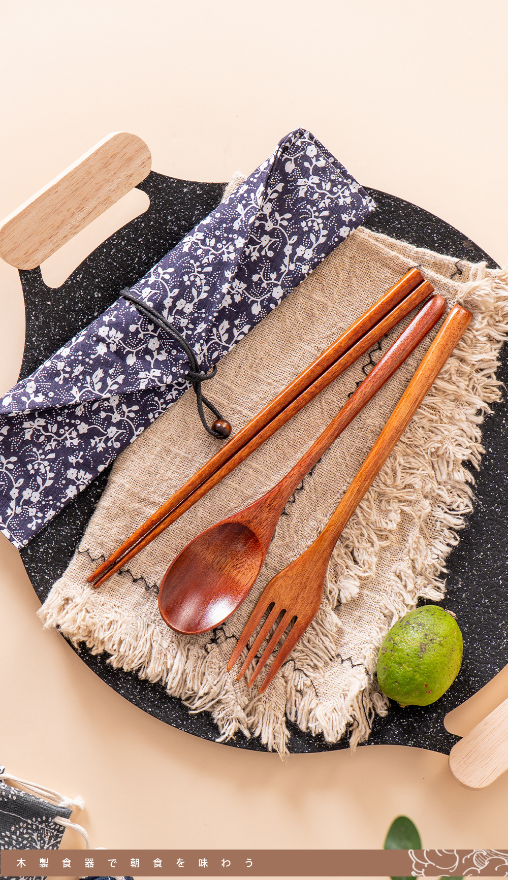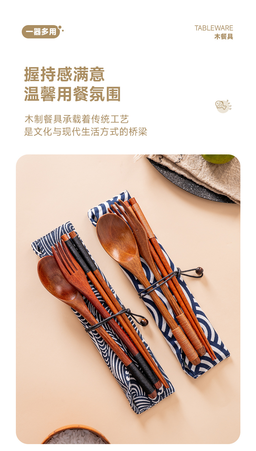 Mo Ming estilo japonés 22,5 cm palillos de madera tenedor cuchara juego de tres piezas palillos domésticos de cocina bolsa de tela de almacenamiento de alambre de red