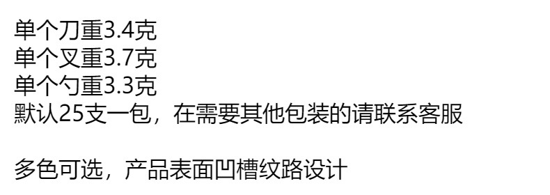 | Color | Cuchillo de oro asiático (25 piezas por paquete),Tenedor de oro asiático (25 piezas por paquete),Cuchara de oro (25 piezas por paquete),Cuchillo de plata (25 piezas por paquete),Tenedor de plata (25 piezas por paquete),Cuchara de plata (25 piezas por paquete),Cuchillo negro (25 piezas por paquete),Tenedor negro (25 piezas por paquete),Cucharas negras (25 PCs),Cuchillo amarillo (25 piezas por paquete),Tenedor amarillo (25 piezas por paquete),Cuchara amarilla (25 piezas por paquete),Cuchillo rojo (25 piezas por paquete),Tenedor rojo (25 piezas por paquete),Cuchara roja (25 piezas por paquete),Cuchillo púrpura (25 piezas por paquete),Tenedor púrpura (25 piezas por paquete),Cuchara púrpura (25 piezas por paquete),Cuchillo Hulan (25 piezas por paquete),Tenedor Hulan (25 piezas por paquete),Hulan cuchara (25 piezas por paquete),Cuchillo rosa (25 piezas por paquete),Tenedor rosa (25 piezas por paquete),Cuchara rosa (25 piezas por paquete),Cuchillo naranja (25 piezas por paquete),Tenedor naranja (25 piezas por paquete),Cuchara naranja (25 piezas por paquete),Cuchillos verde oscuro (25 piezas por paquete),Horquillas verde oscuro (25 piezas por paquete),Cucharas de color verde oscuro (25 piezas por paquete),Cuchillos azul oscuro (25 piezas por paquete),Tenedores azul oscuro (25 piezas por paquete),Cucharas azul oscuro (25 piezas por paquete),Cuchillo de fruta verde (25 piezas por paquete),Tenedor verde de fruta (25 piezas por paquete),Cuchara de fruta verde (25 piezas por paquete) |