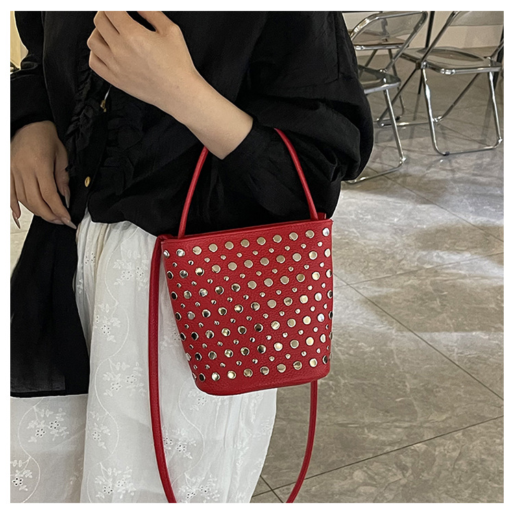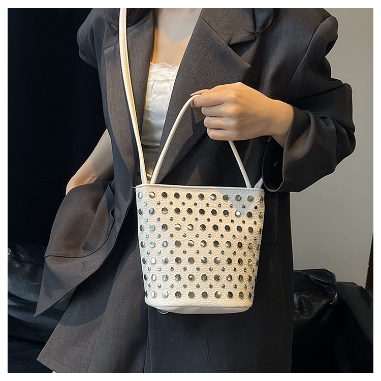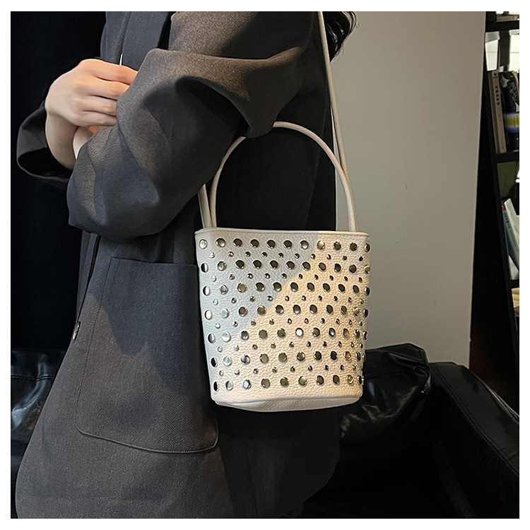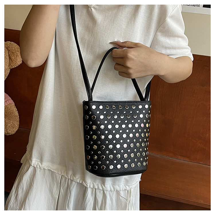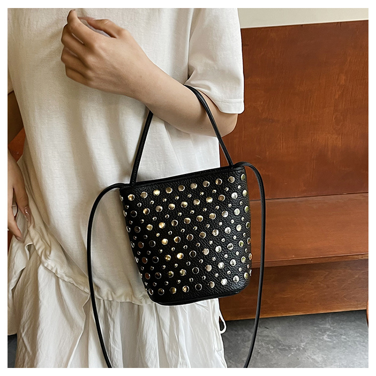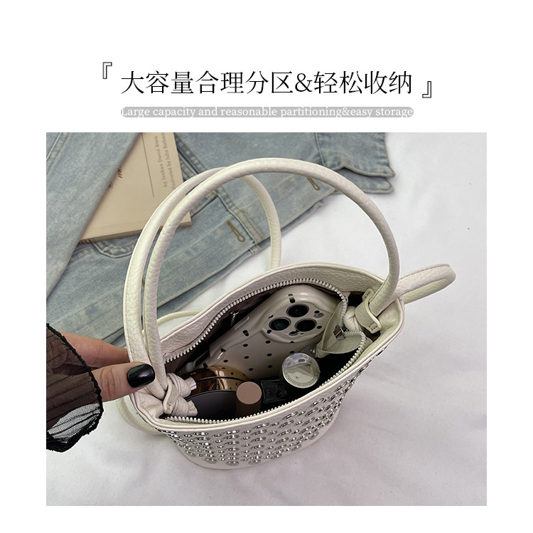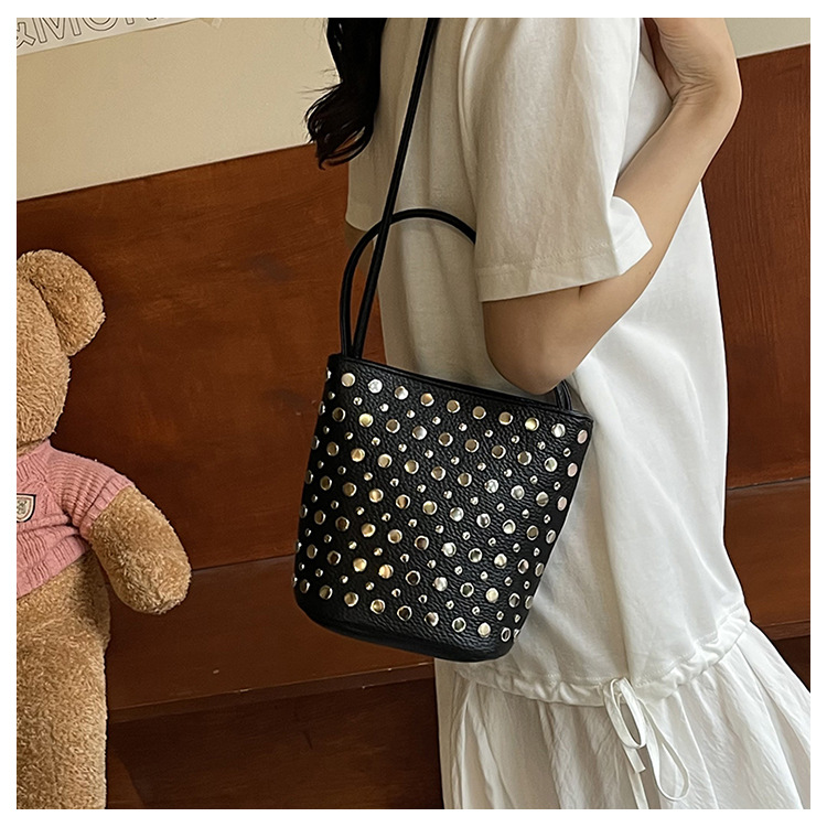 Bolso de cubo de textura transfronteriza 2025 nuevo bolso de mano remache personalizado bolso de hombro retro patrón de lichi bolso de mensajero mujer