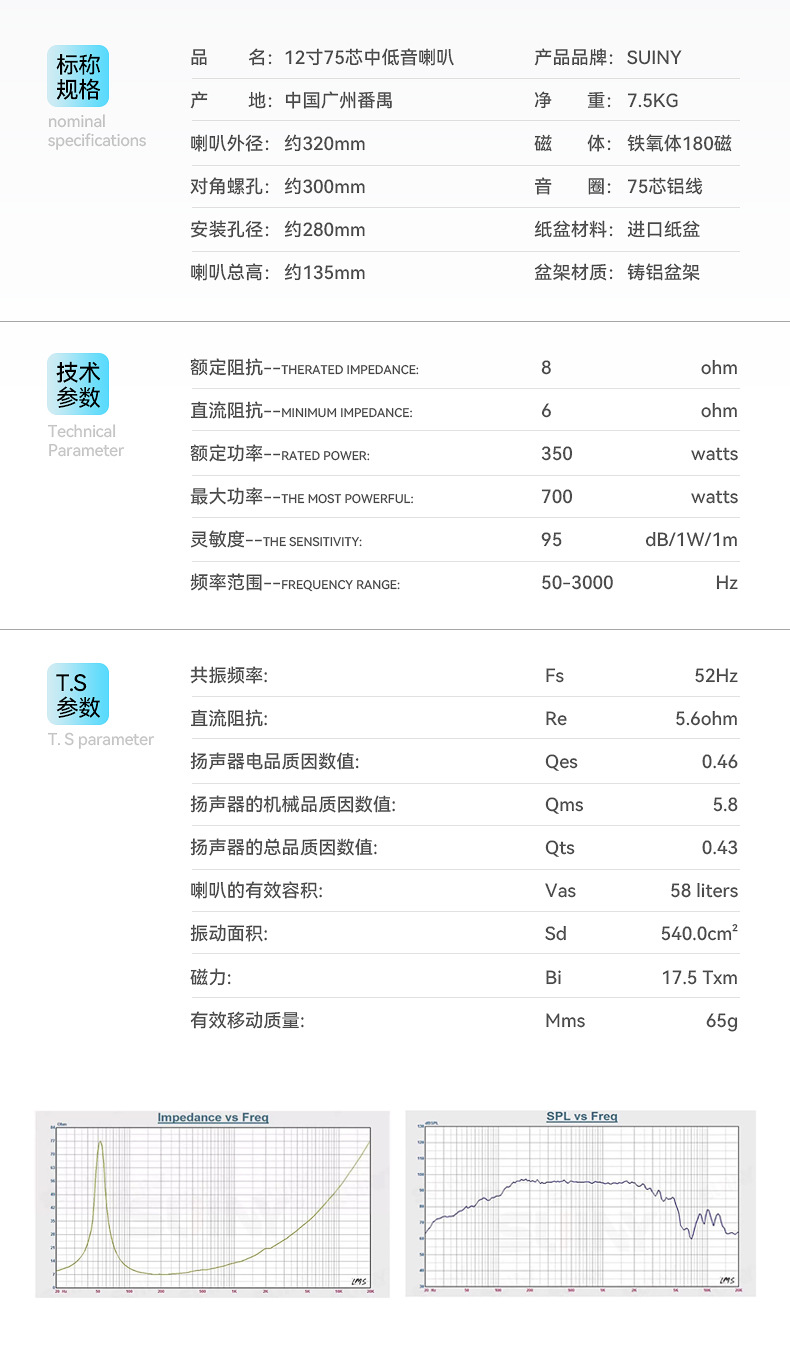 SUINY/Shuyin 12 pulgadas woofer medio 180 magnético 75 núcleo lavabo de aluminio KTV altavoz de escenario profesional 350W entretenimiento