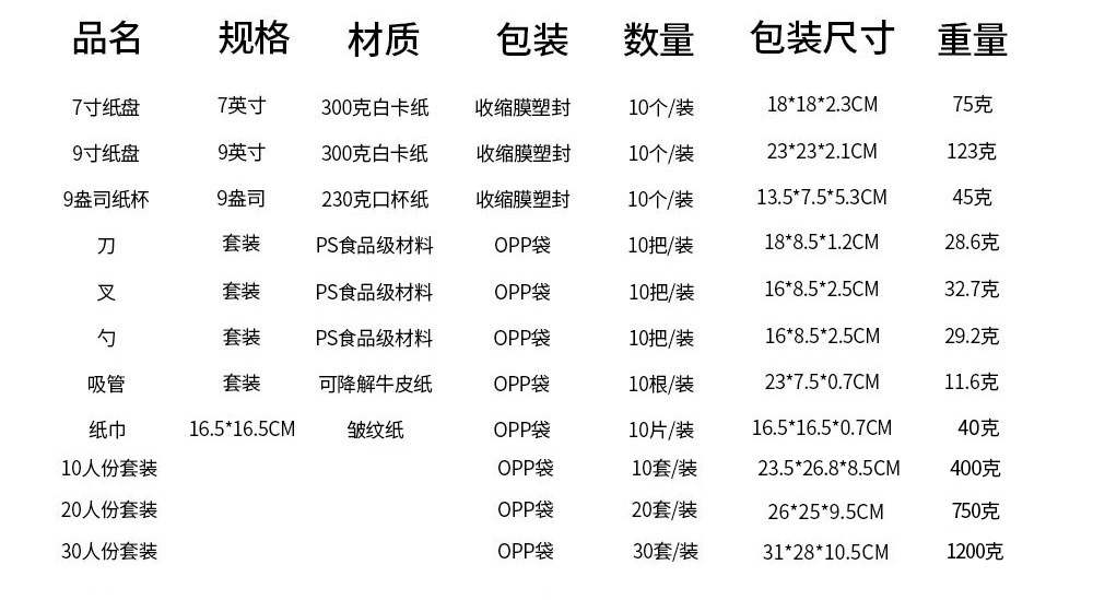 | Color | 7 pulgadas 10 bandeja de papel, 9 pulgadas 10 bandeja de papel, 10 vasos de papel, 10 pajitas, 20 toallas de papel, 10 tenedores, 10 cuchillos, 10 cucharas, 10 juegos de 8 para 10, 20 juegos de 8 para 20 y 8 Juegos de 8 para 30. |