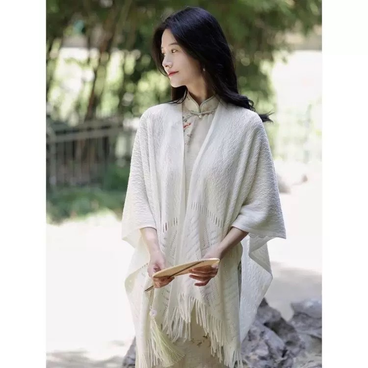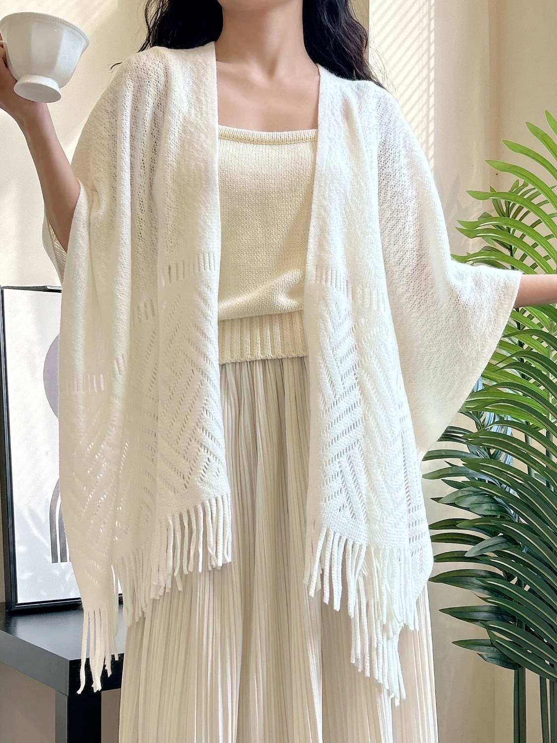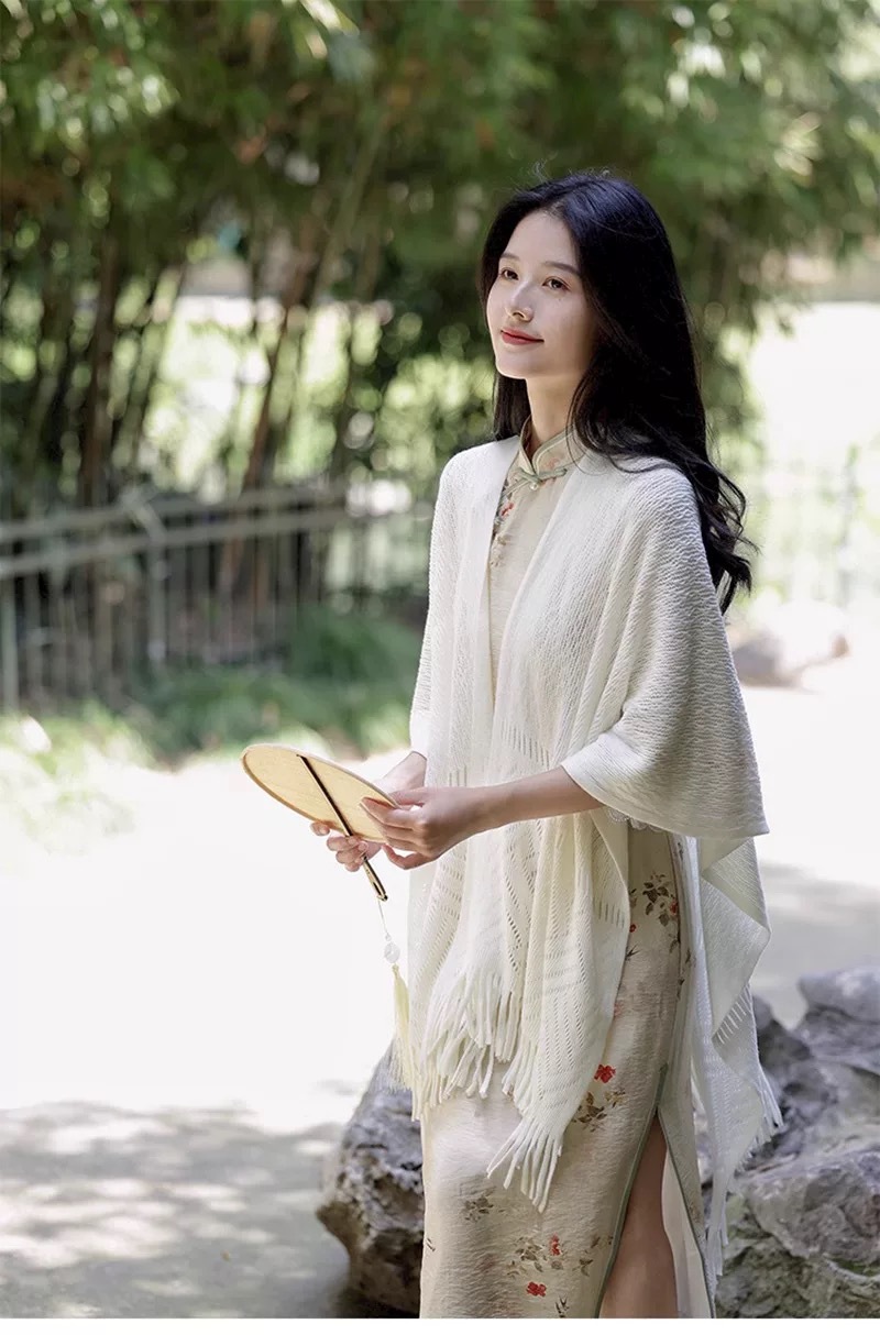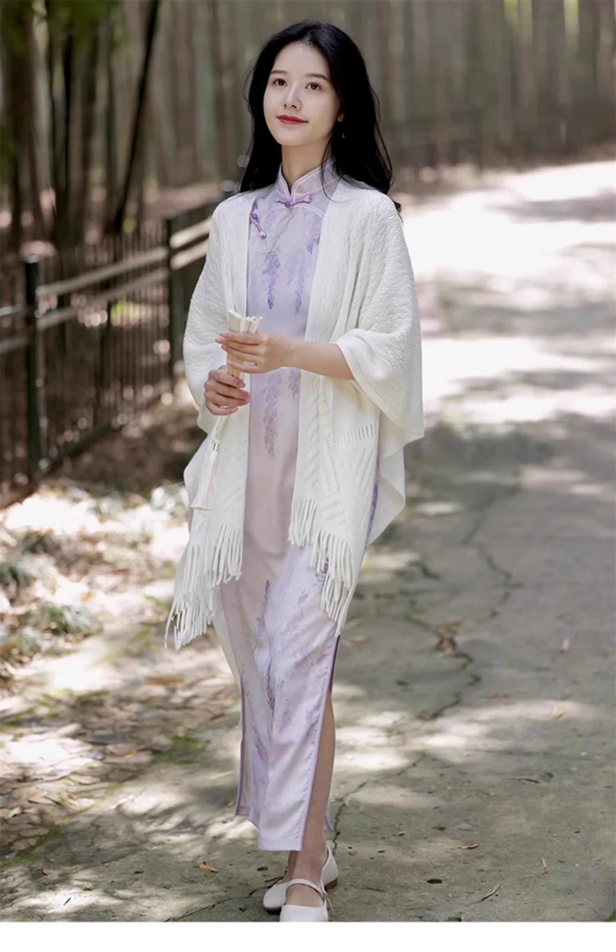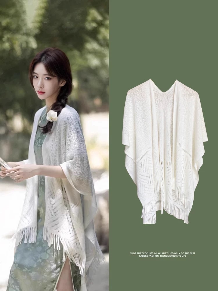 Habitación con aire acondicionado, chal de punto hueco, cheongsam blanco femenino, cárdigan con capa de borlas de moda nueva 2025