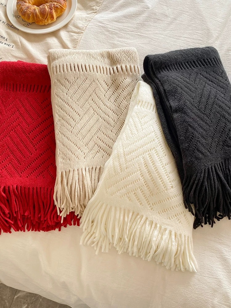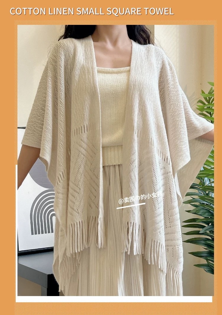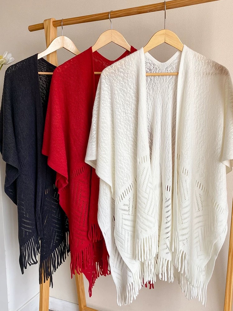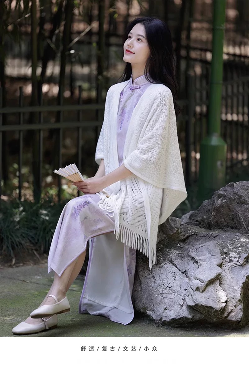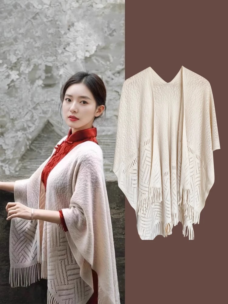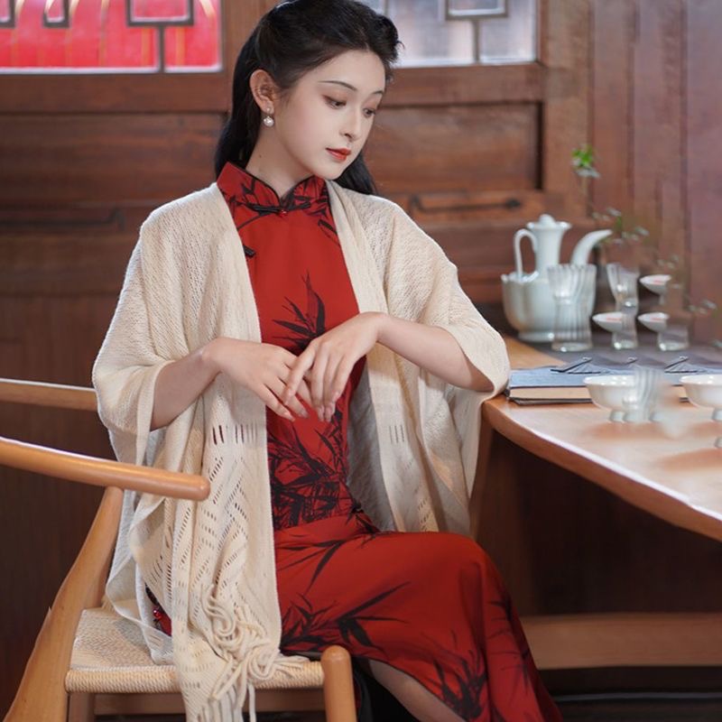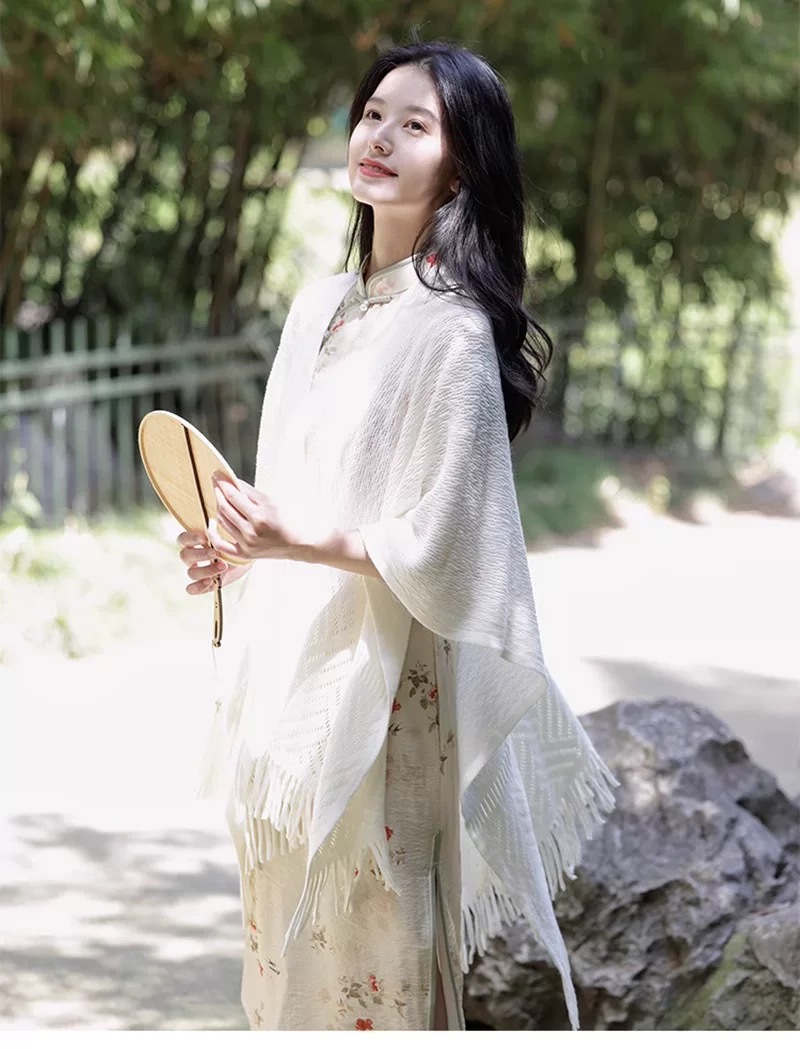 Habitación con aire acondicionado, chal de punto hueco, cheongsam blanco femenino, cárdigan con capa de borlas de moda nueva 2025