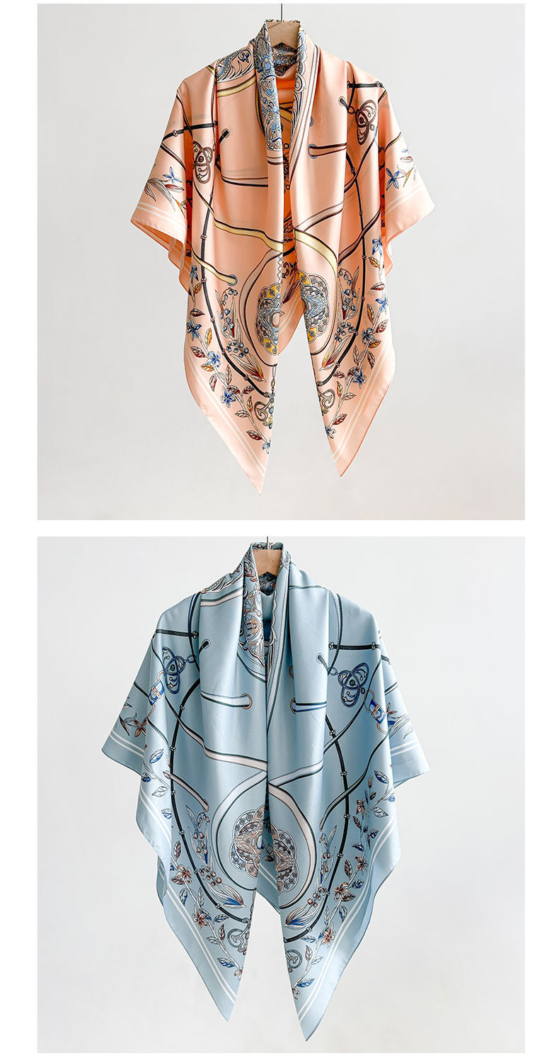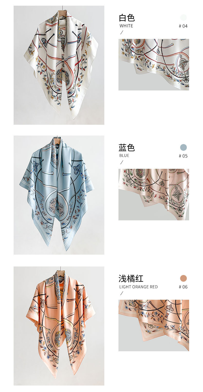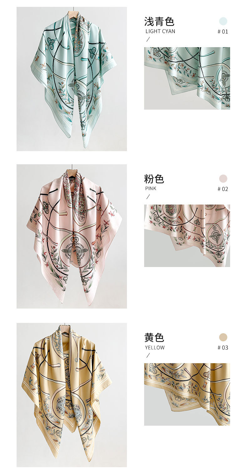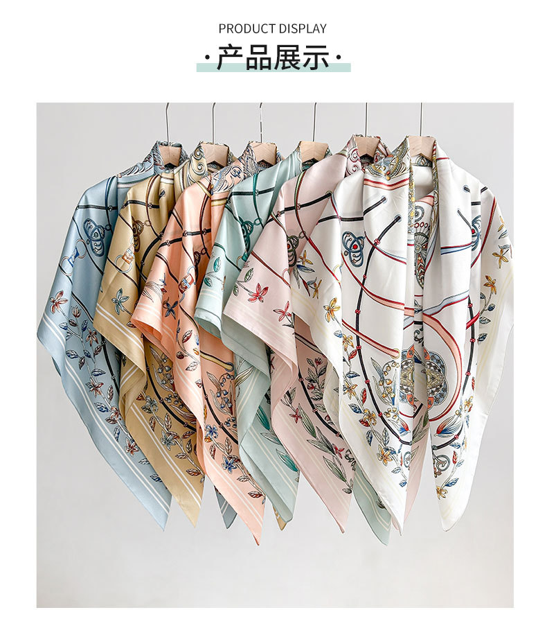 Toalla cuadrada impresa de nicho de estilo étnico de tendencia creativa, foto de fotografía de mujer de primavera y verano con bufanda fina de sarga