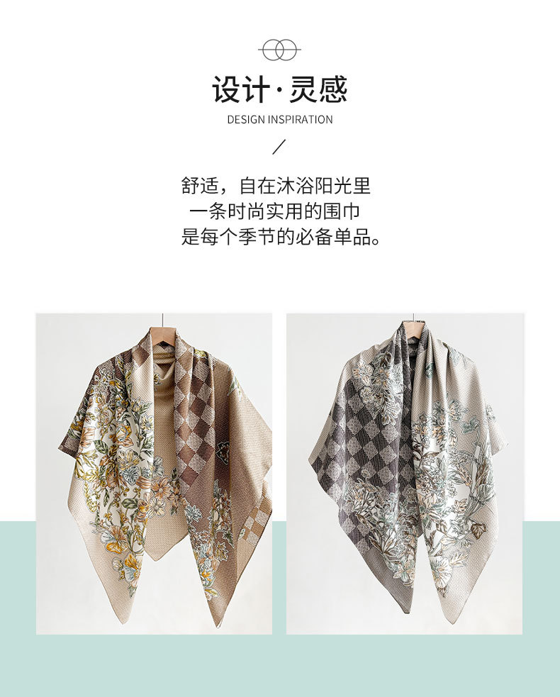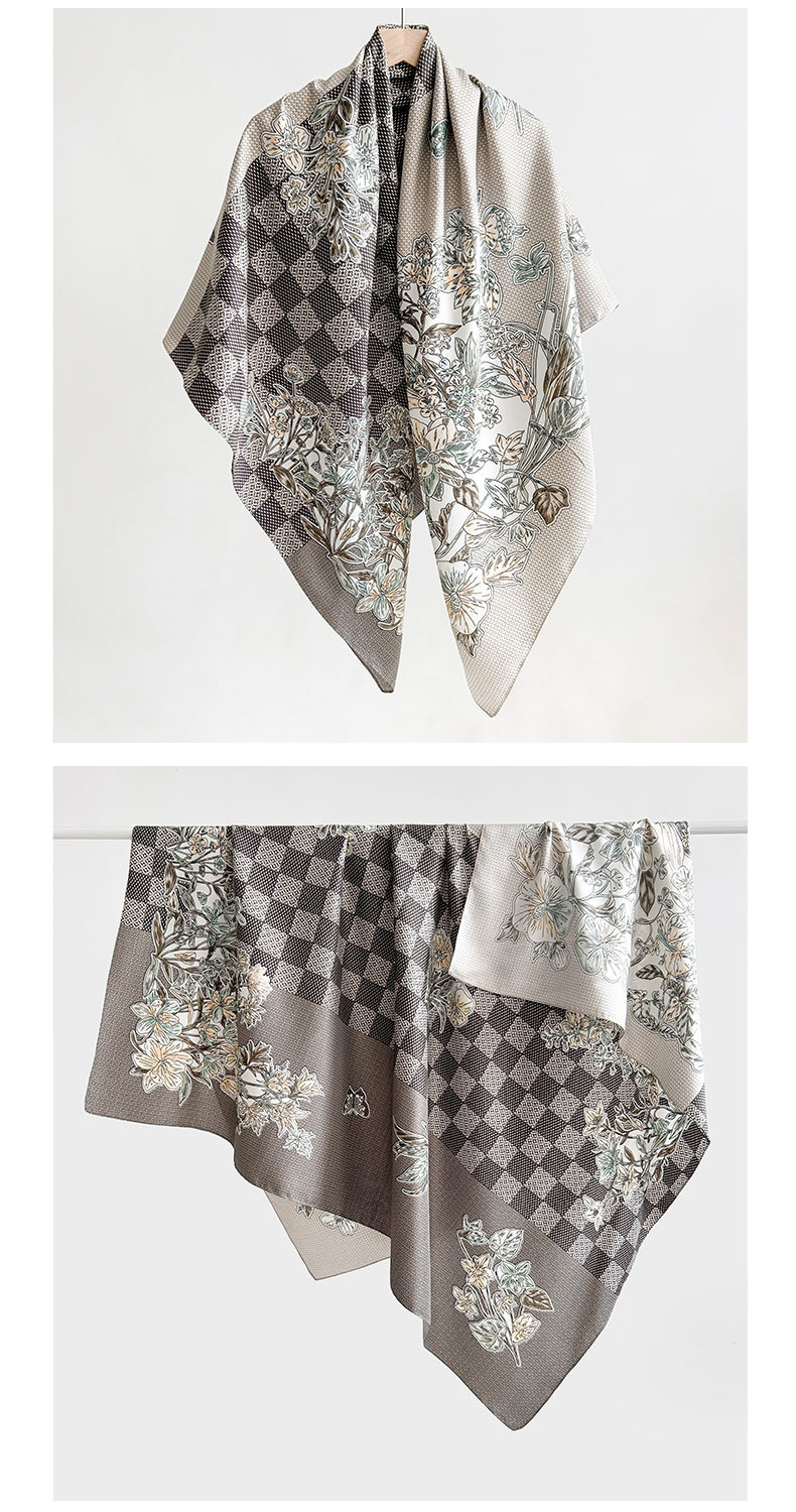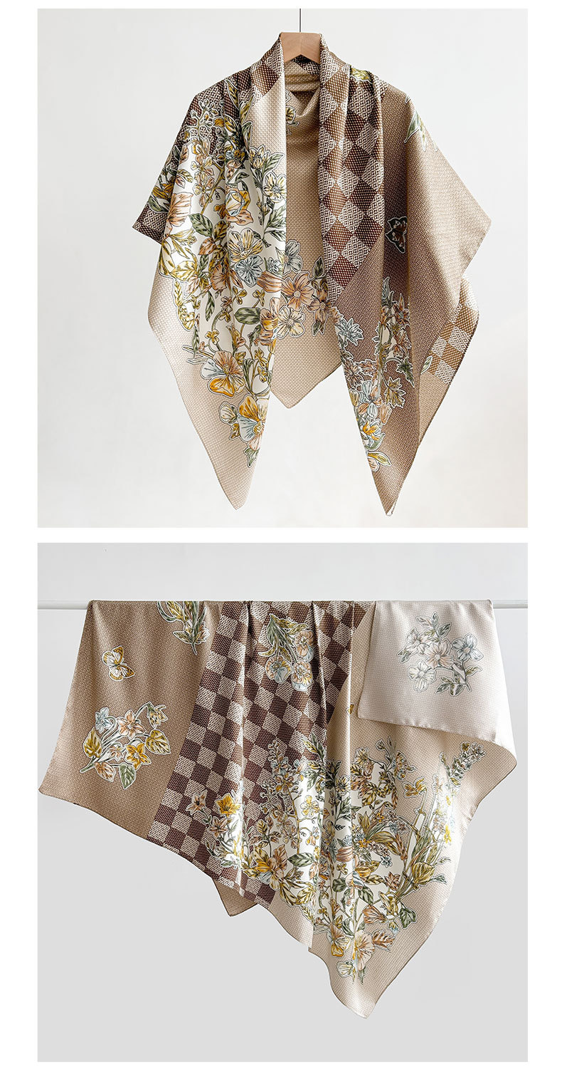 Nuevos productos transfronterizos de estilo europeo y americano, bufanda de seda estampada a cuadros de flores, estilo artístico de primavera y otoño, bufanda cuadrada de sarga de temperamento de atmósfera