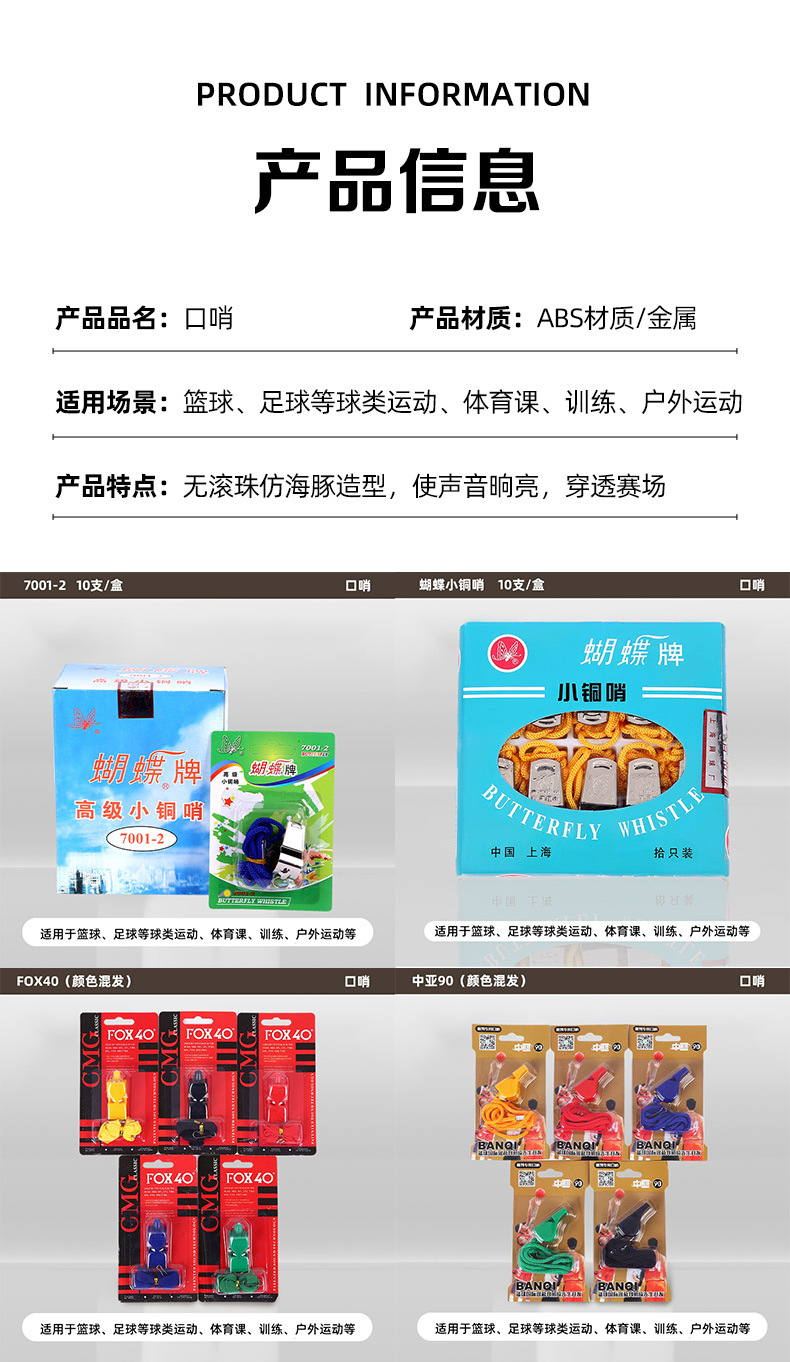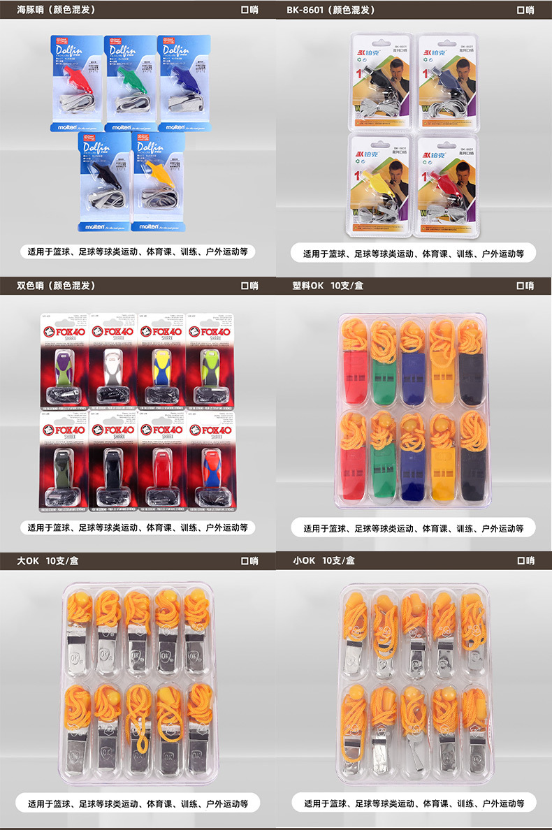 | Colores | Silbato OK grande en caja [10 piezas],Silbato pequeño OK en caja [10 piezas],Silbato OK de plástico de color en caja [10 piezas],Asia Central 90 uno (cabello mixto de color),Un silbato de delfín (color mixto),BK-8601 uno (cabello mixto de color),Silbato de cobre mariposa 7001-2 [10 piezas],FOX40 una (color de pelo mixto),Un silbato de dos colores FOX40 (color mixto),Silbato de cobre pequeño de mariposa [10 piezas],Silbato de color de plástico [20 piezas] |