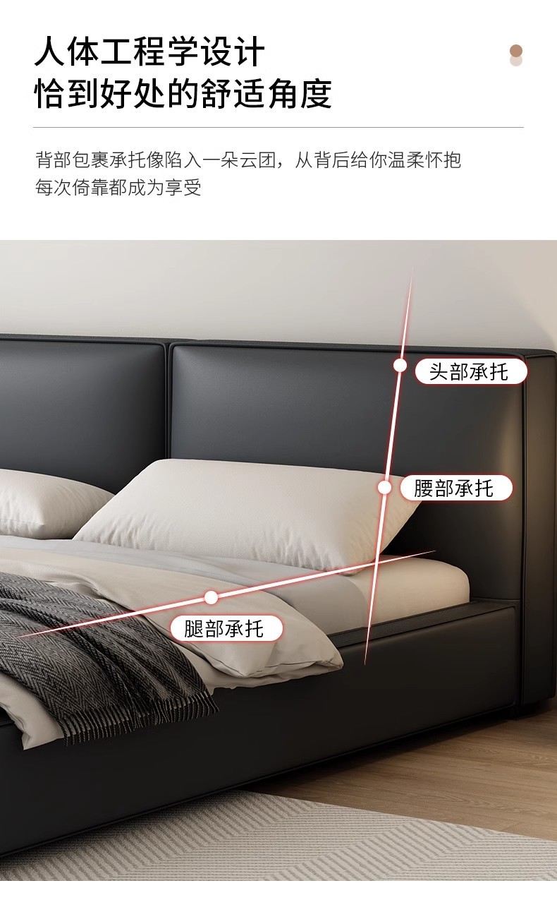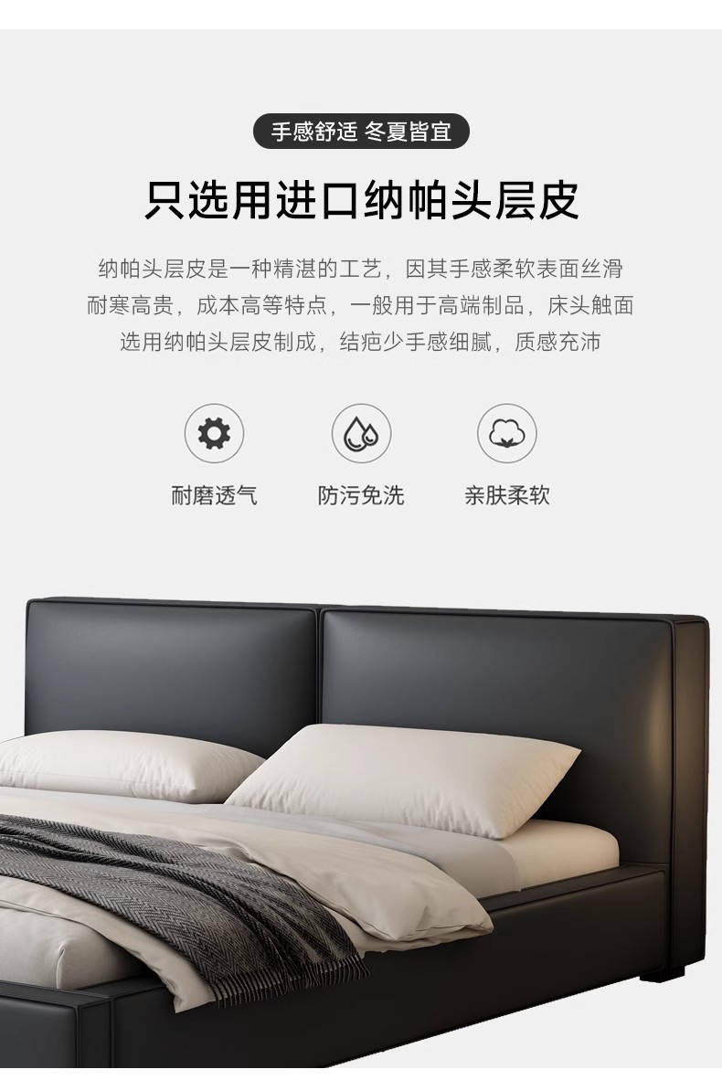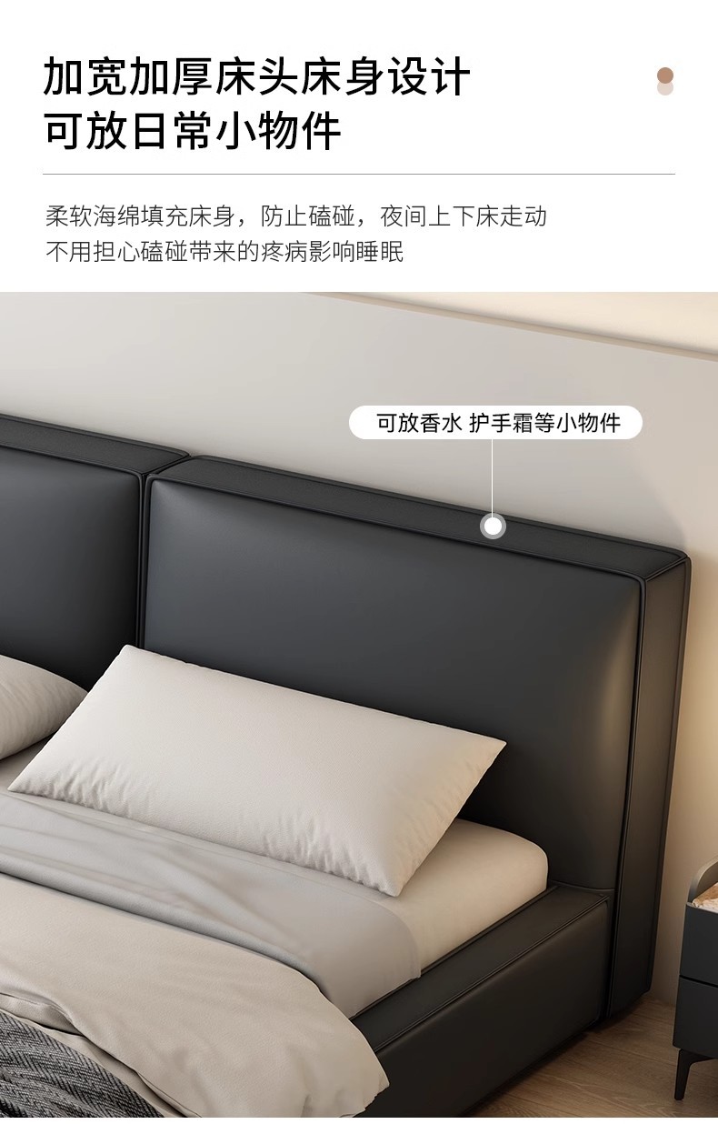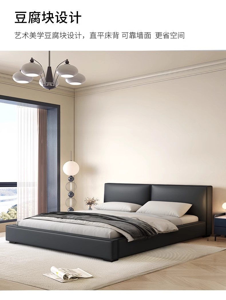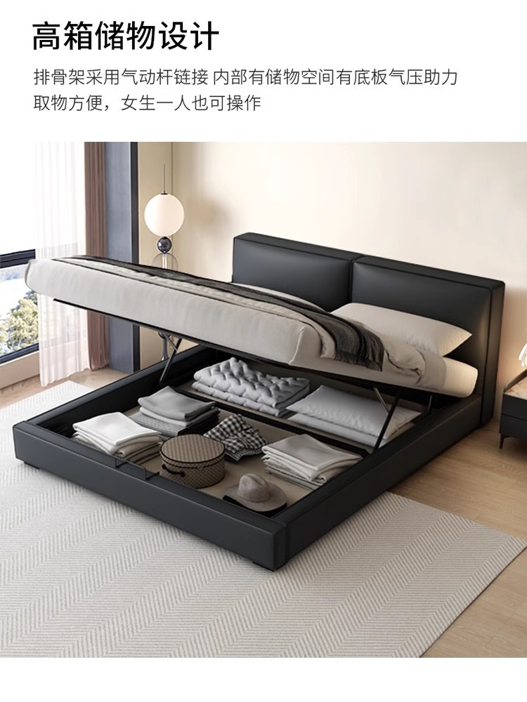 Diseñador minimalista italiano gran cama de cuero negro 1.8m simple y moderno pequeño dormitorio principal almacenamiento cama doble