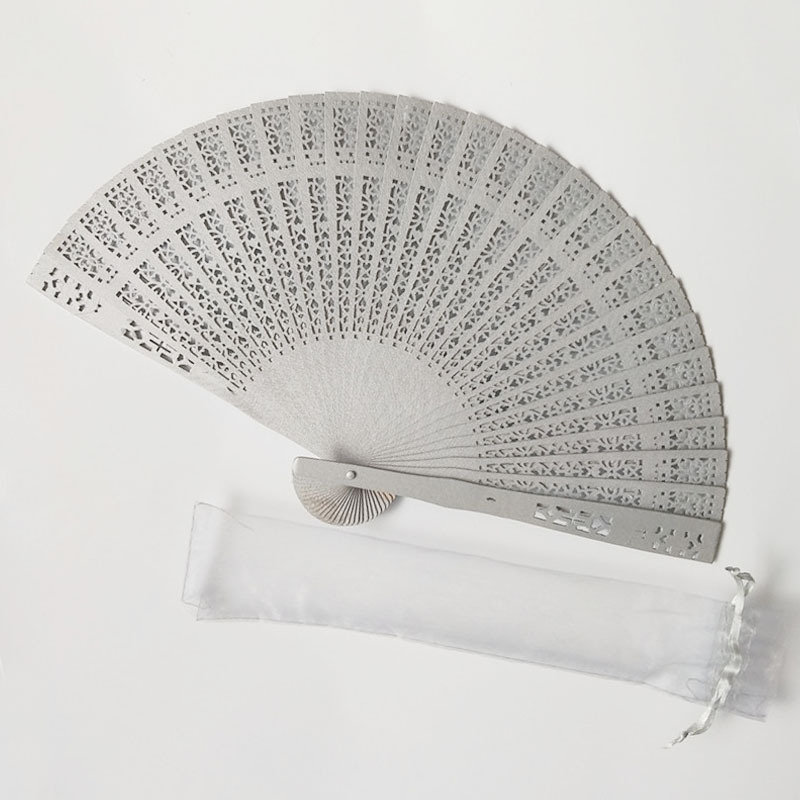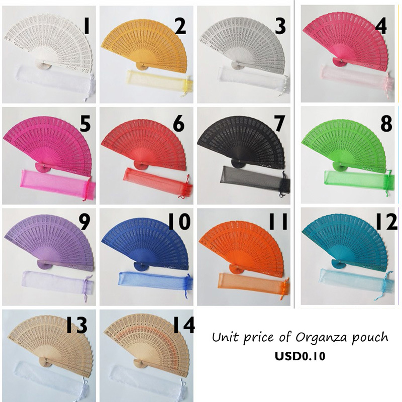 Hay en stock ventilador de madera llano transfronterizo más bolsa de organza ventilador plegable de madera de loto ventilador de madera de la boda multi-color opcional