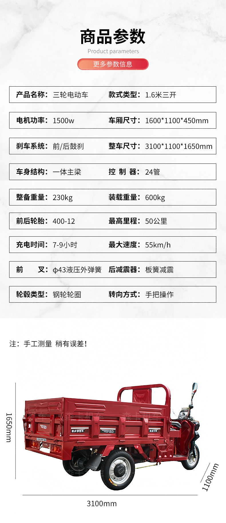 | Tamaño del vehículo | 3100*1100*1650mm |