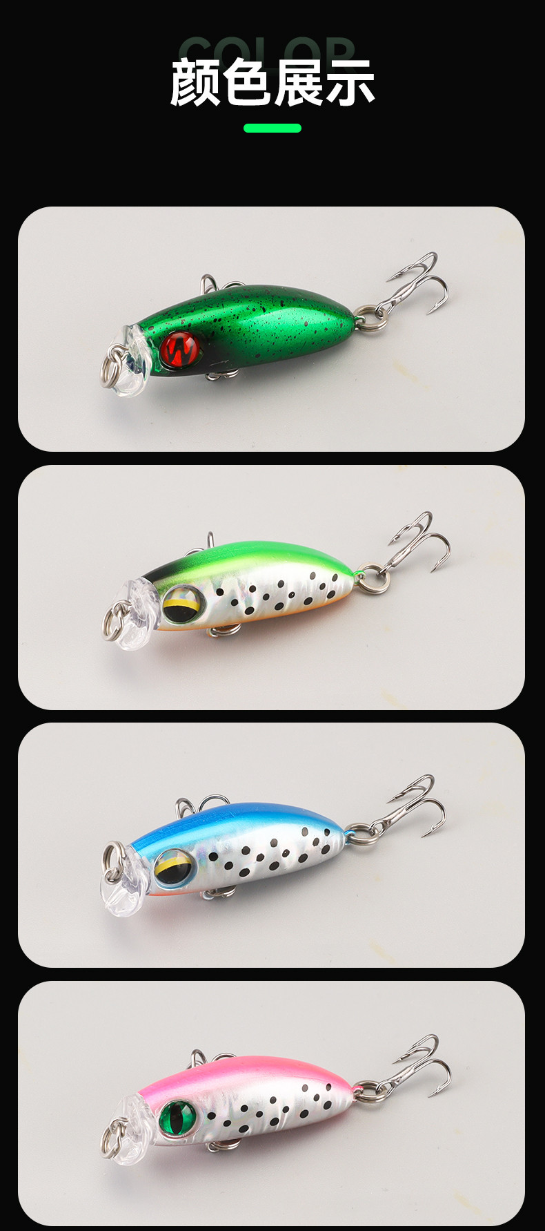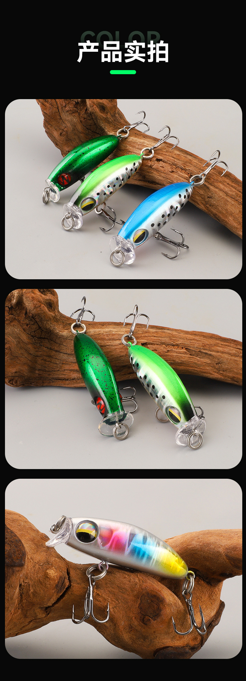 | Color | 1 verde oscuro (4,1cm2,8g), 2 puntos negros de espalda verde (4,1cm2,8g), 3 puntos negros de espalda azul (4,1cm2,8g), 4 puntos negros de espalda rosa (4,1cm2,8g), 5 puntos negros blancos (4,1cm2,8g), 6 5 colores (4,1cm2,8g), 7 escamas de oro negro (4,1cm2,8g), 8 plata brillante (4,1cm2,8g), 8 mezclas en caja |