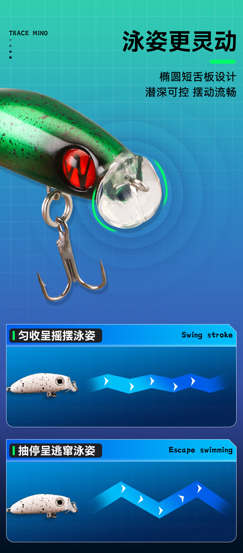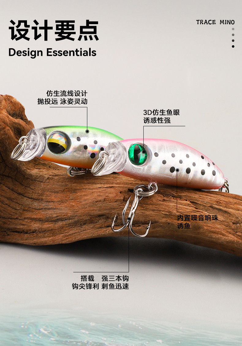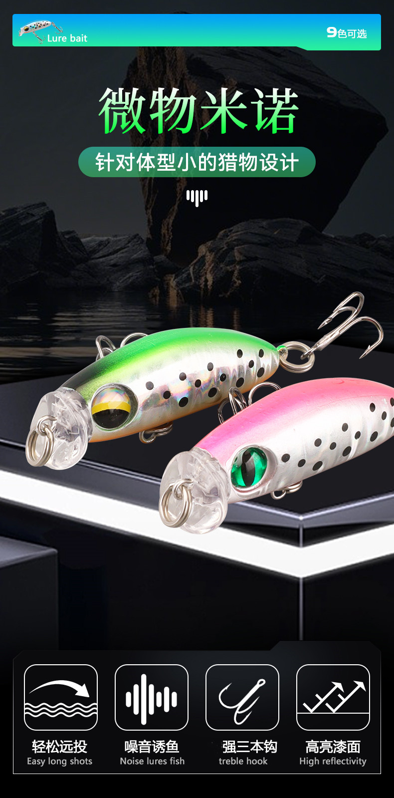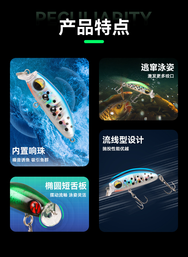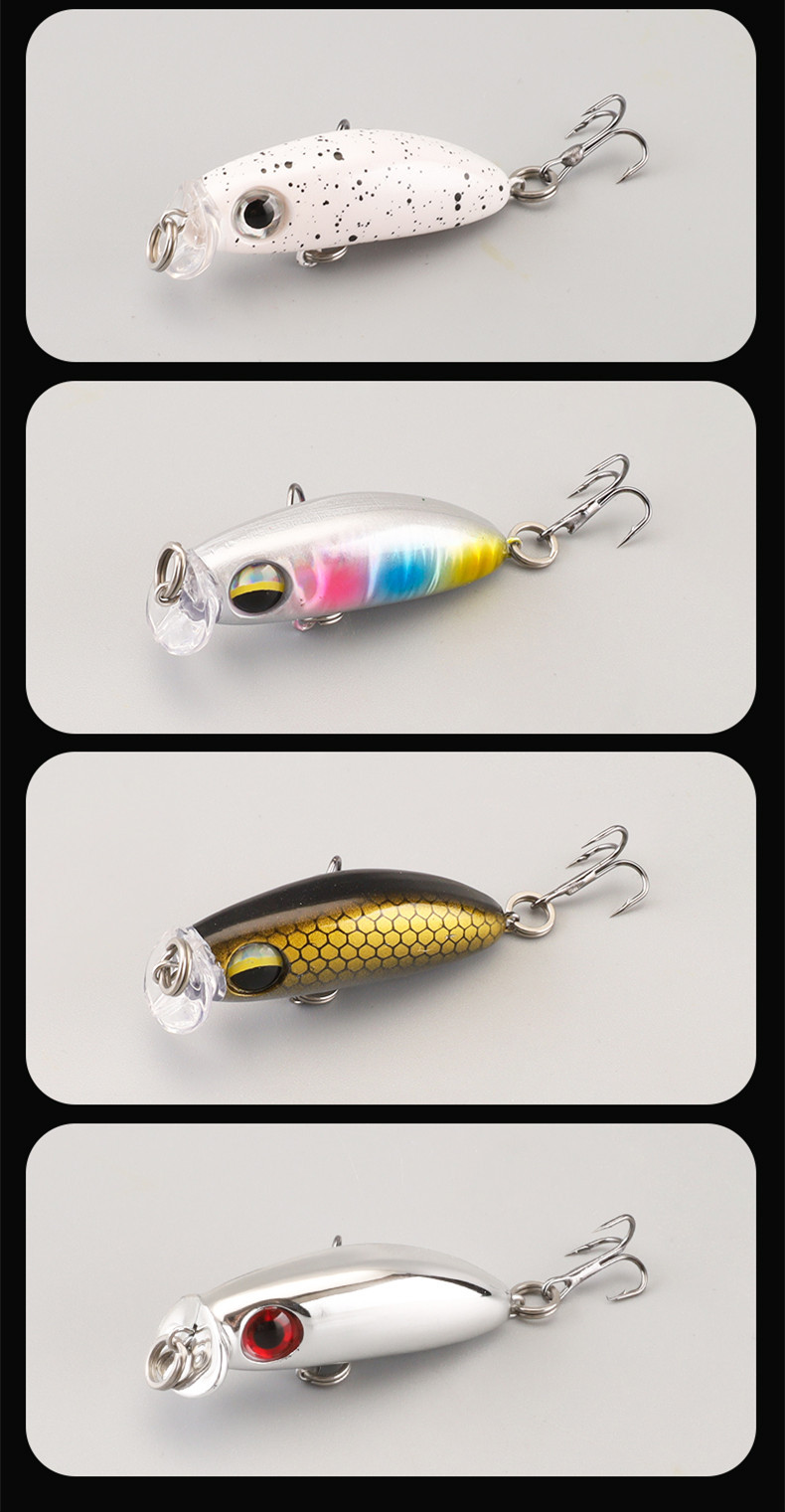 | Color | 1 verde oscuro (4,1cm2,8g), 2 puntos negros de espalda verde (4,1cm2,8g), 3 puntos negros de espalda azul (4,1cm2,8g), 4 puntos negros de espalda rosa (4,1cm2,8g), 5 puntos negros blancos (4,1cm2,8g), 6 5 colores (4,1cm2,8g), 7 escamas de oro negro (4,1cm2,8g), 8 plata brillante (4,1cm2,8g), 8 mezclas en caja |