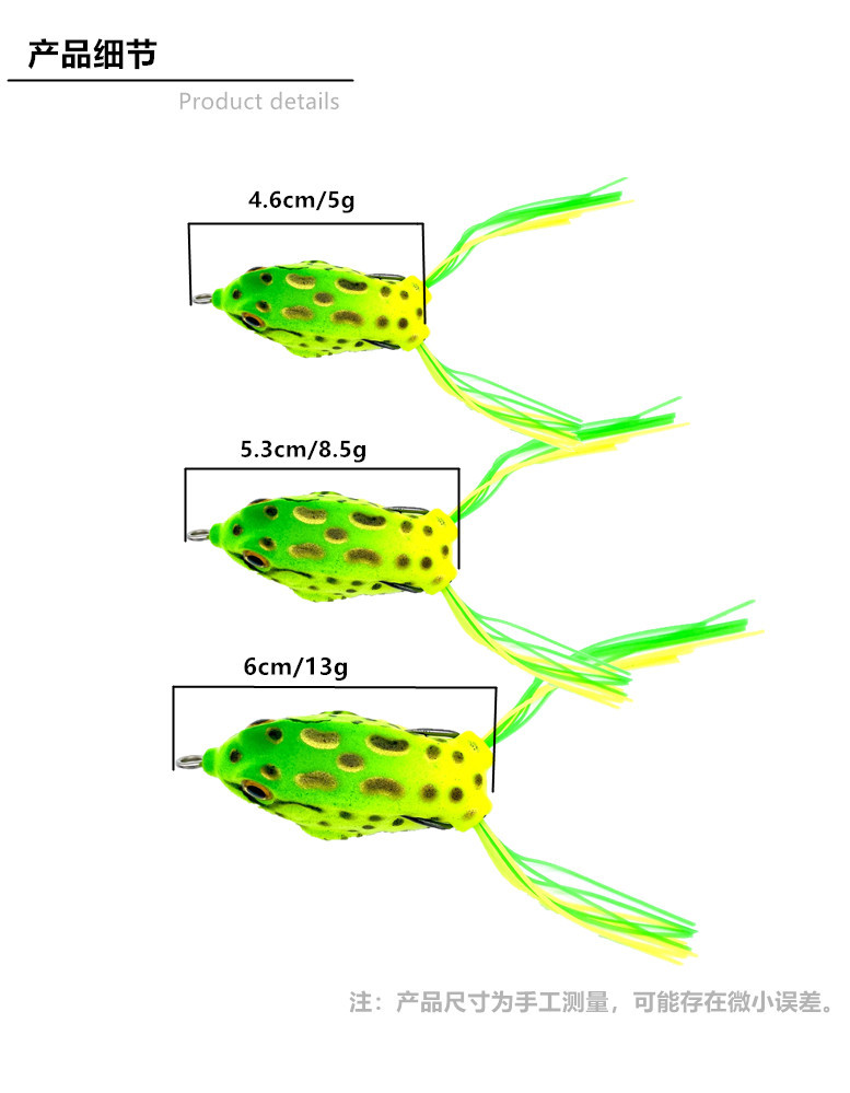 Thunder蛙 fábrica al por mayor 5g / 8g / 13g estilo clásico biónico rana flotante negro pescado luya cebo doble gancho con púas
