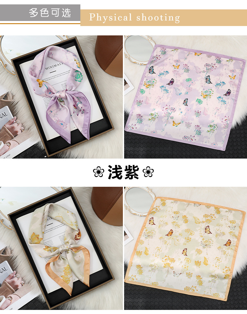 Elegante flor de loto color claro 70 bufanda de seda de satén bufanda de seda con estampado de mariposa bufanda cuadrada de color fresco de alta calidad