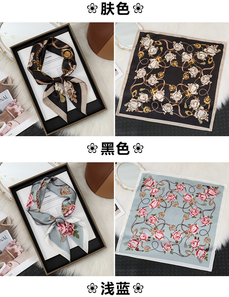 Sencillo y generoso 70 bufanda de seda de imitación, estilo floral de cadena, decoración de cuello de todo fósforo, bufanda de seda pequeña, chal de protección solar para mujer