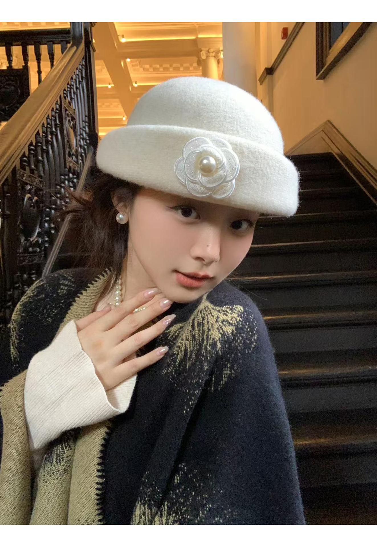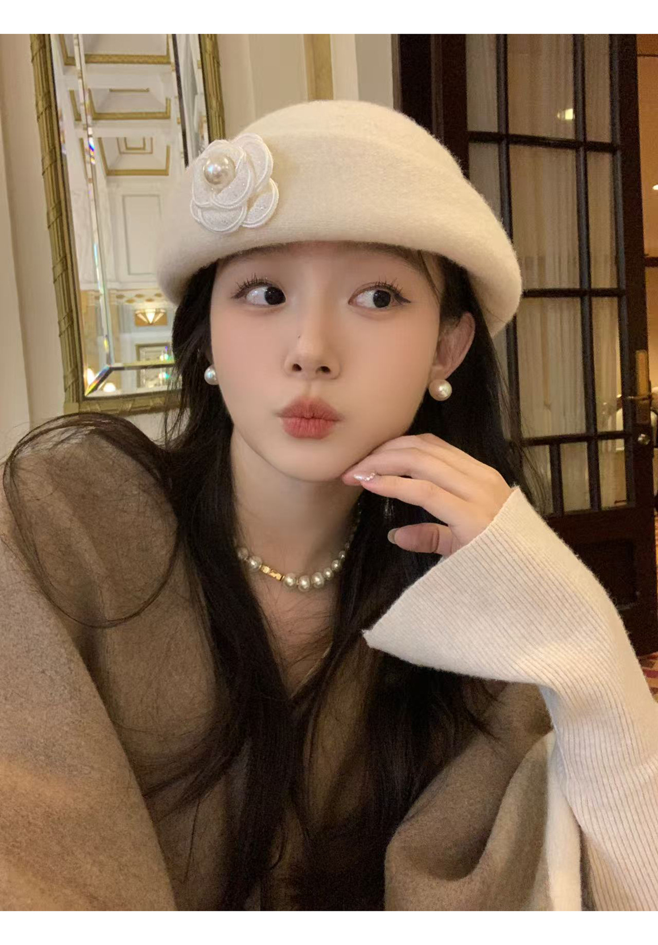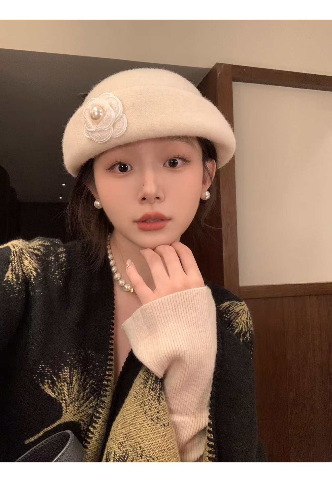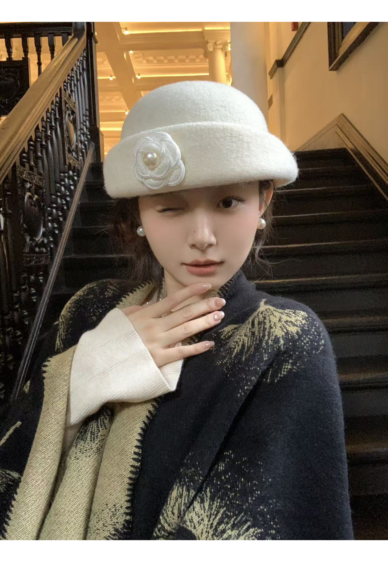 Sombrero de lana blanca francesa, mujer, otoño y invierno, estilo Hepburn, elegante sombrero de perlas, boina de mujer, cara pequeña