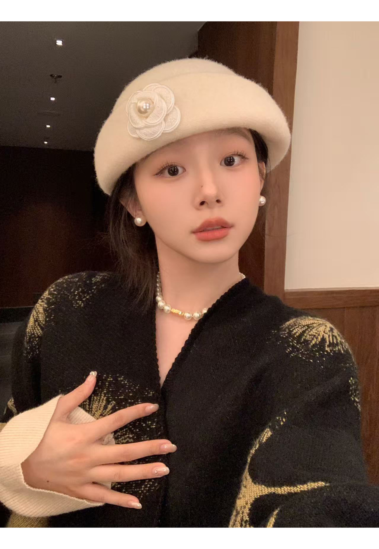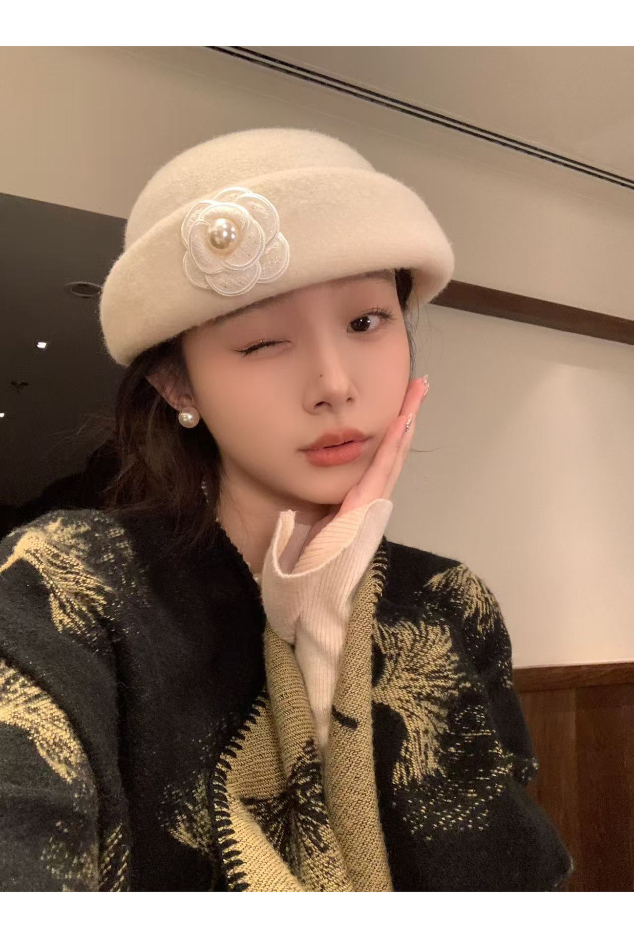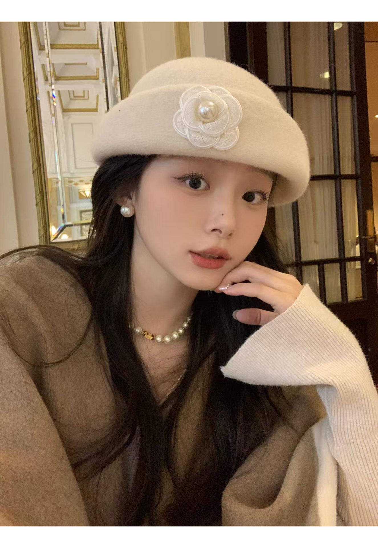 Sombrero de lana blanca francesa, mujer, otoño y invierno, estilo Hepburn, elegante sombrero de perlas, boina de mujer, cara pequeña