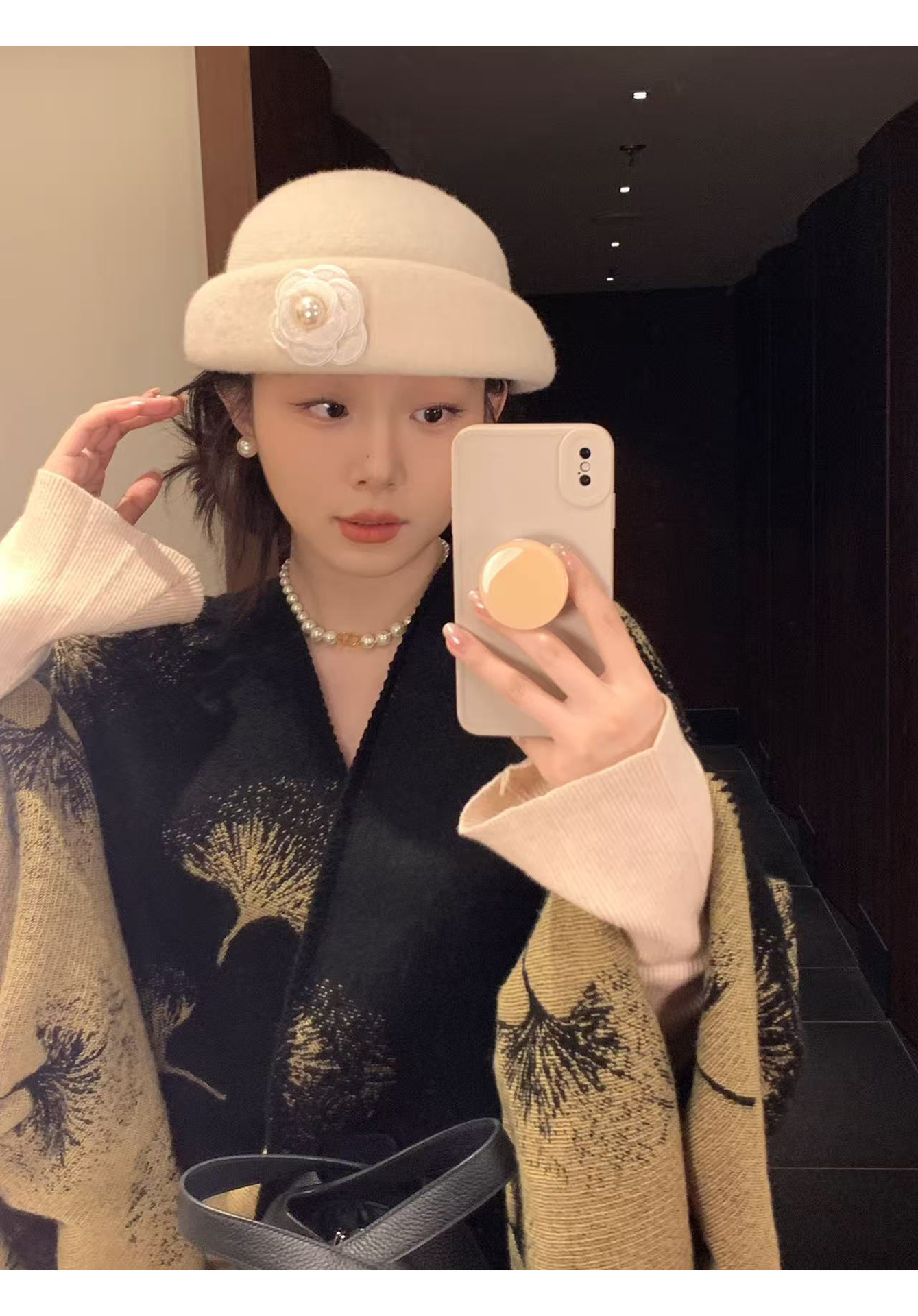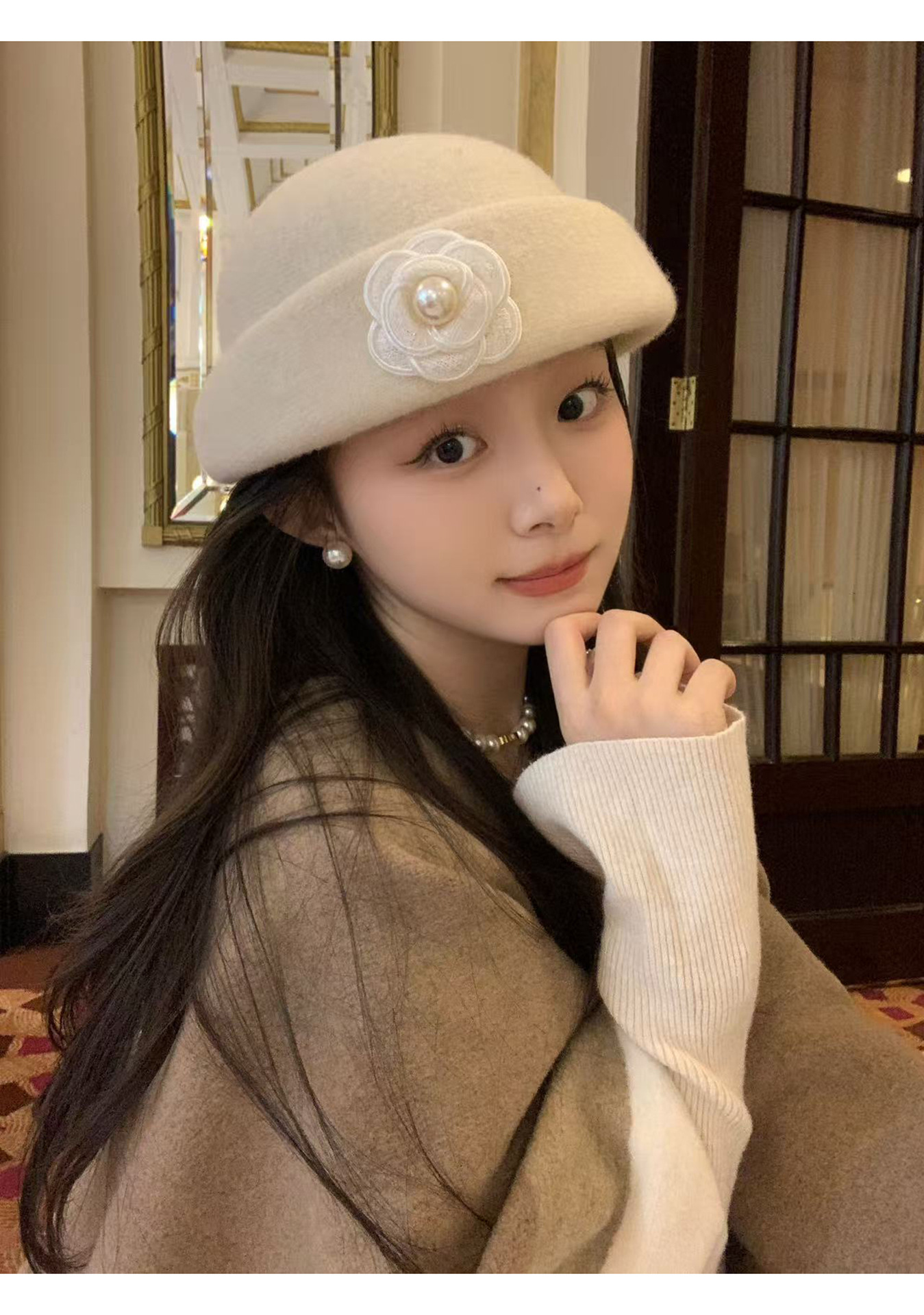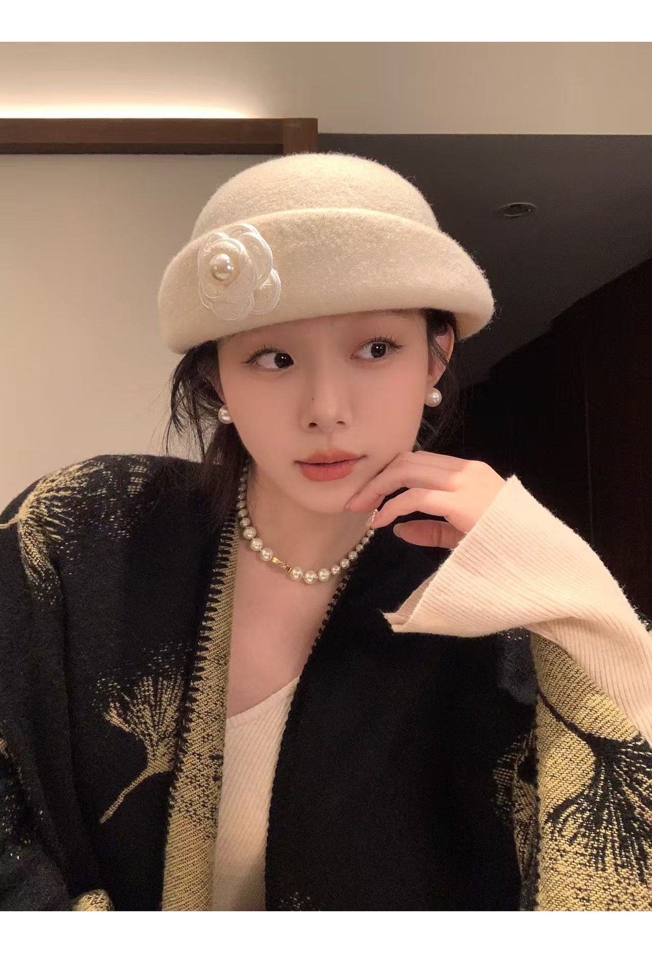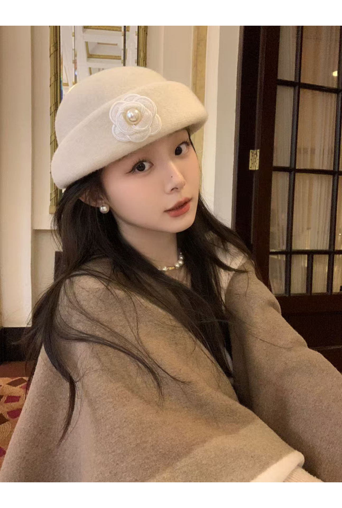 Sombrero de lana blanca francesa, mujer, otoño y invierno, estilo Hepburn, elegante sombrero de perlas, boina de mujer, cara pequeña