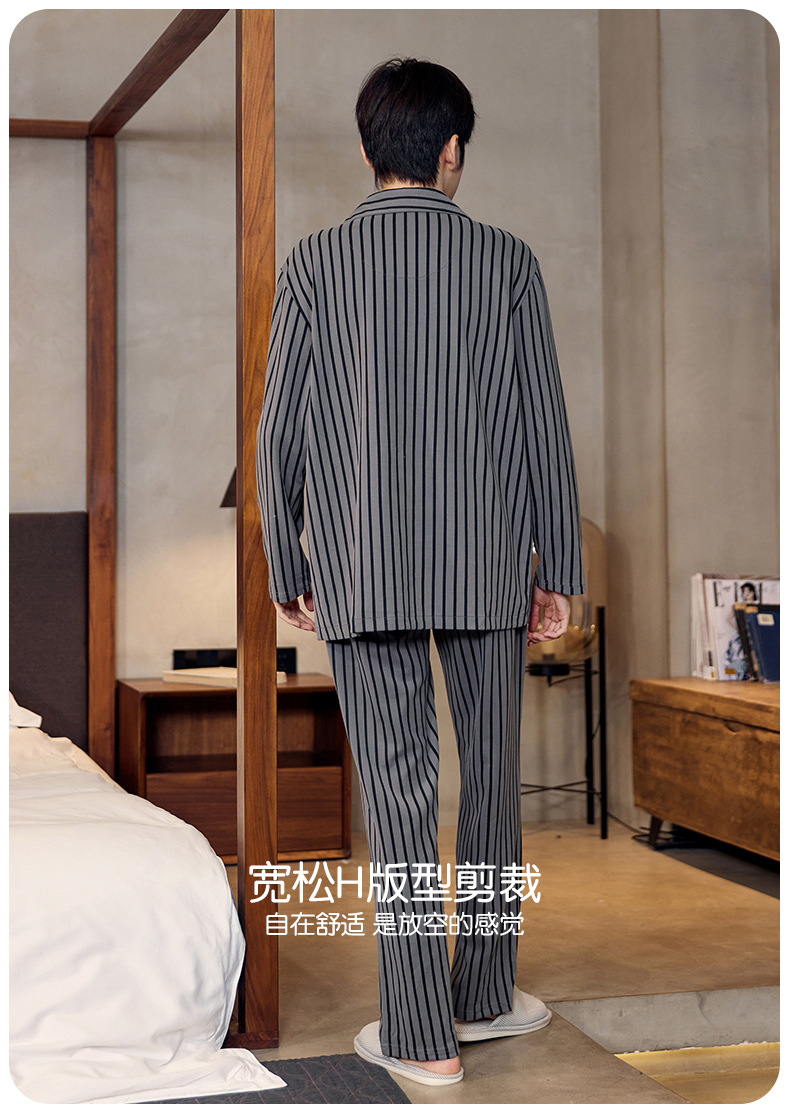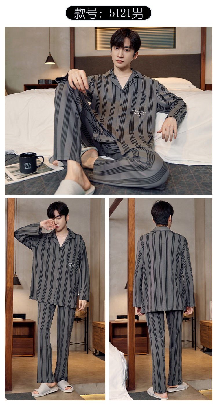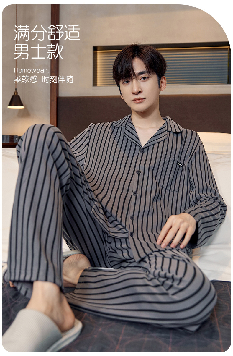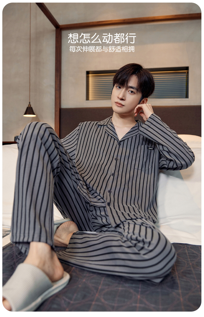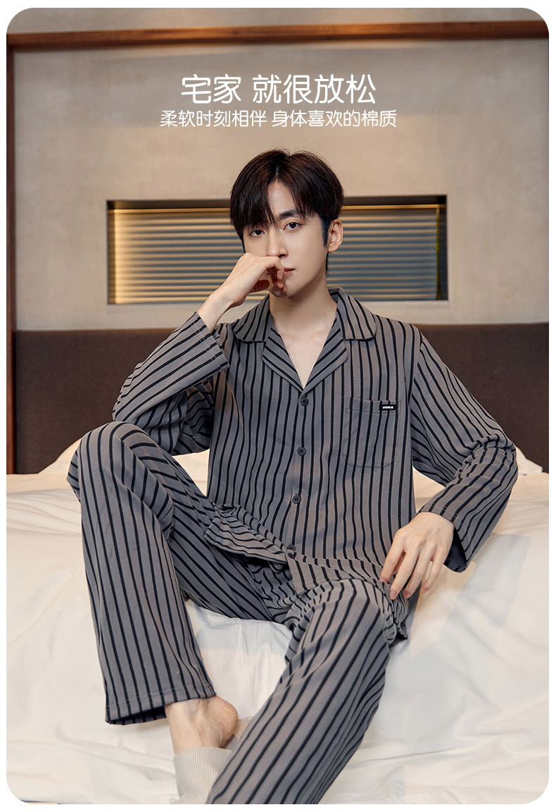 Pijamas de algodón para hombres otoño nuevos pantalones de manga larga Chaqueta de punto solapa traje de hombre casual a rayas simple ropa para el hogar