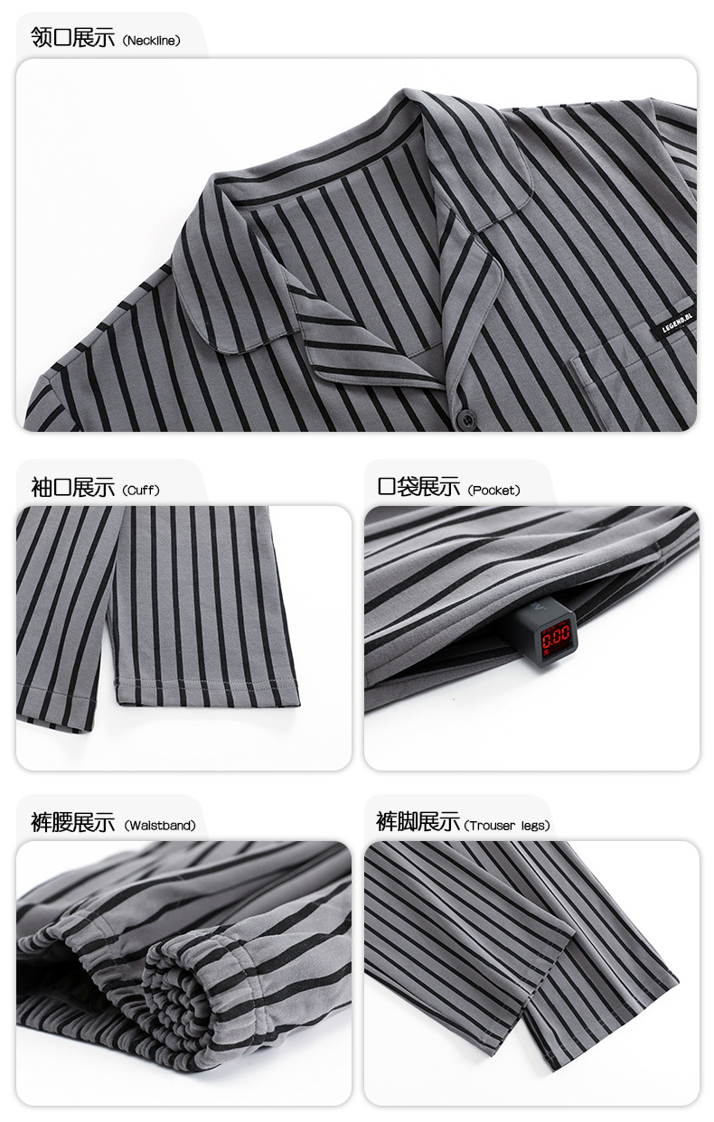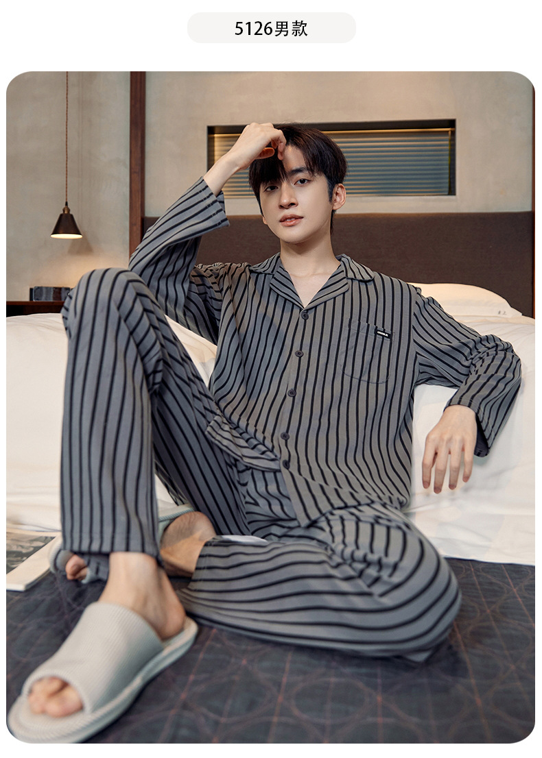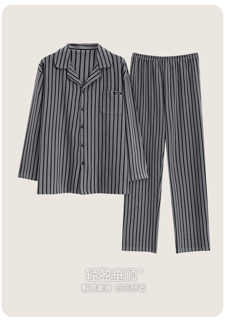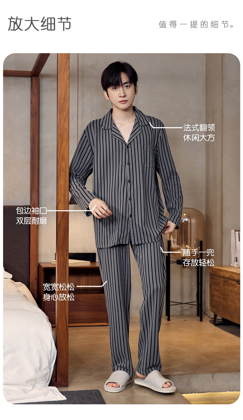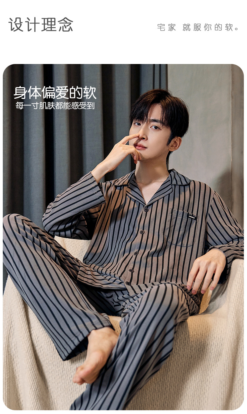 Pijamas de algodón para hombres otoño nuevos pantalones de manga larga Chaqueta de punto solapa traje de hombre casual a rayas simple ropa para el hogar